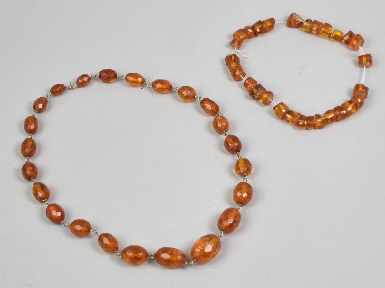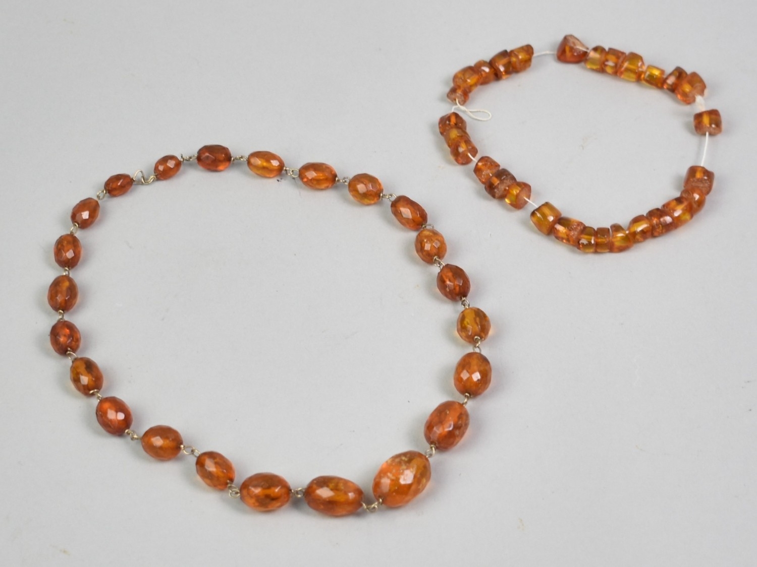An Early 20th Century Faceted Amber Necklace on a Gold Metal Chain and a Collection of Disc Shape Amber Beads for Restringing