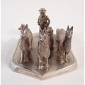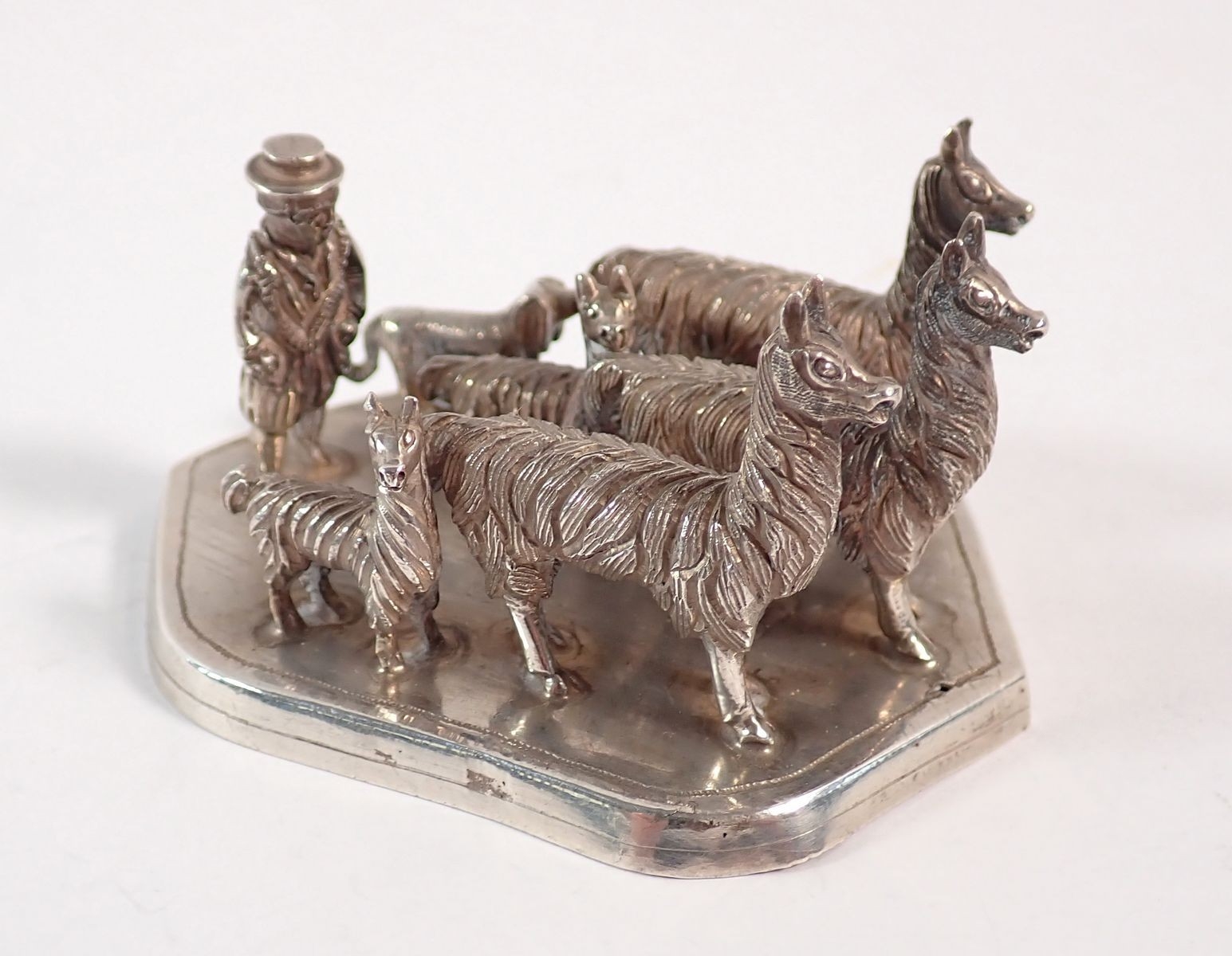A South American white metal group of llamas and dog with farmer, 7.5cm long, 140g