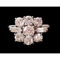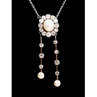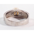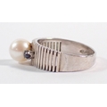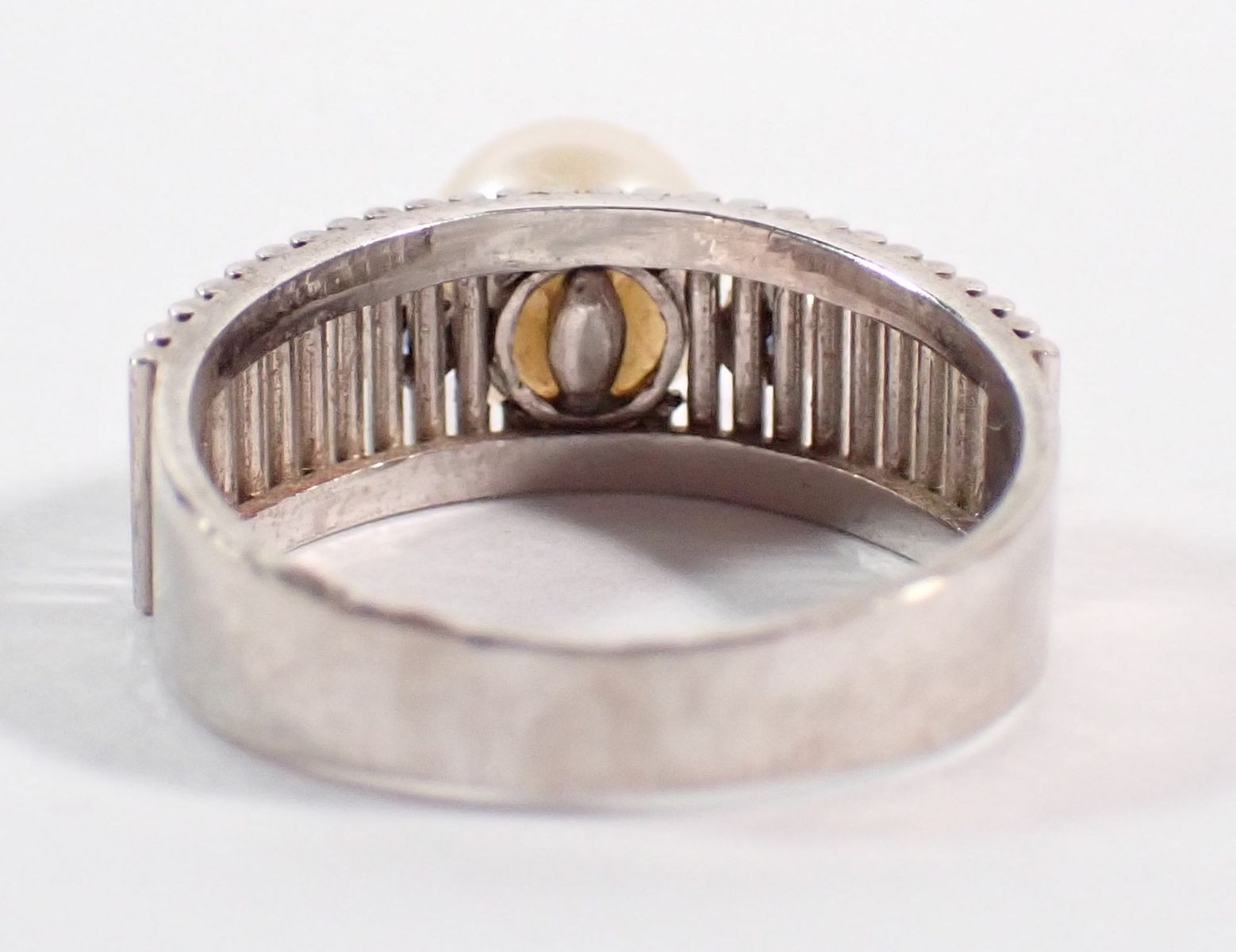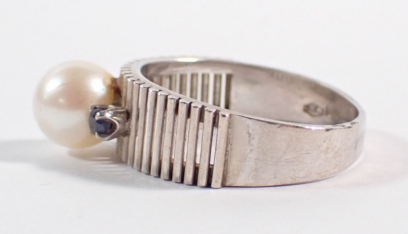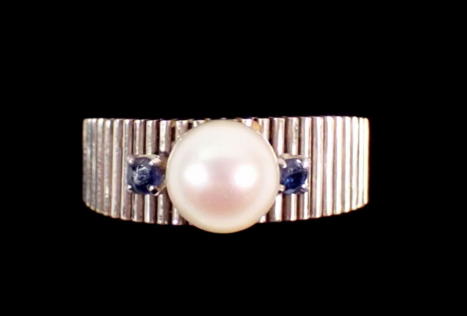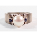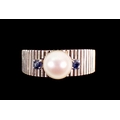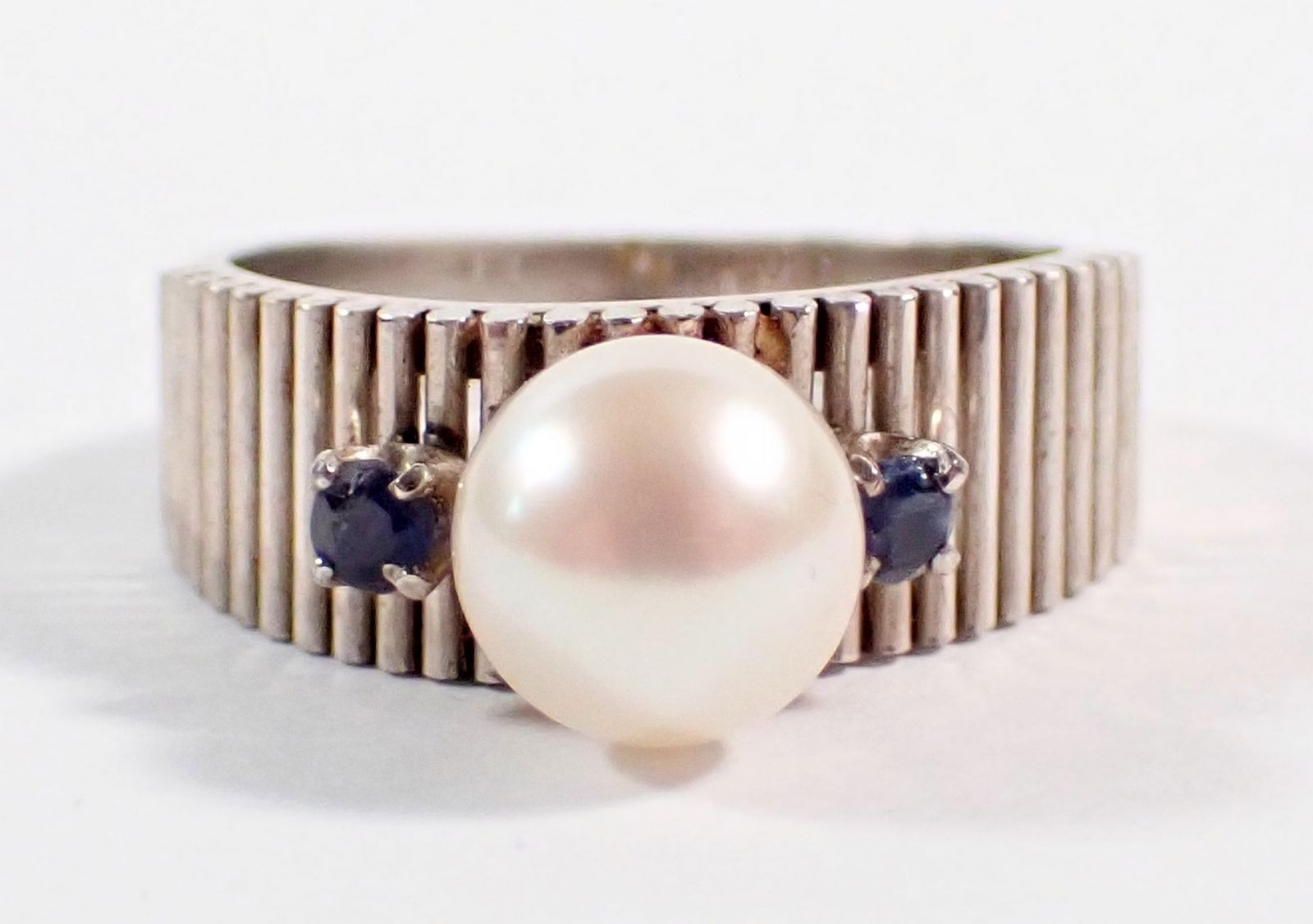 A vintage 14k white gold ring set pearl flanked by two small sapphires on reeded band, size L to M, 4g
