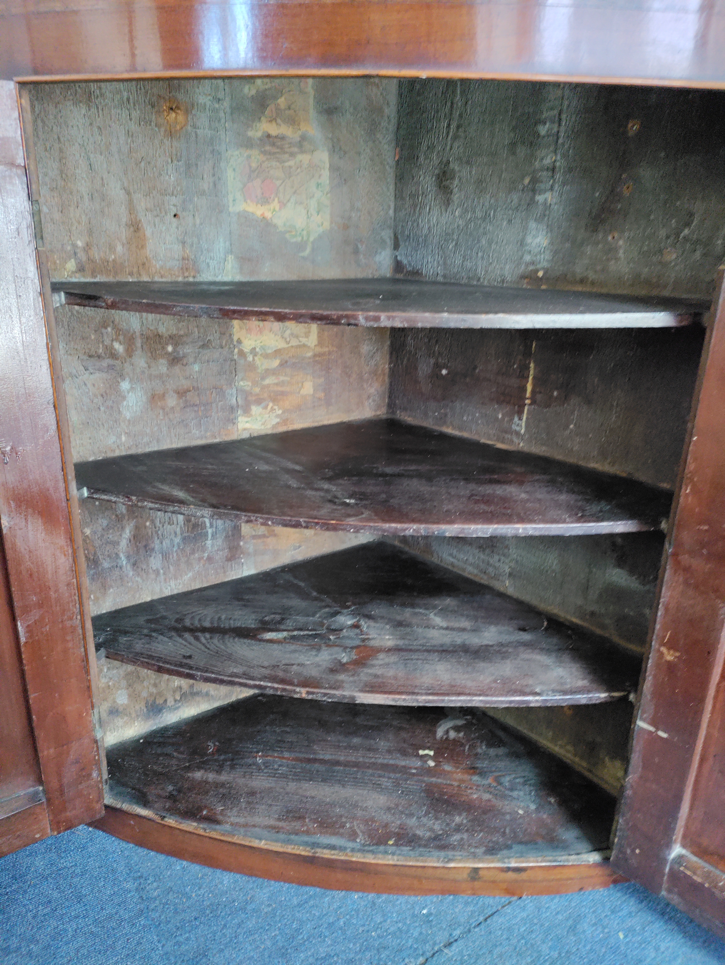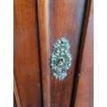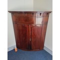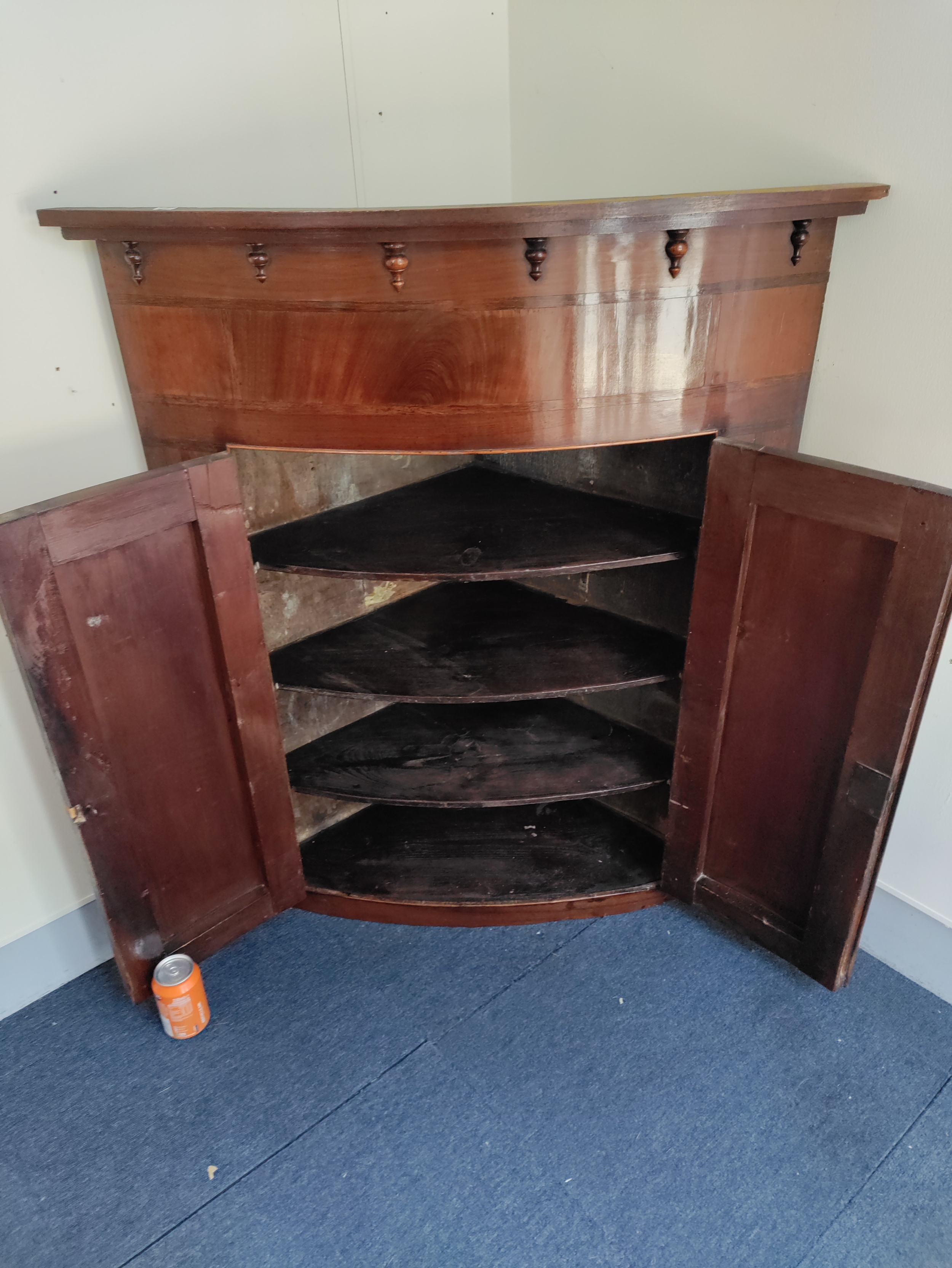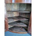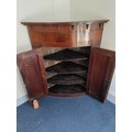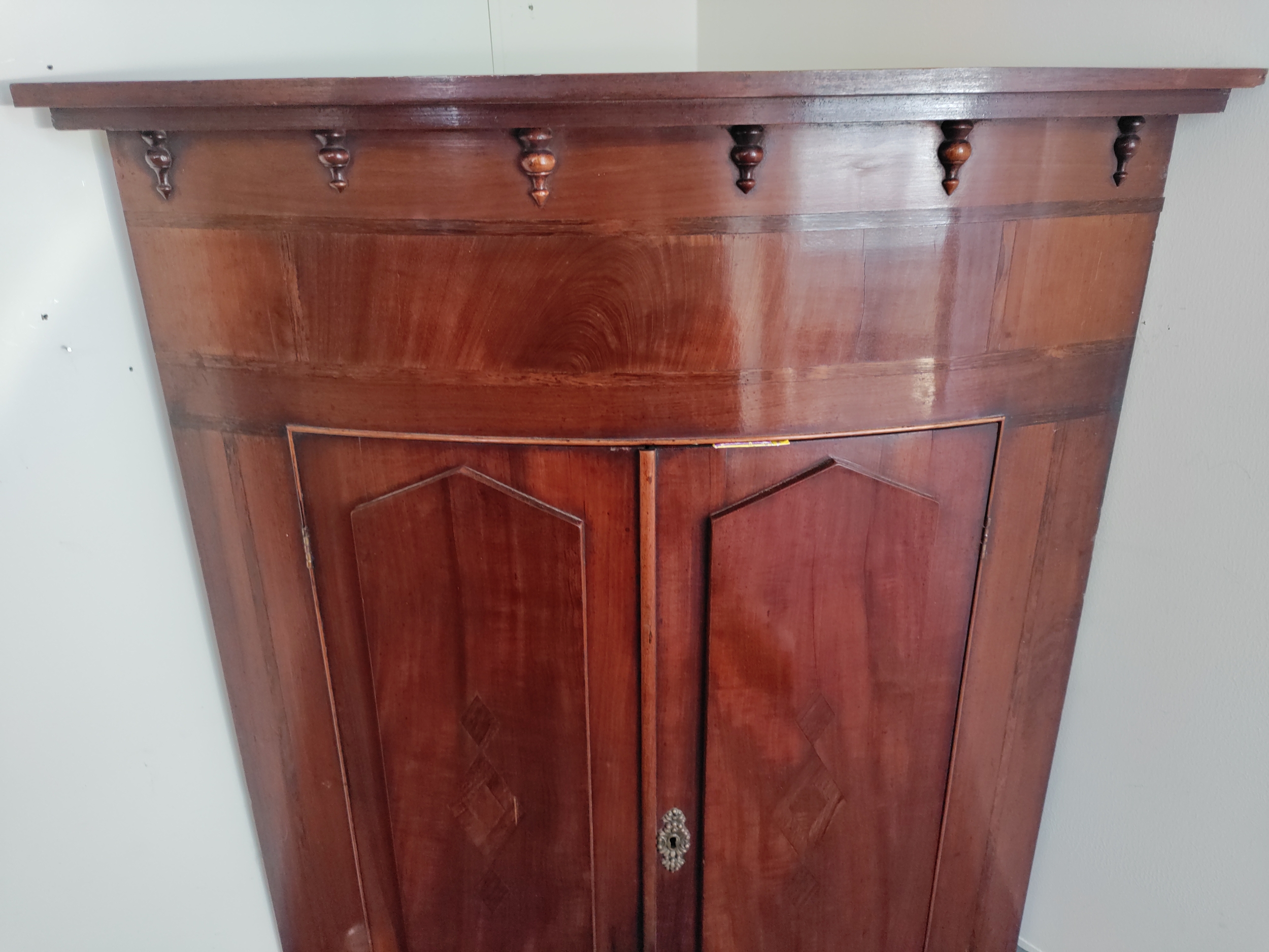 An antique Victorian corner cabinet with Inlayed doors. Comes with original key. H 107cm x W 91cm x D 50cm. Has some slight damage on the bottom right.