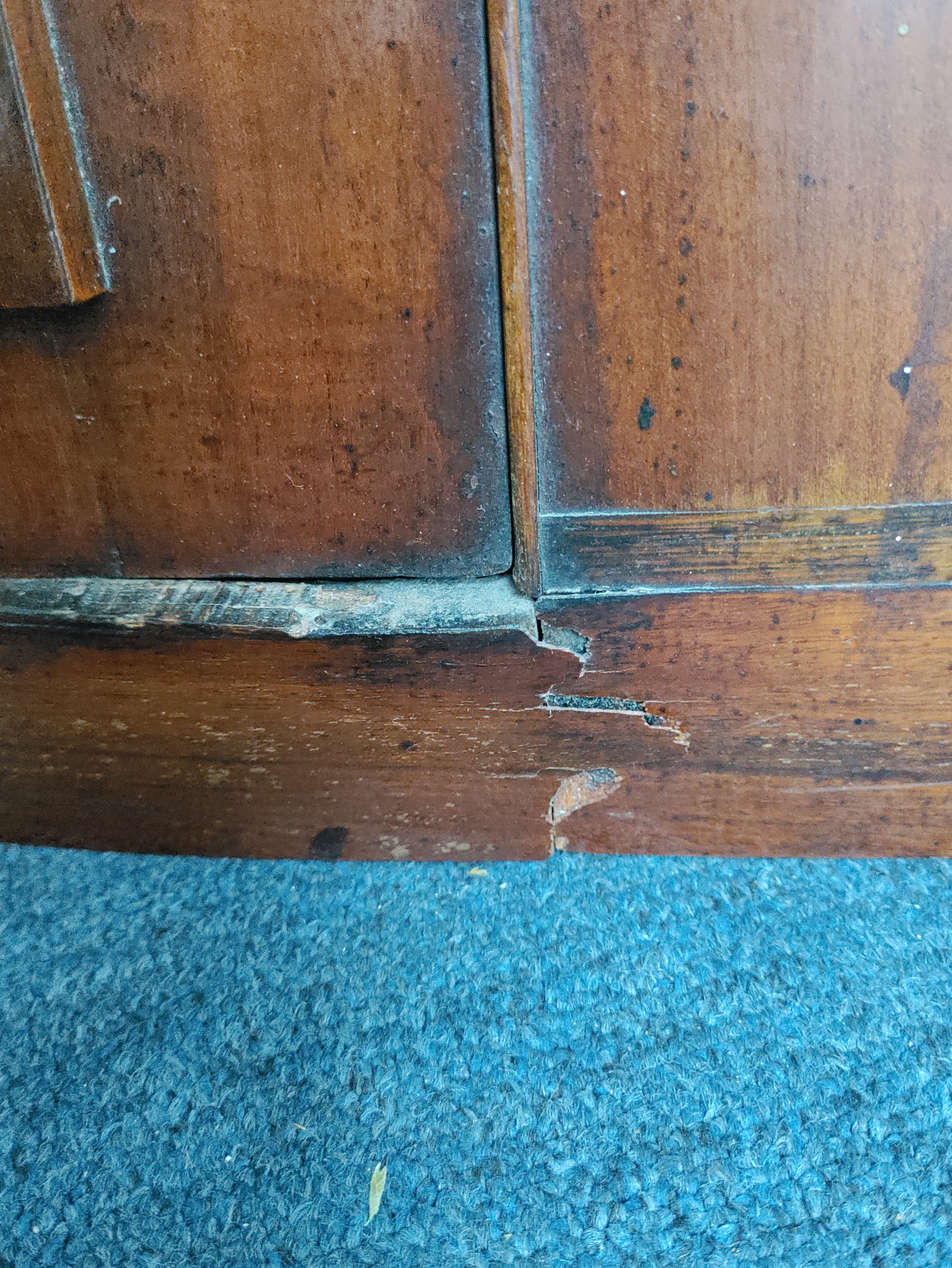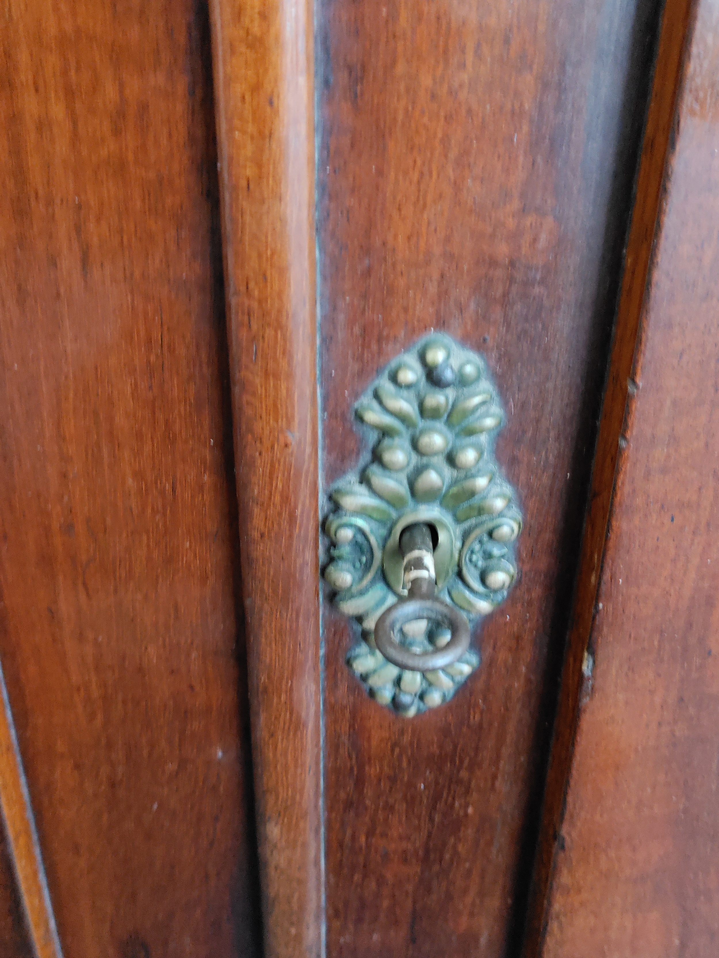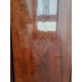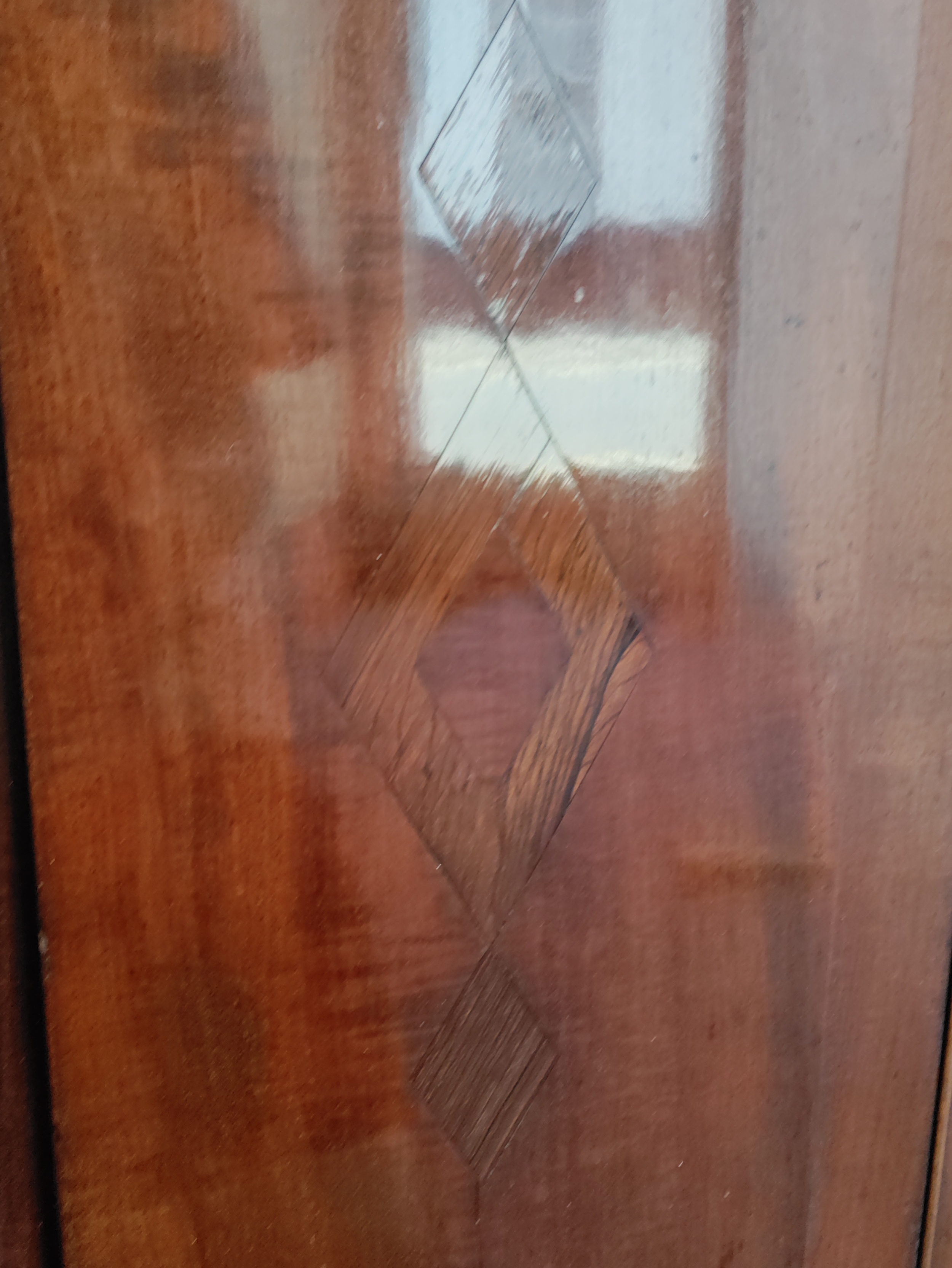 An antique Victorian corner cabinet with Inlayed doors. Comes with original key. H 107cm x W 91cm x D 50cm. Has some slight damage on the bottom right.