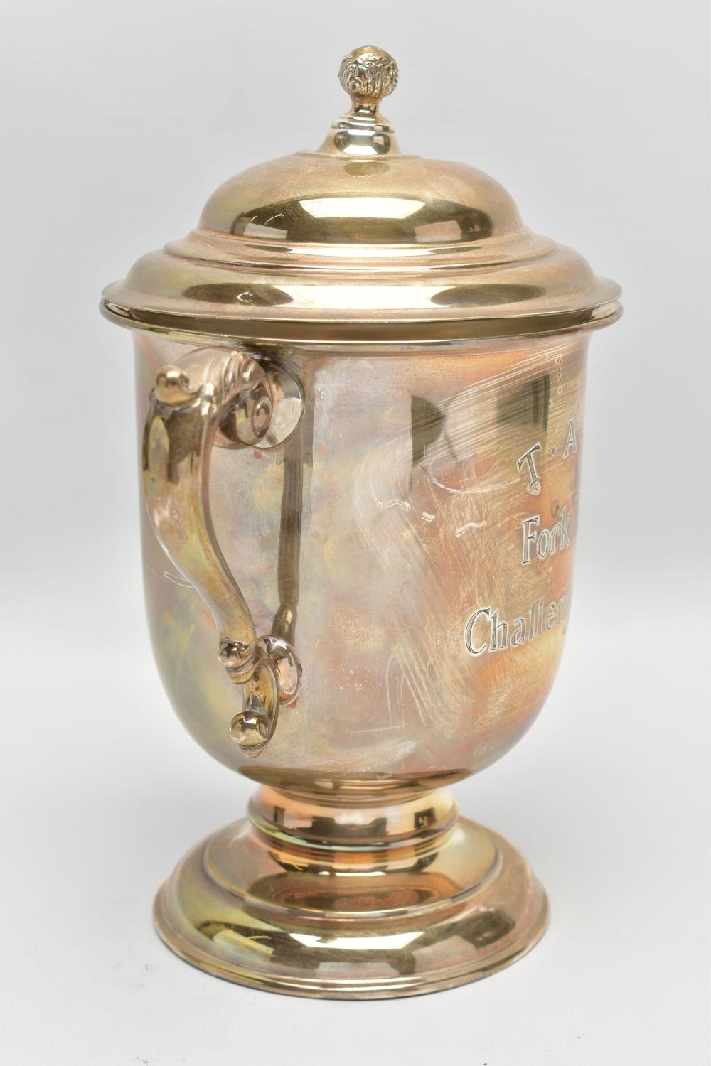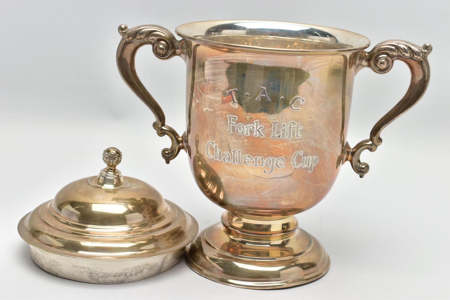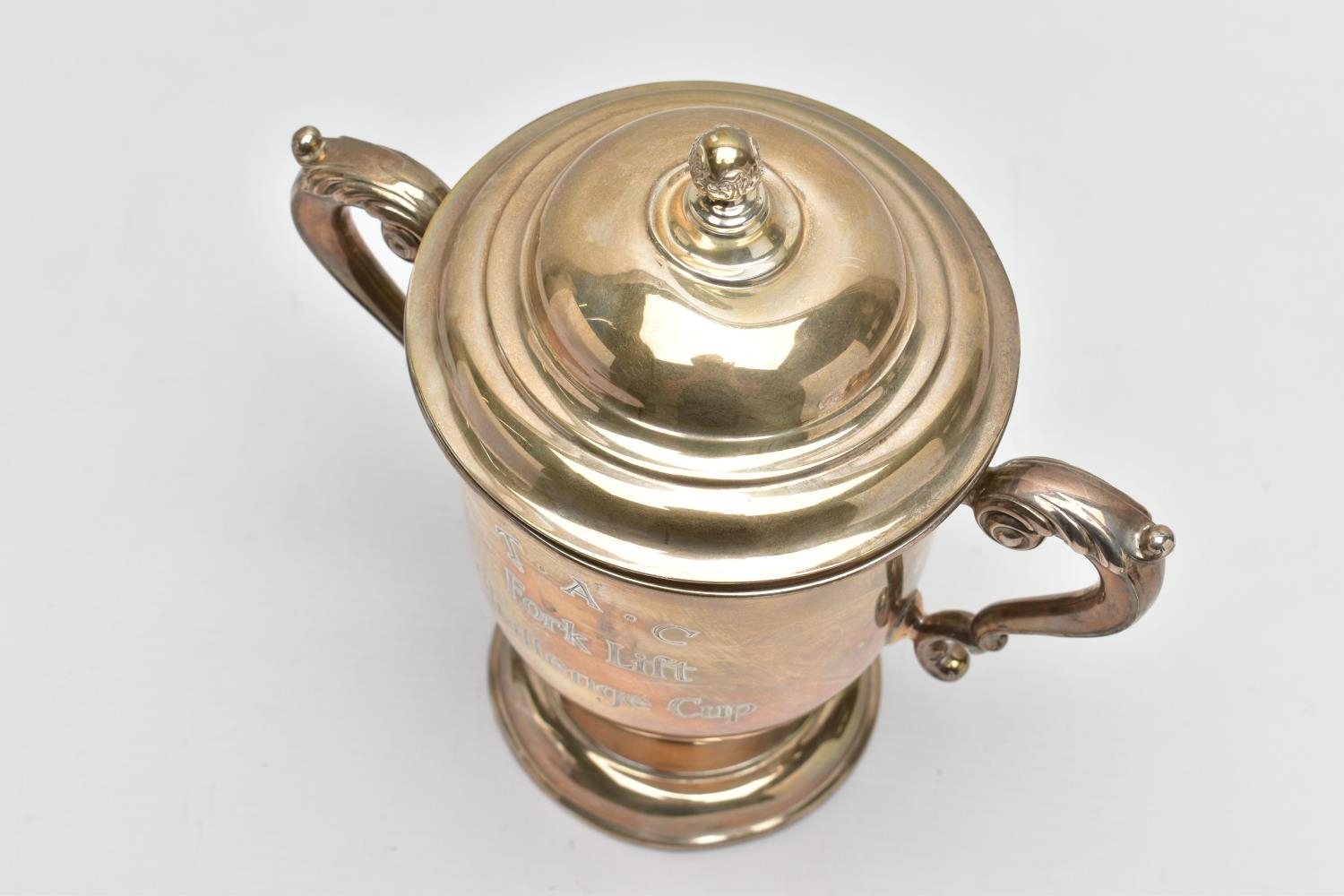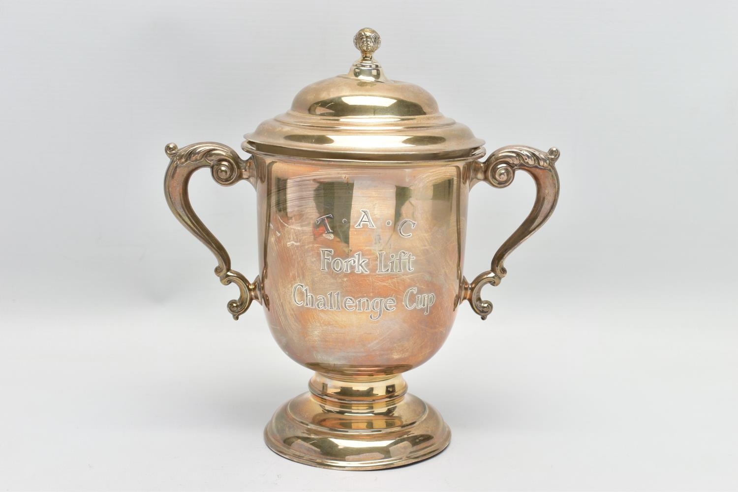 A GEORGE V SILVER TWIN HANDLED TROPHY CUP AND COVER, the pull off domed cover with foliate ball finial, S scroll handles, engraved 'T.A.C Fork Lift Challenge Cup', one presentation inscription verso ' 1977 Tamworth Works', on a stepped circular base, makers William Neale & Son Ltd, Birmingham 1926, 17.08ozt, 531.4 grams, height 23cm (Condition report: finial is bent, inner rim of lid is creased, dent towards the base of the body at the rear, foot rocks on a level surface due to misshapen foot rim)