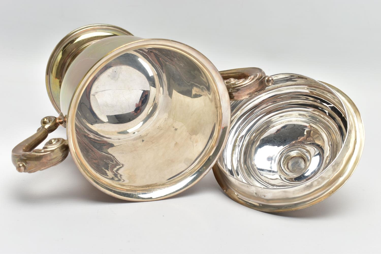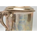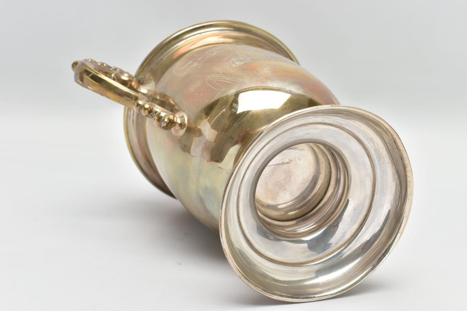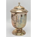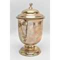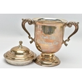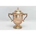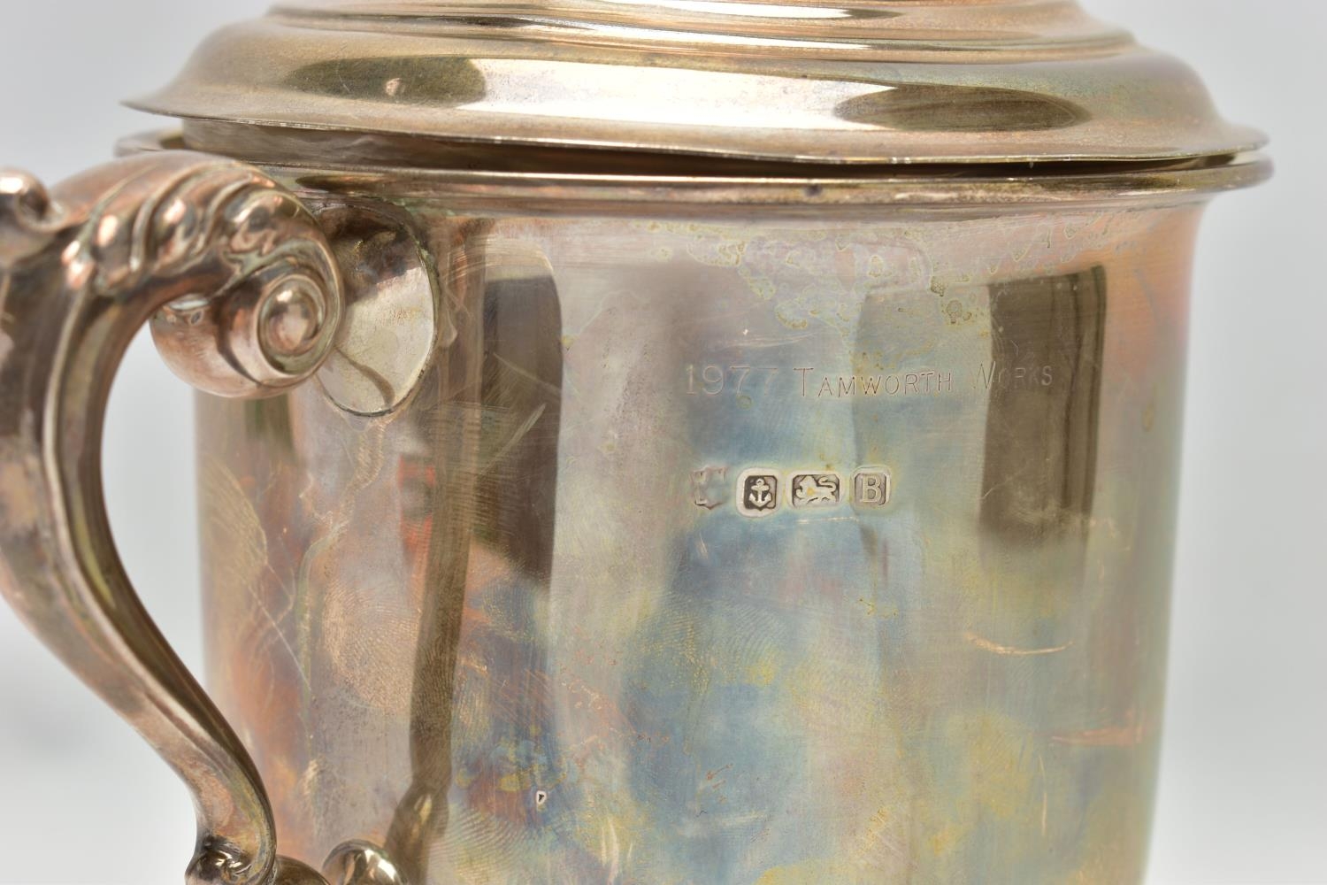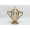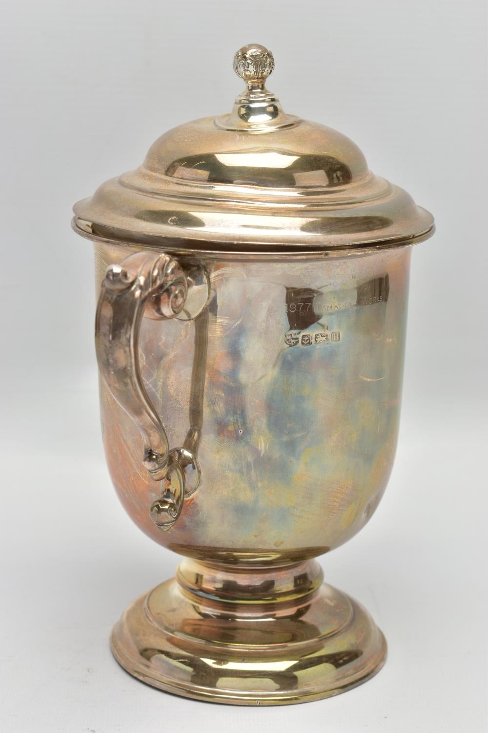 A GEORGE V SILVER TWIN HANDLED TROPHY CUP AND COVER, the pull off domed cover with foliate ball finial, S scroll handles, engraved 'T.A.C Fork Lift Challenge Cup', one presentation inscription verso ' 1977 Tamworth Works', on a stepped circular base, makers William Neale & Son Ltd, Birmingham 1926, 17.08ozt, 531.4 grams, height 23cm (Condition report: finial is bent, inner rim of lid is creased, dent towards the base of the body at the rear, foot rocks on a level surface due to misshapen foot rim)