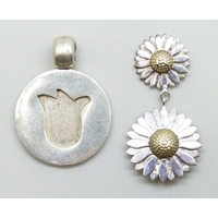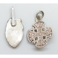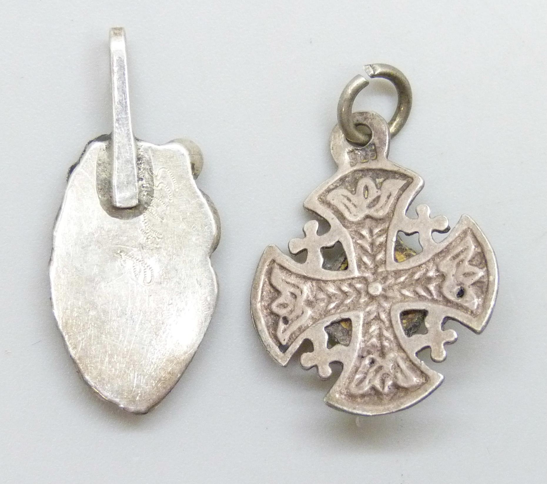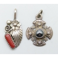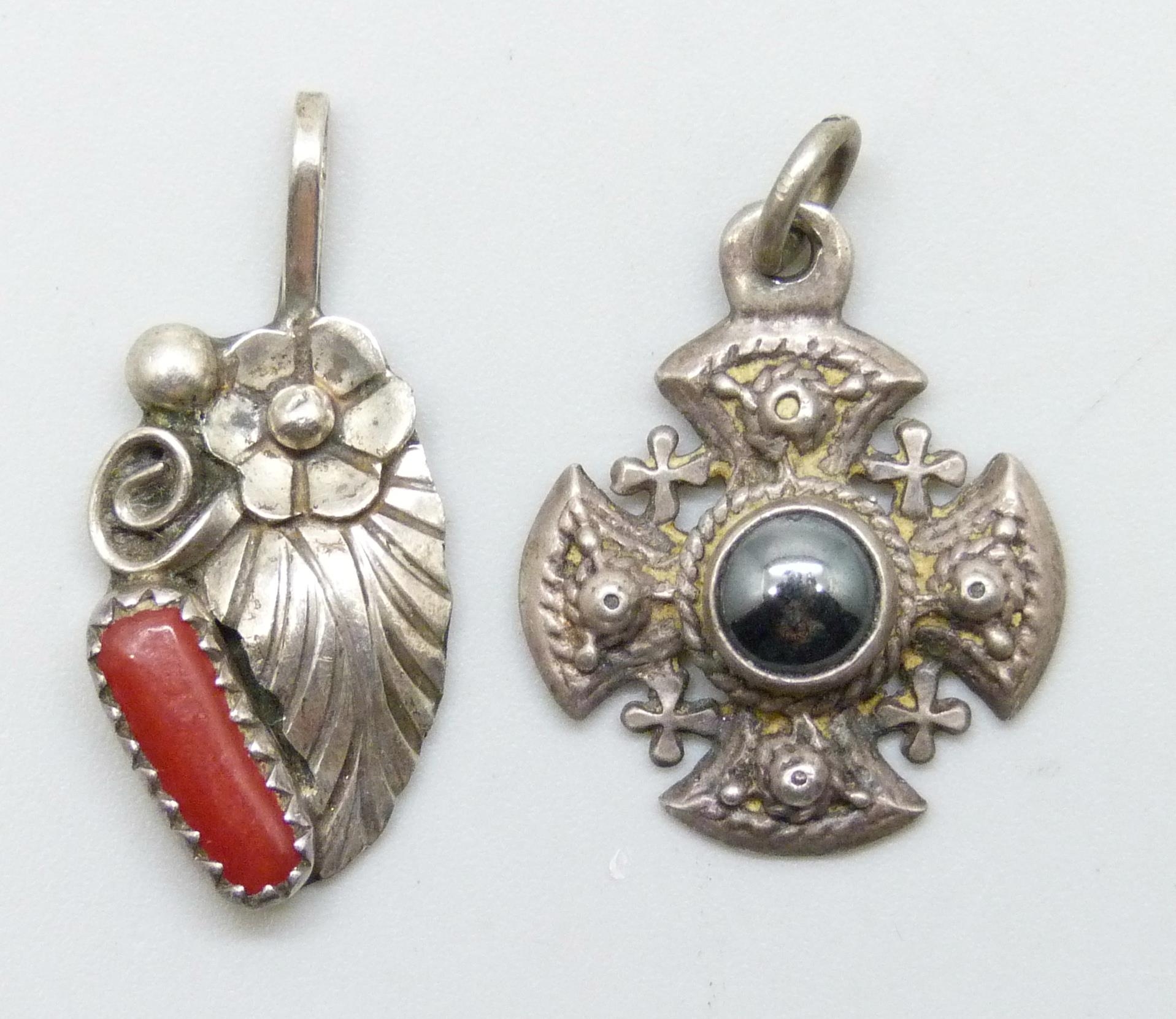 A white metal Navajo style pendant, signed verso, 2.8cm, tests as silver, and a silver cross pendant set with hematite