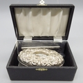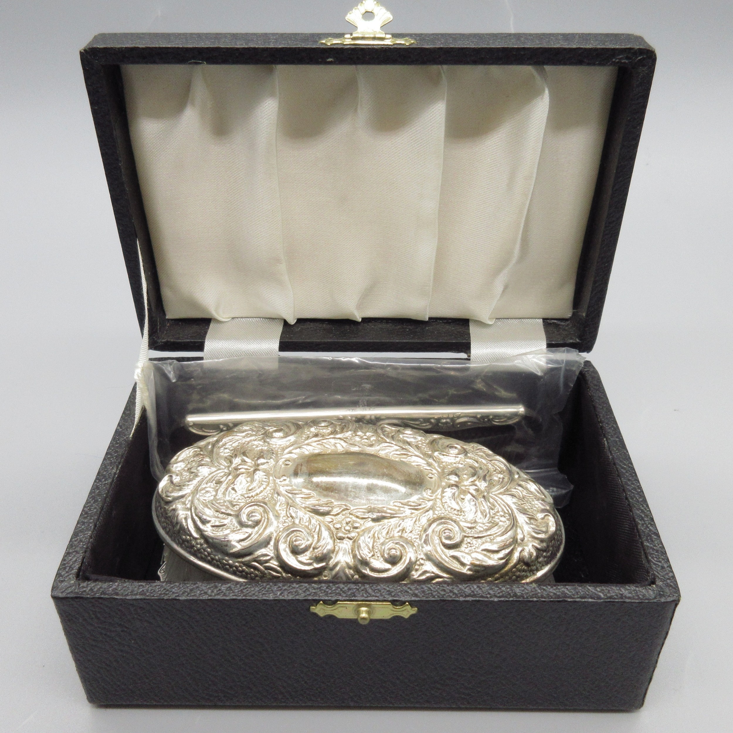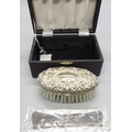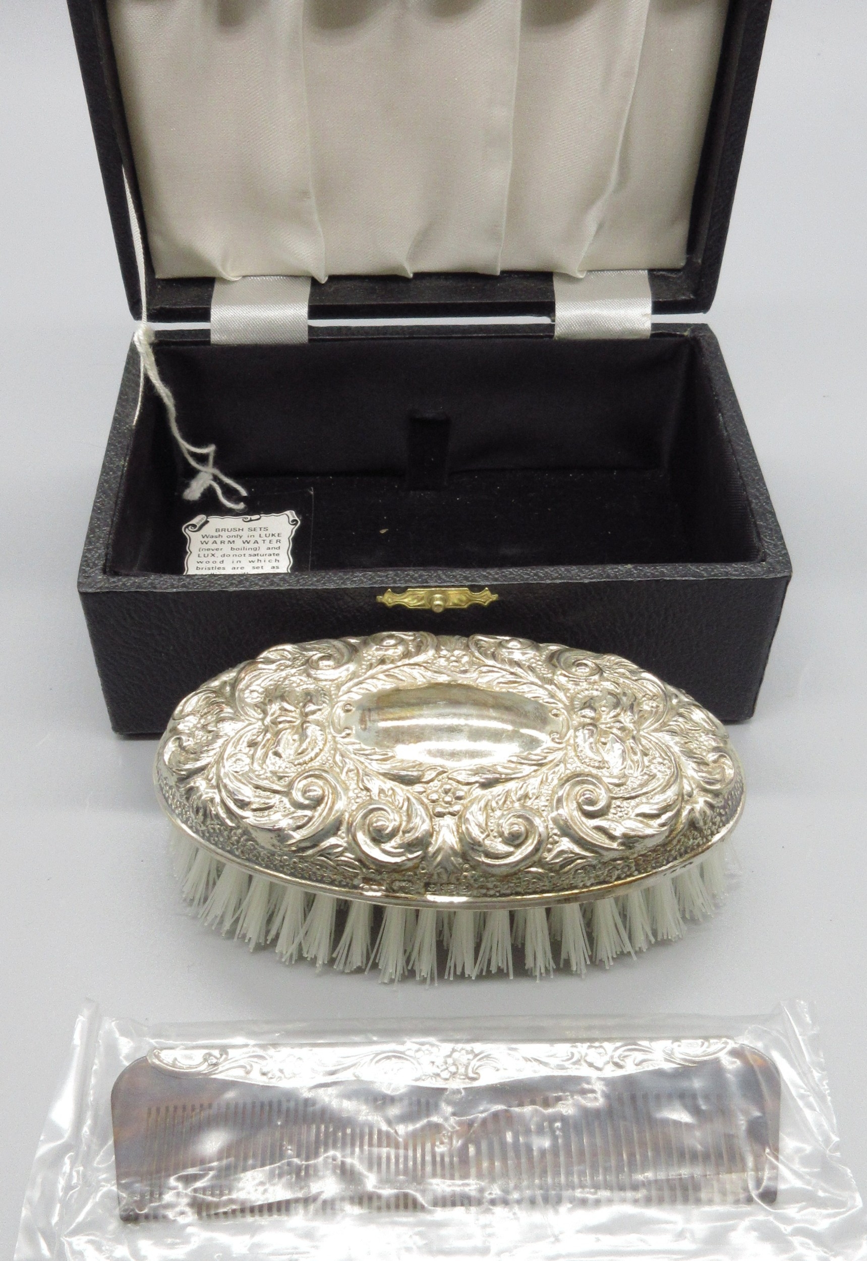 20th century silver mounted brush and comb, decorated with scrolling foliate repousse by W I Broadway & Co, Birmingham 1979, appears to be unused, comb in sealed packaging