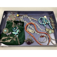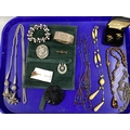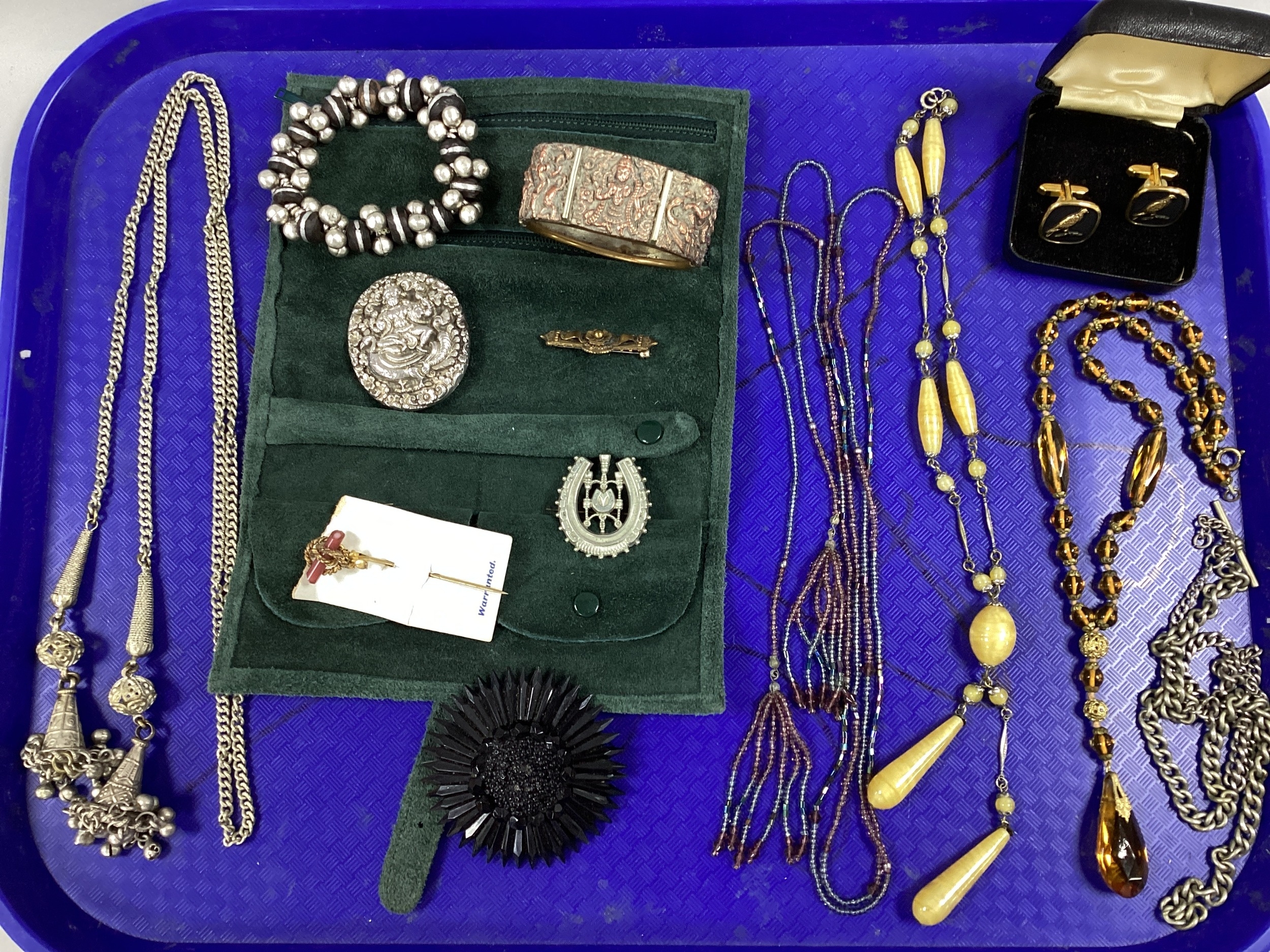 Vintage and Later Costume Jewellery, including Burmese style oval brooch, detailed in relief, a similar style hinged bangle, a Victorian style bar brooch, lariat style necklaces, RSPB cufflinks etc.
