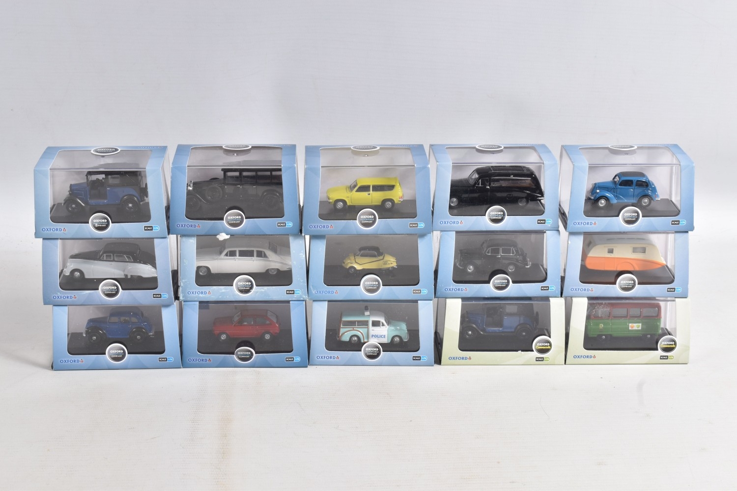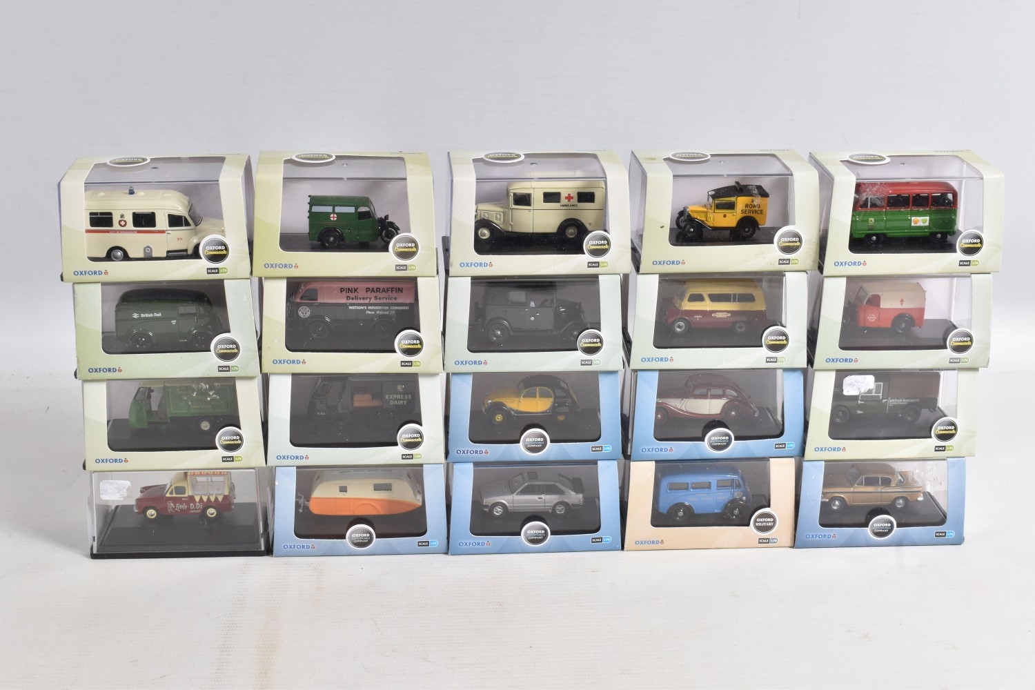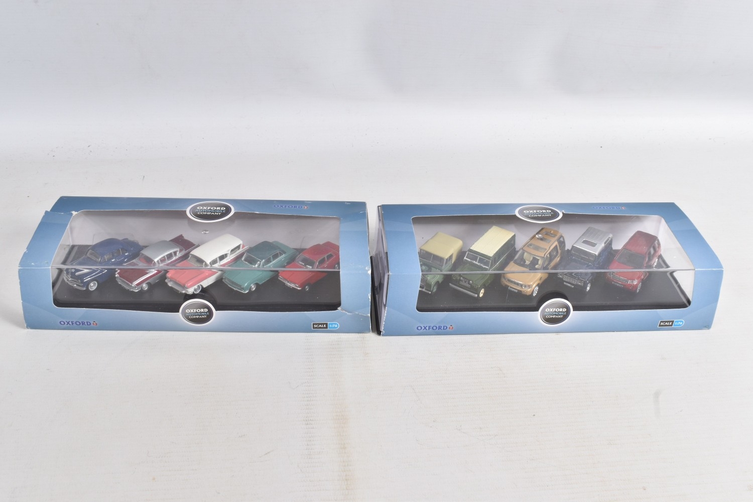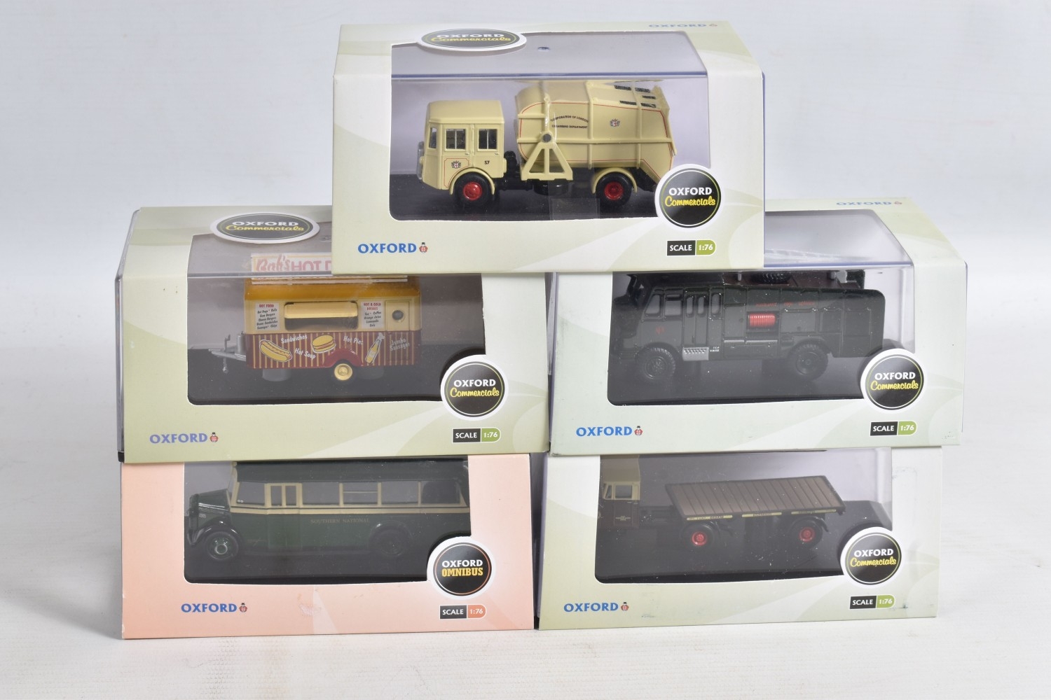 A COLLECTION OF BOXED 1:76 SCALE OXFORD DIECAST MODEL VEHICLES, to include an Original AFS Green Goddess no. 76GG001, a Southern National Bedford OWB no. 76OWB004, a 'Bob's Hot Dogs' Mobile Trailer no. 76TR001, a Strato Silver Ford Escort XR3i no. 76XR001, a BSA Motorcycle and Sidecar no. 76BSA001, a Charleston Yellow Black Citroen 2CV no. 76CT002, a Di Mascios no. 76ANG039, a 5 piece Vauxhall set with a Wyvern, Cresta, FB, Friary and a Viva no. 76SET30 along with another 5 piece Land Rover set I, II, Defender, Disco and a Freelander no. 76SET32 to name a few out of this nice collection, although not checked for completeness, the packaging is in good condition and appears to have not been opened