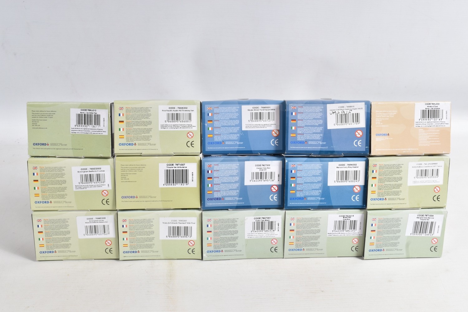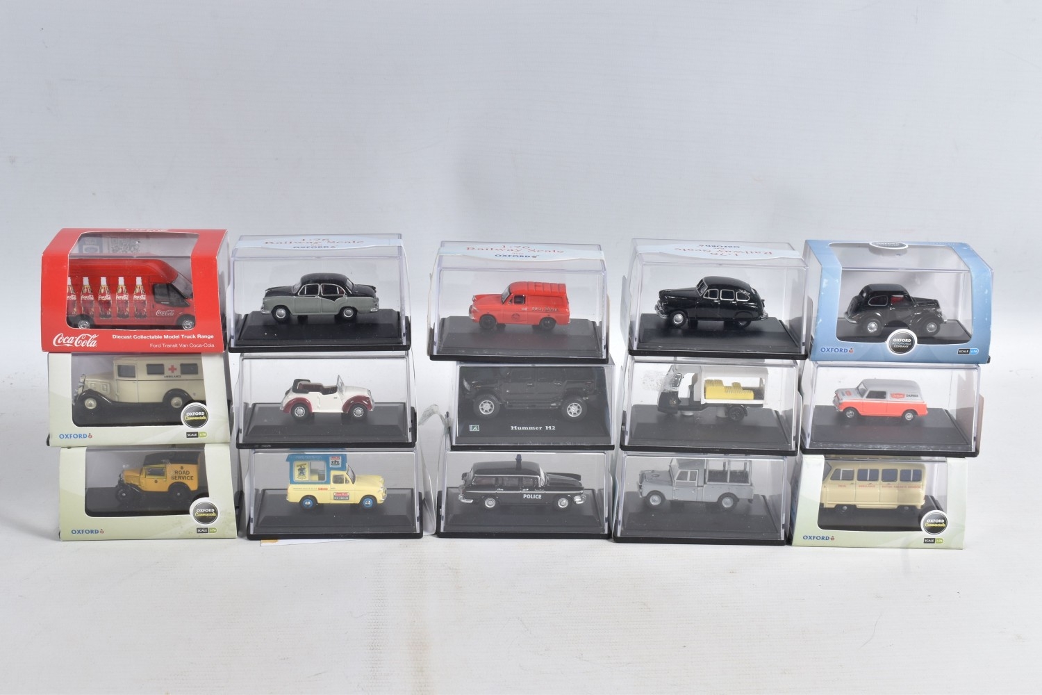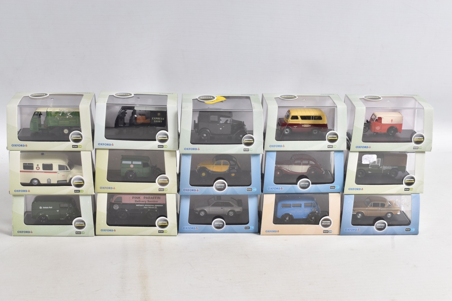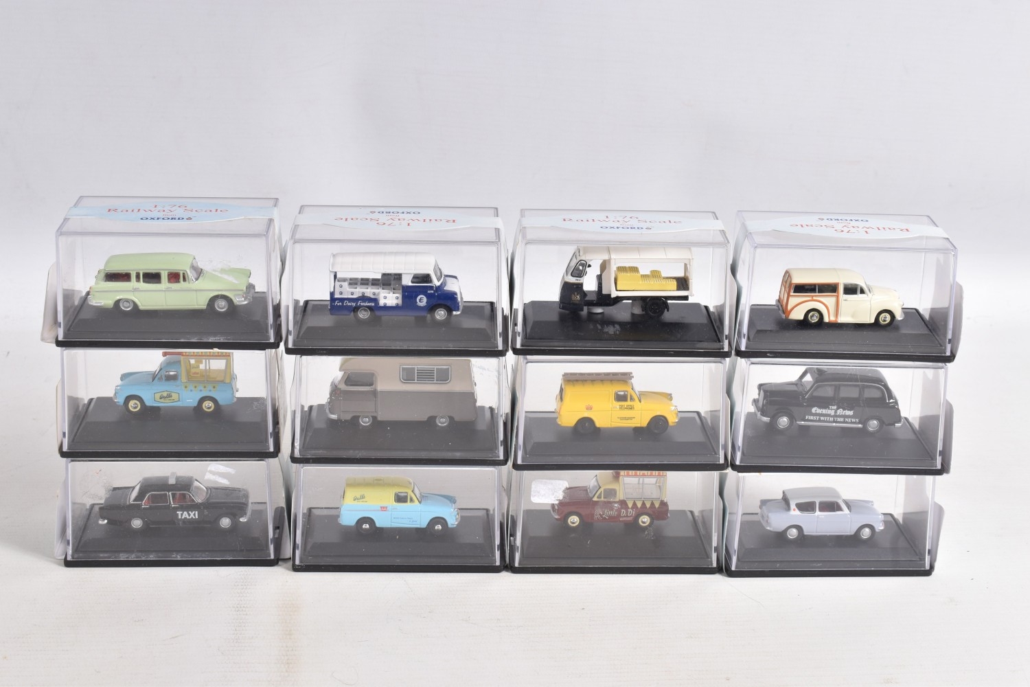 A COLLECTION OF BOXED 1:76 SCALE OXFORD DIECAST MODEL VEHICLES, to include an Original AFS Green Goddess no. 76GG001, a Southern National Bedford OWB no. 76OWB004, a 'Bob's Hot Dogs' Mobile Trailer no. 76TR001, a Strato Silver Ford Escort XR3i no. 76XR001, a BSA Motorcycle and Sidecar no. 76BSA001, a Charleston Yellow Black Citroen 2CV no. 76CT002, a Di Mascios no. 76ANG039, a 5 piece Vauxhall set with a Wyvern, Cresta, FB, Friary and a Viva no. 76SET30 along with another 5 piece Land Rover set I, II, Defender, Disco and a Freelander no. 76SET32 to name a few out of this nice collection, although not checked for completeness, the packaging is in good condition and appears to have not been opened