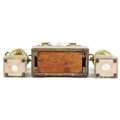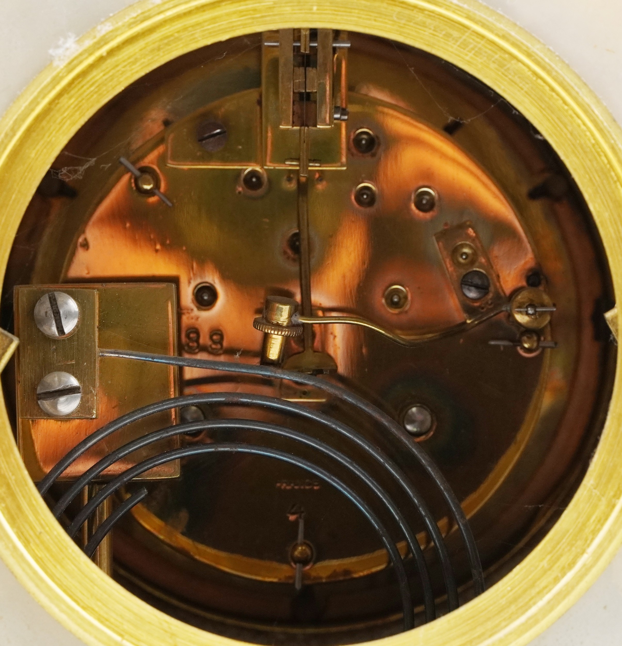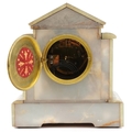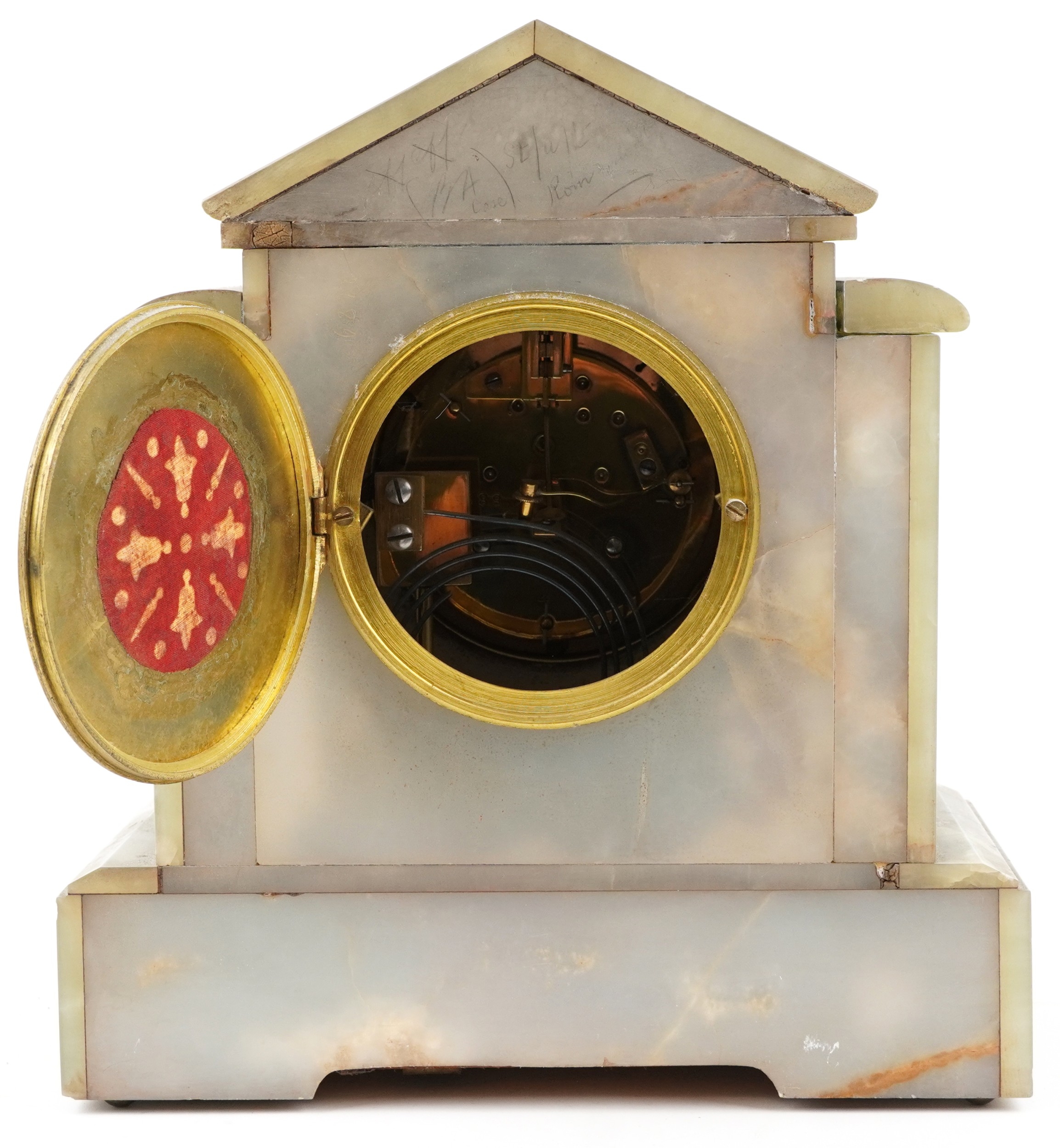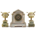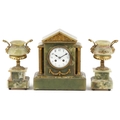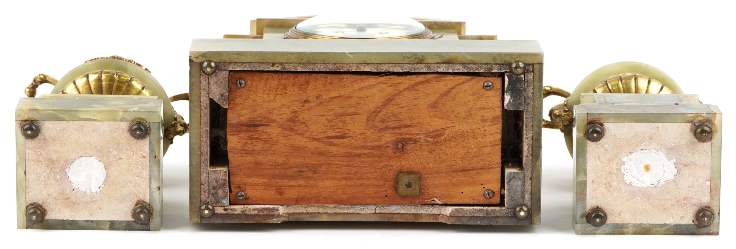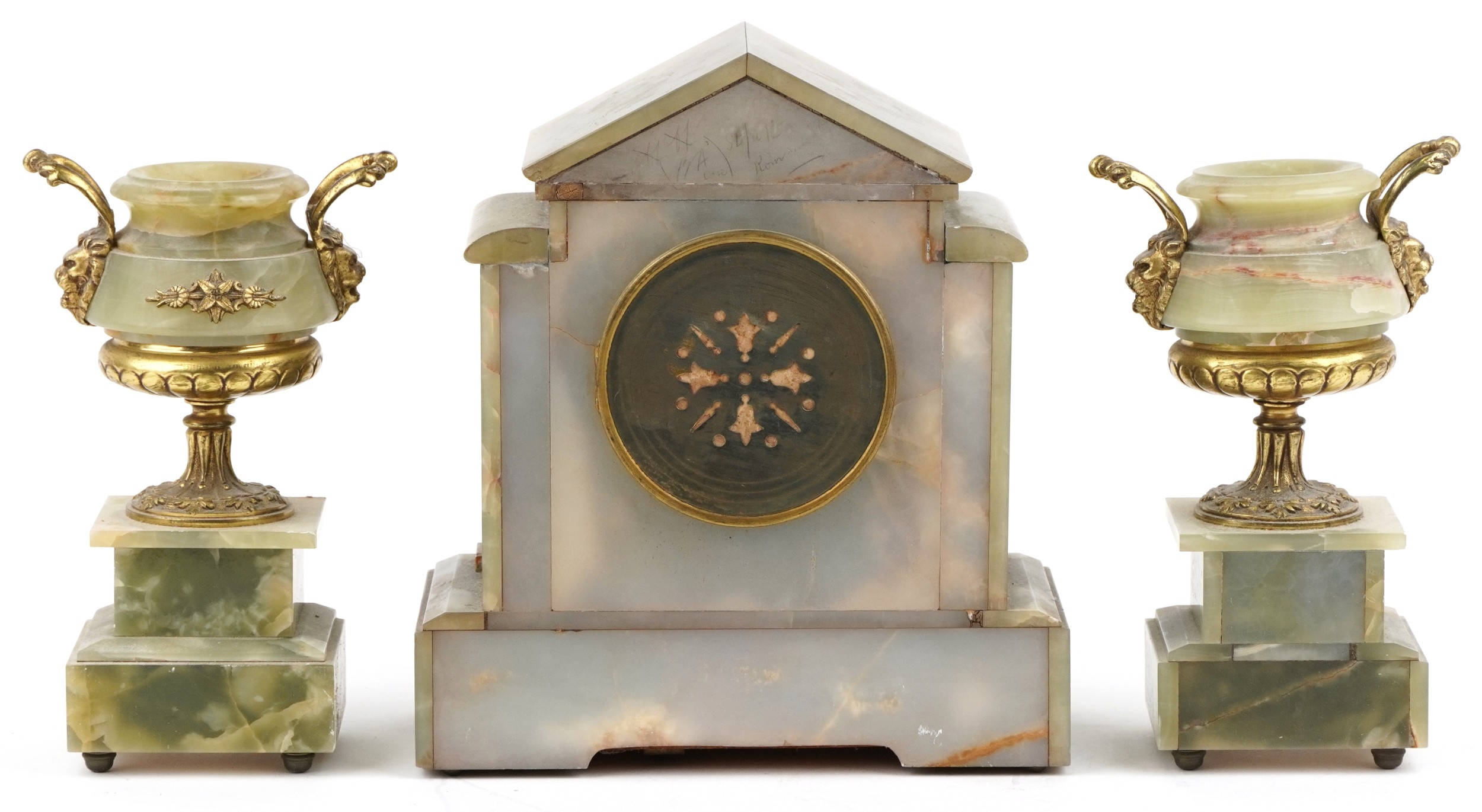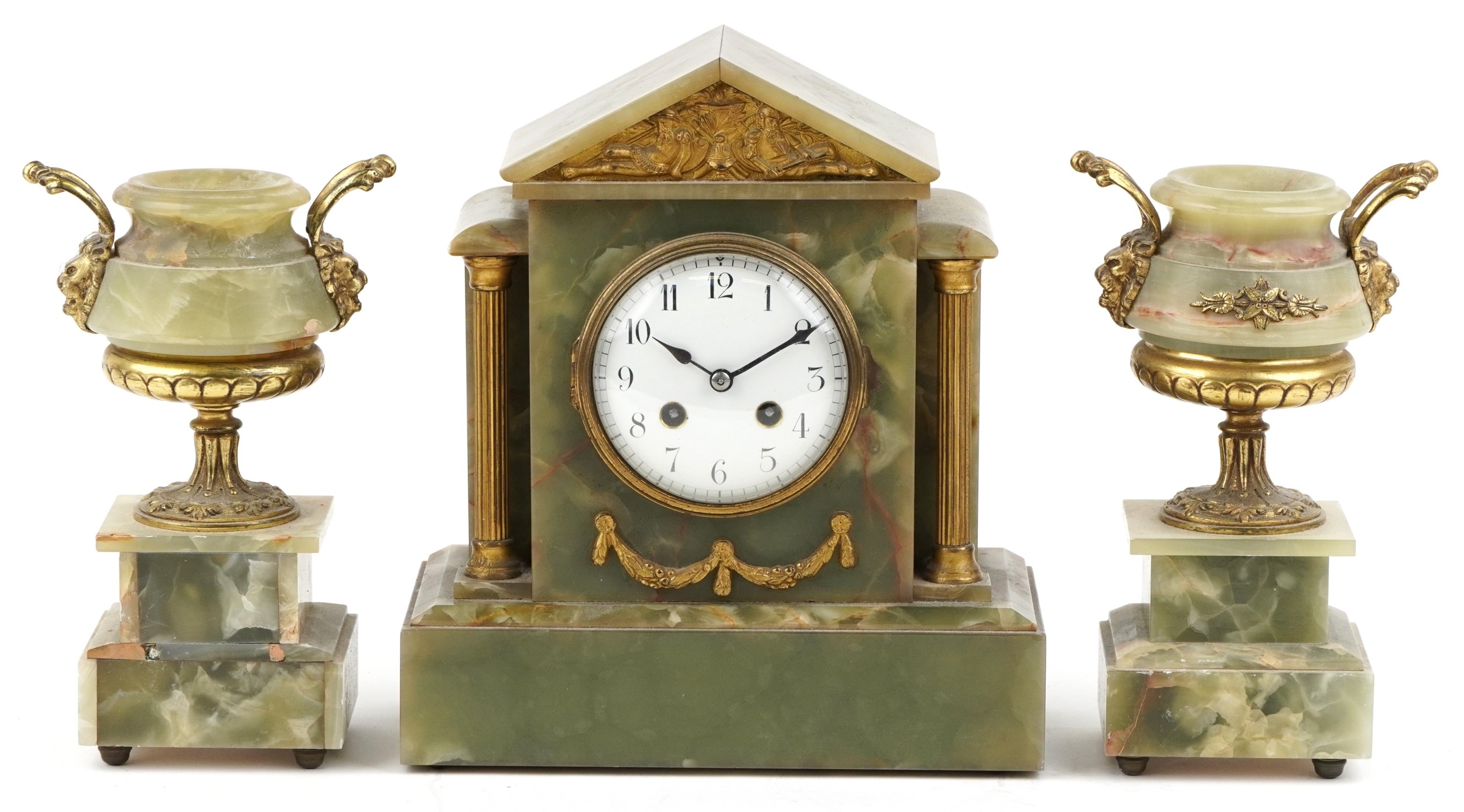 An onyx and brass three piece clock garniture, the clock having an enamelled dial with Arabic numerals, striking on a gong, 28cm high.