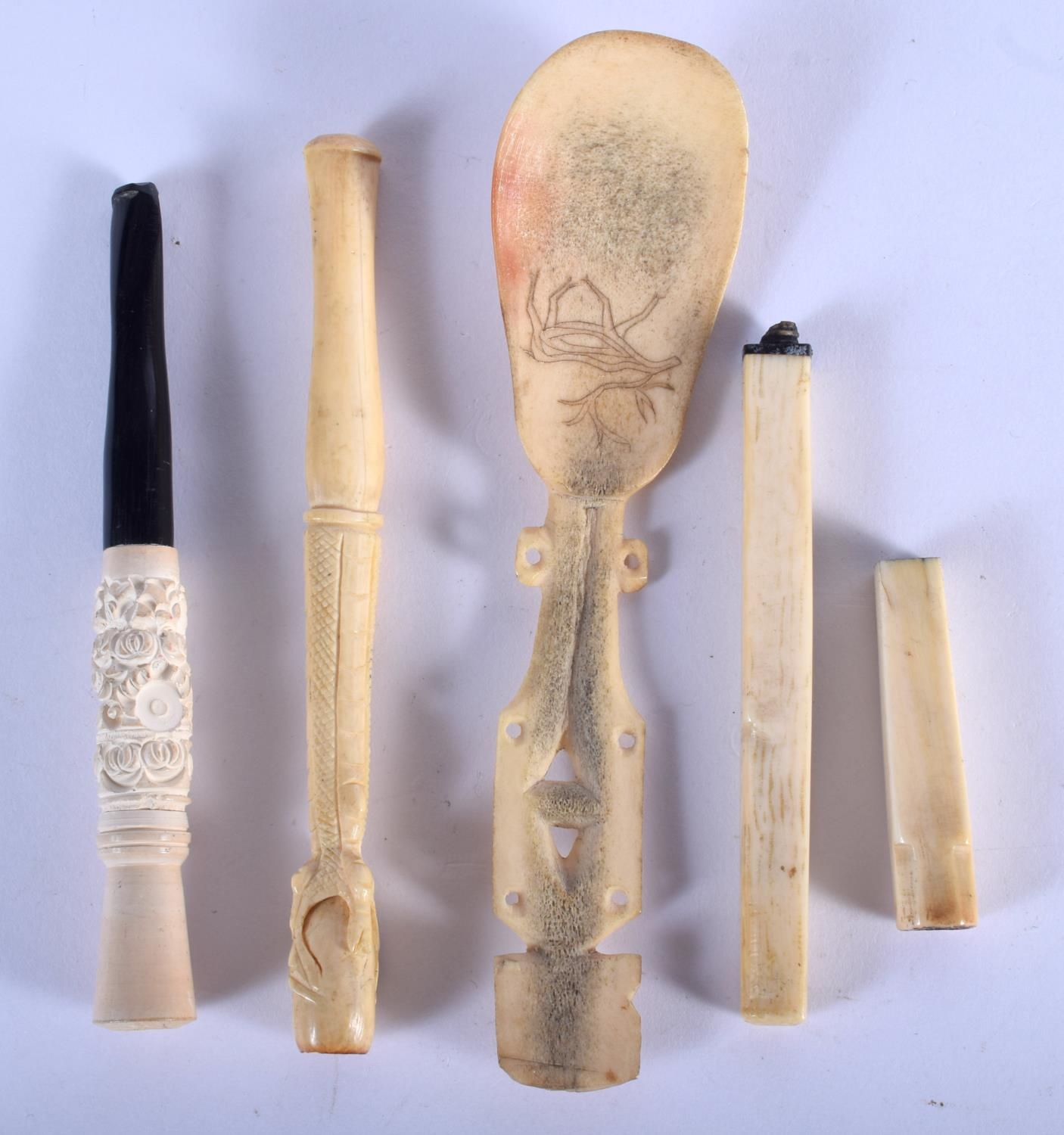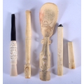 AN ANTIQUE GERMAN CARVED HORN STAG SPOON together with cheroots etc. Largest 15 cm long. (5)
