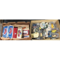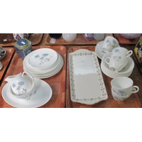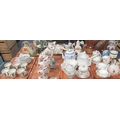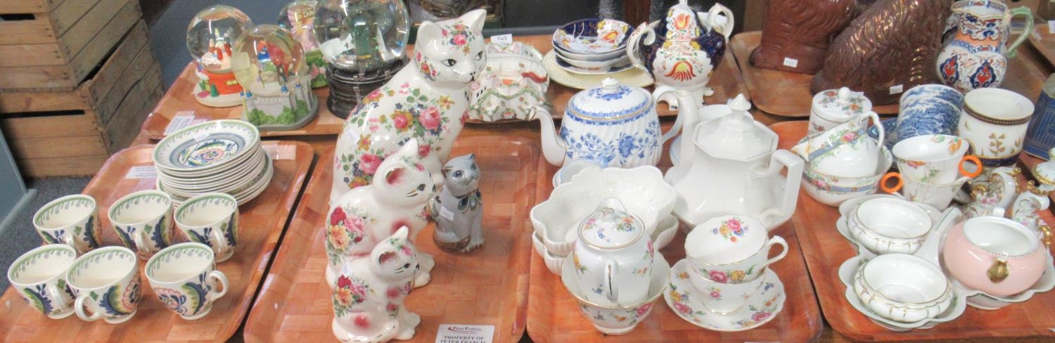 Four trays of assorted pottery and china to include: 2 Shelley Art Deco Style Tea Cups with Autumn Leaves and orange circular handles, New Chelsea Staffs part tea ware to include 2 tea cups, saucer, lidded milk jug and sugar basin. Shelley small milk jug, sugar basin, tea cup and 3 saucers decorated with pink and blue flowers, Wedgwood 'Kutani Crane' sucrier, Minton 'Hardwick Hall' blue and white teapot, 4 china cats, small Coalport bowls and reproduction Old Bristol Delft tea cups, saucers and side plate, Royal Doulton 'Estelle' sugar basin and milk jug.(4)