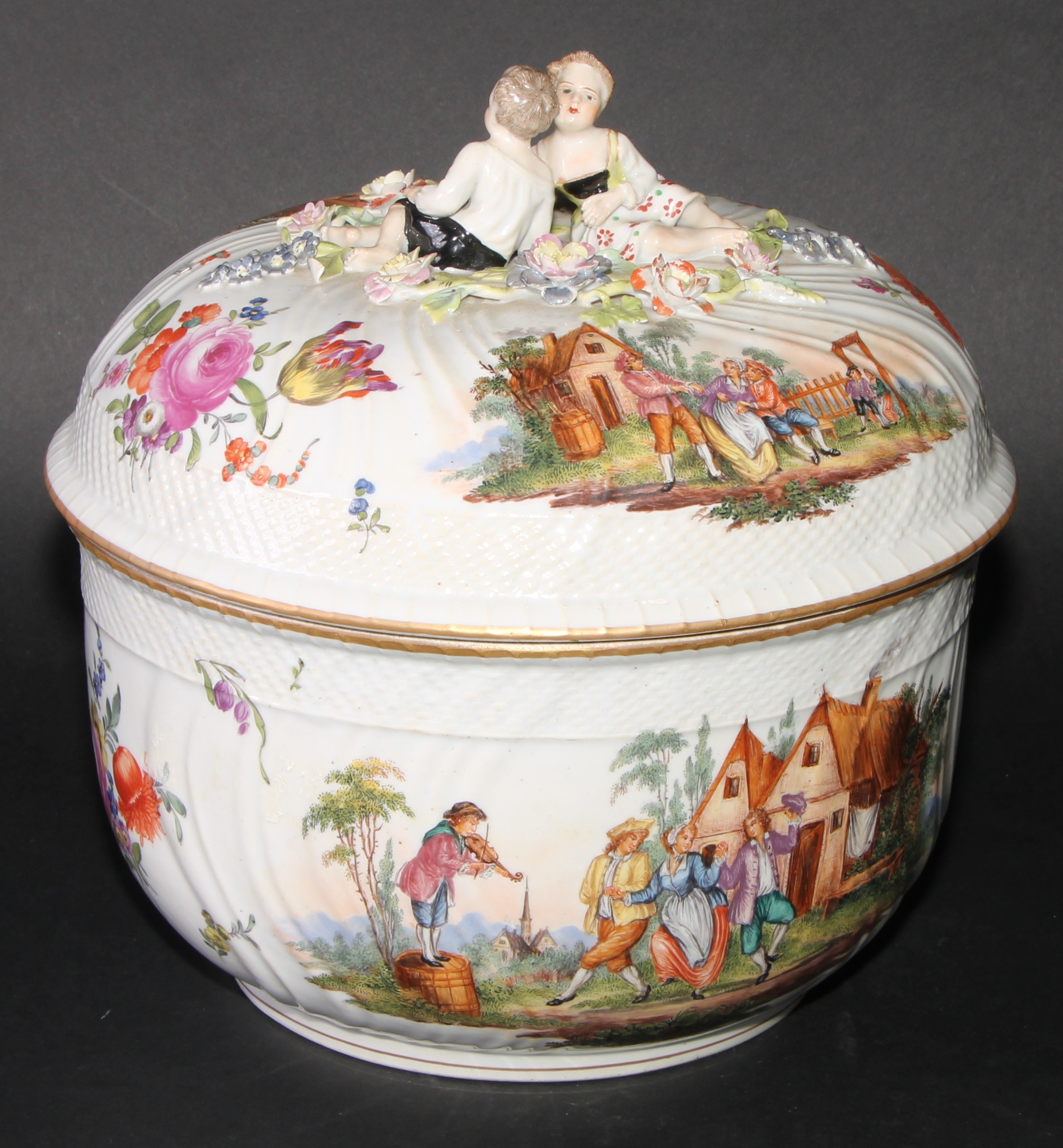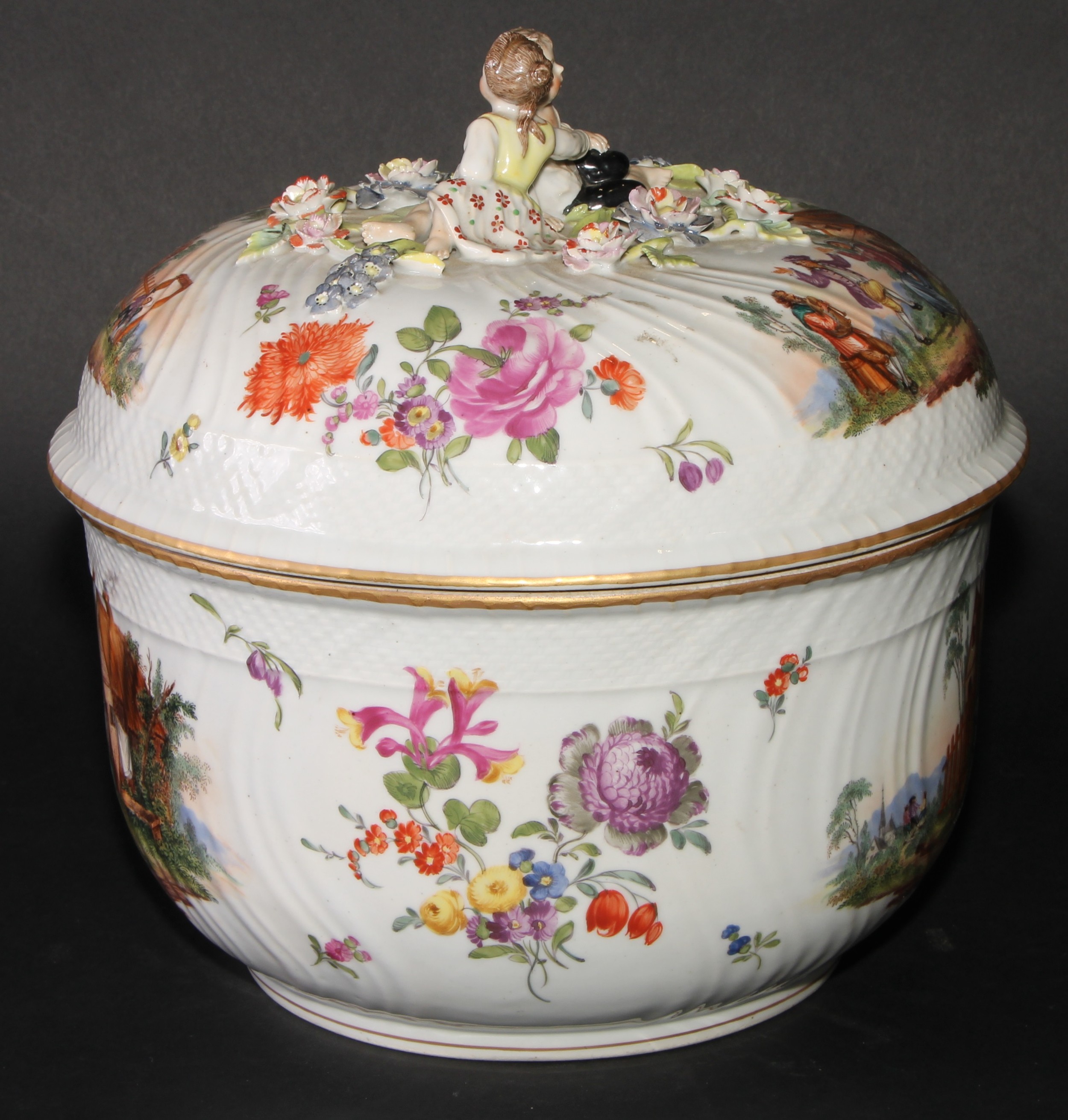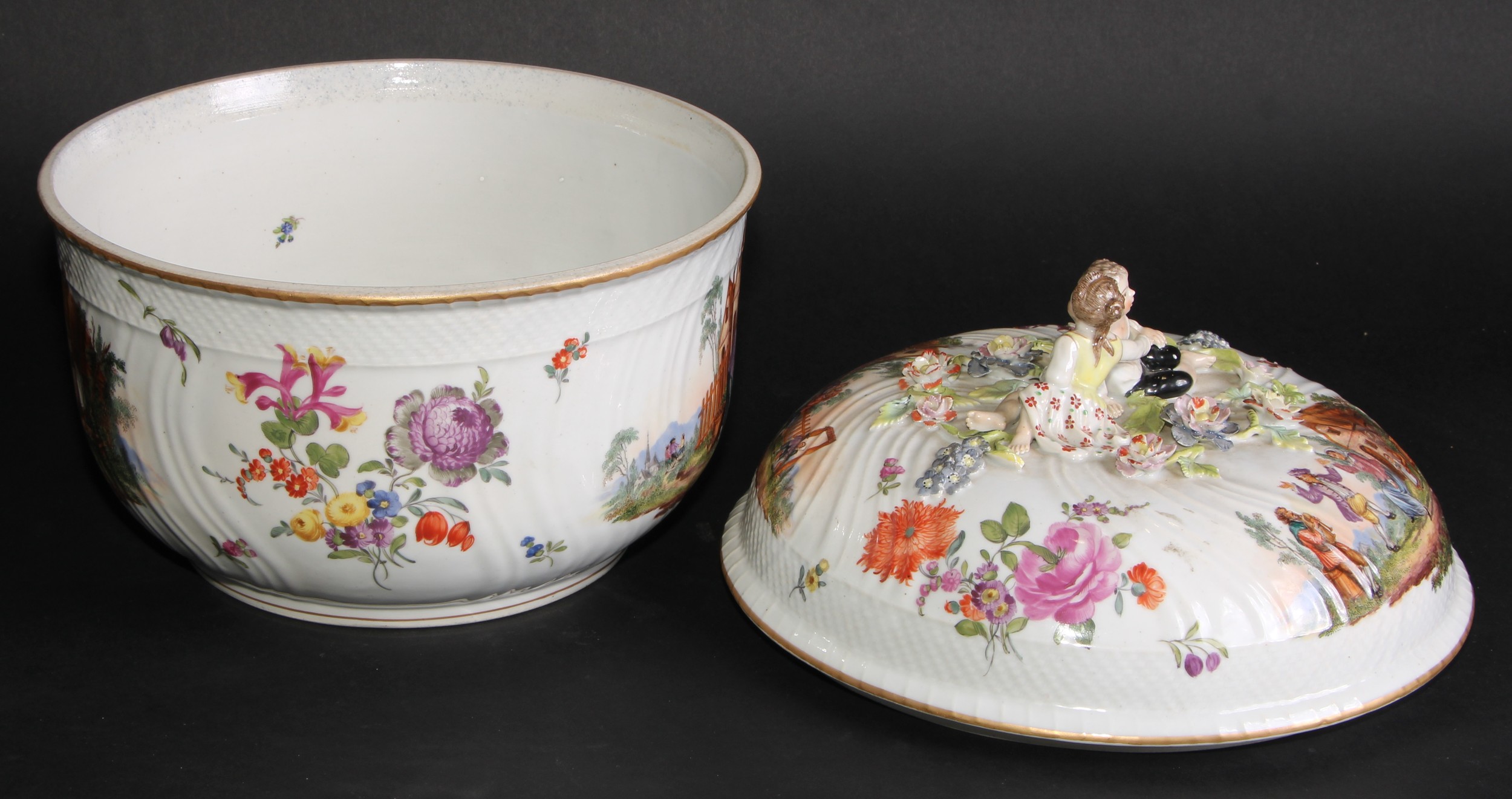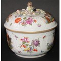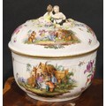 A Dresden porcelain circular tureen and cover, painted in polychrome with genre scenes and Deutsche Blumen, 26.5cm diameter, c.1900
