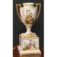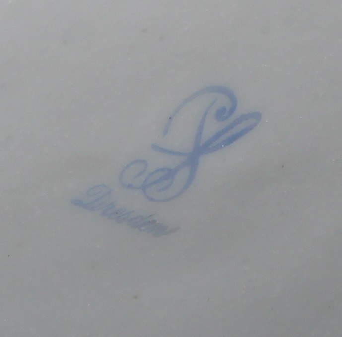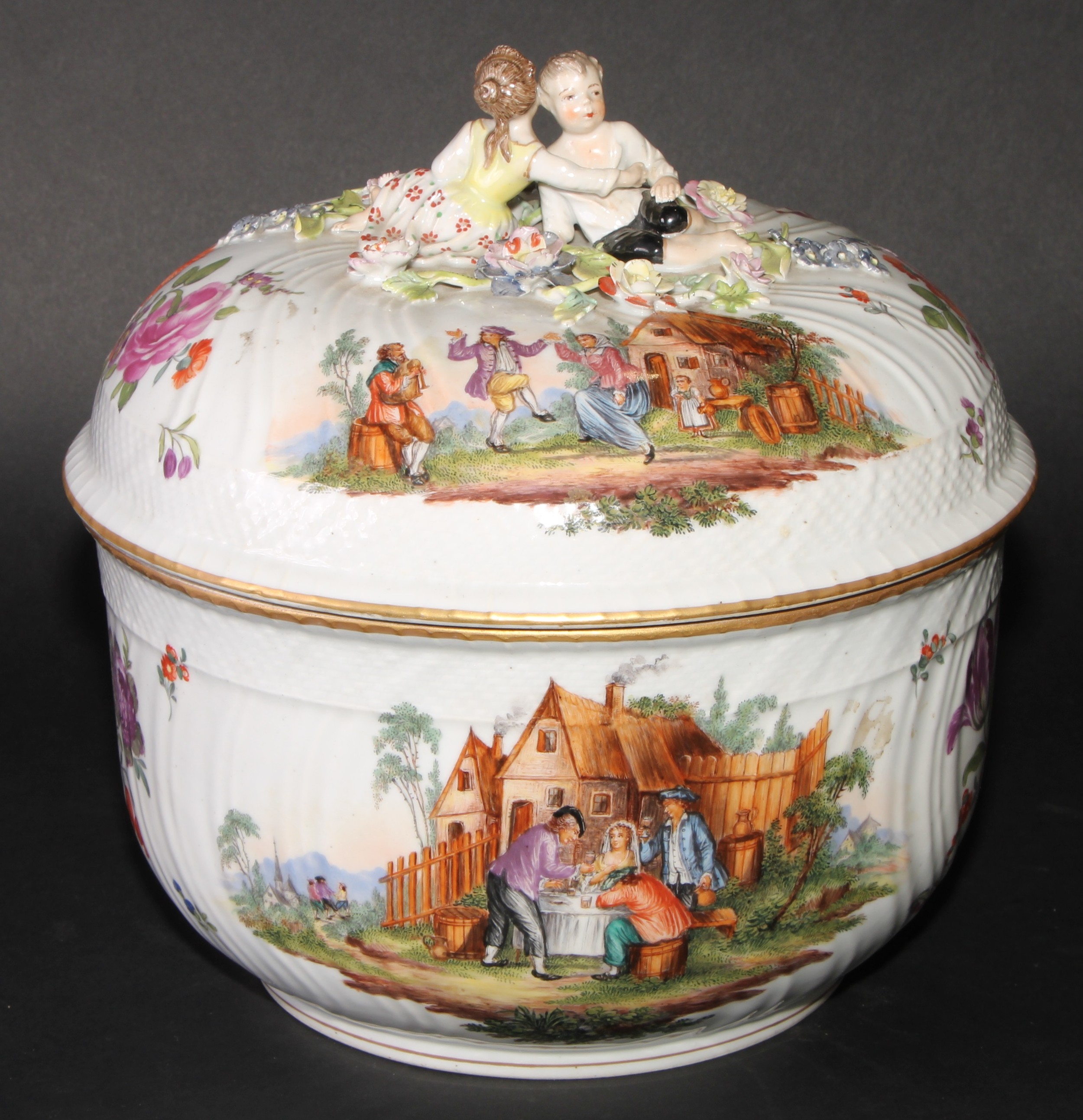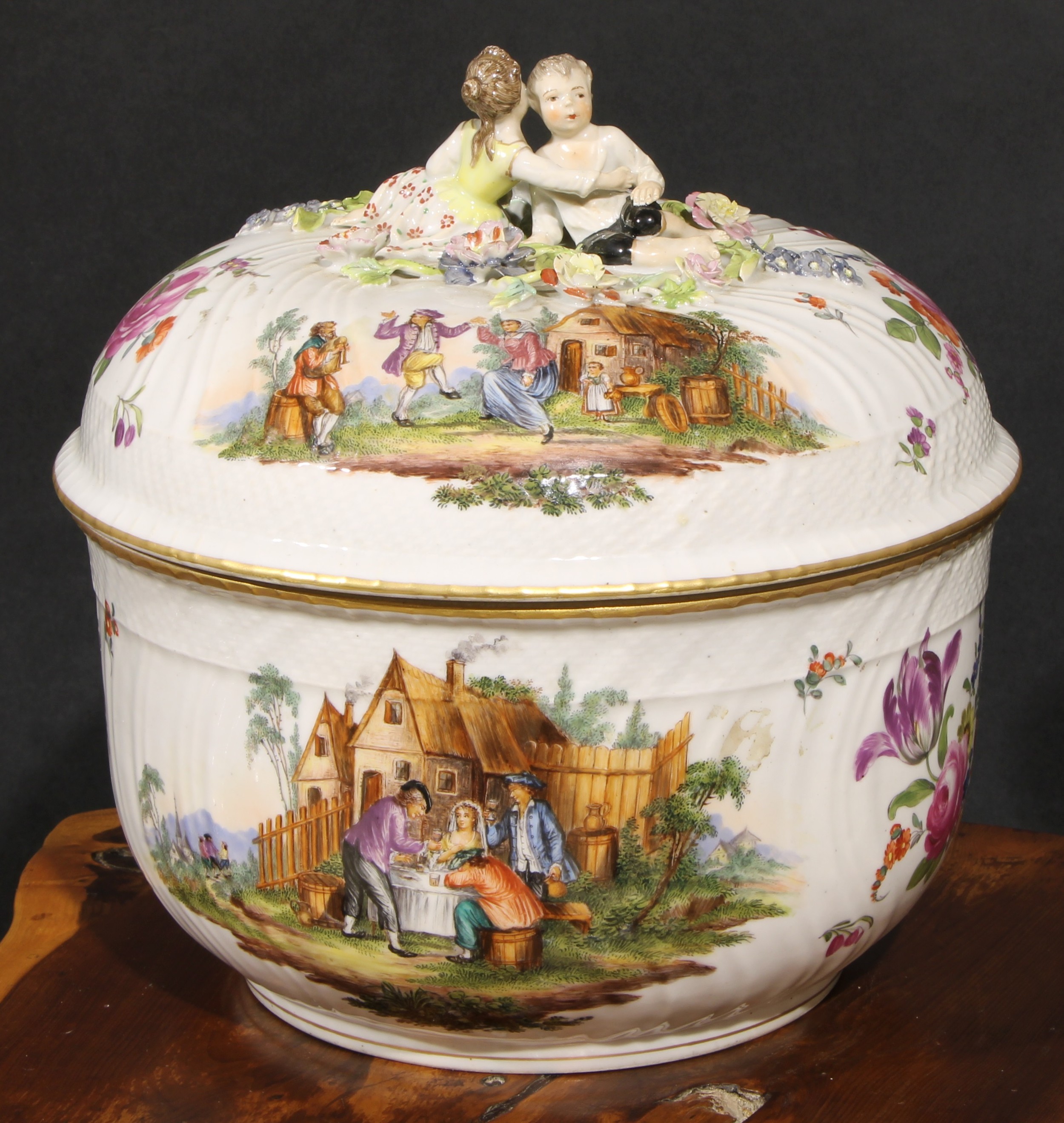 A Dresden porcelain circular tureen and cover, painted in polychrome with genre scenes and Deutsche Blumen, 26.5cm diameter, c.1900
