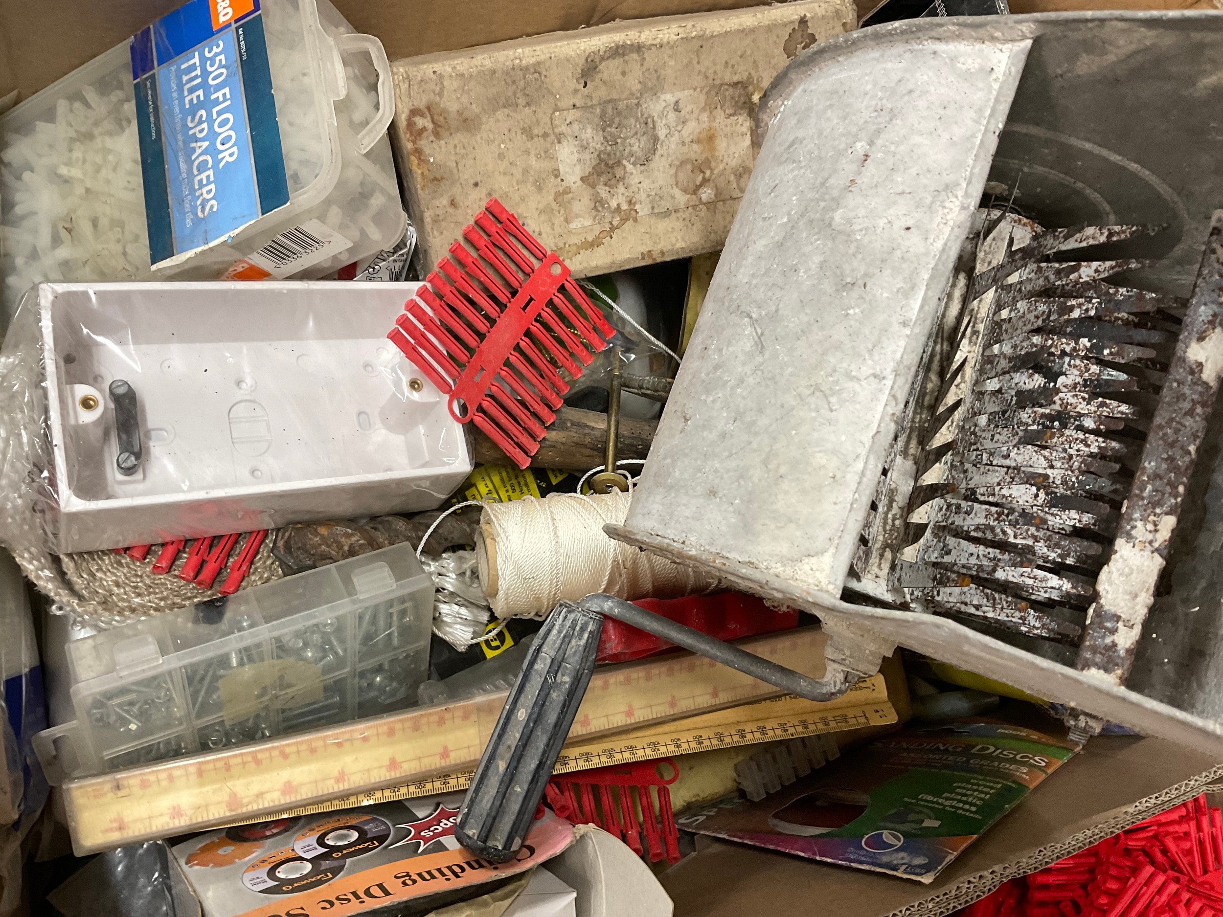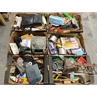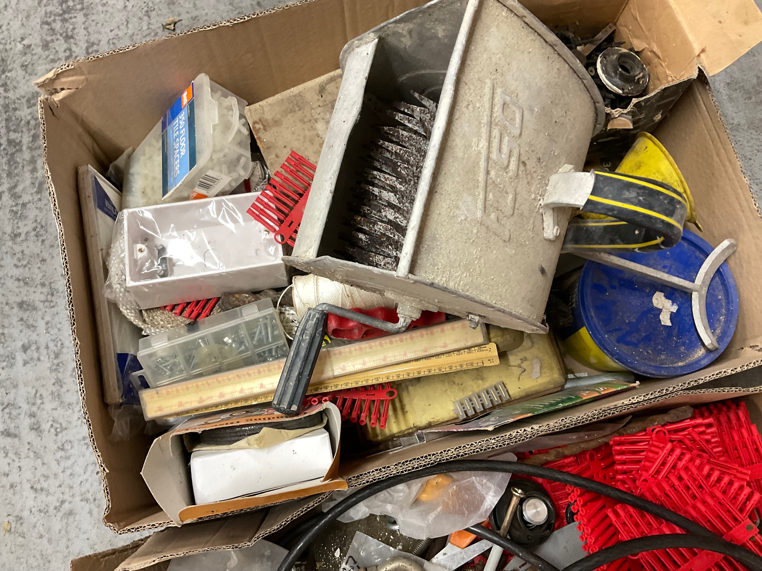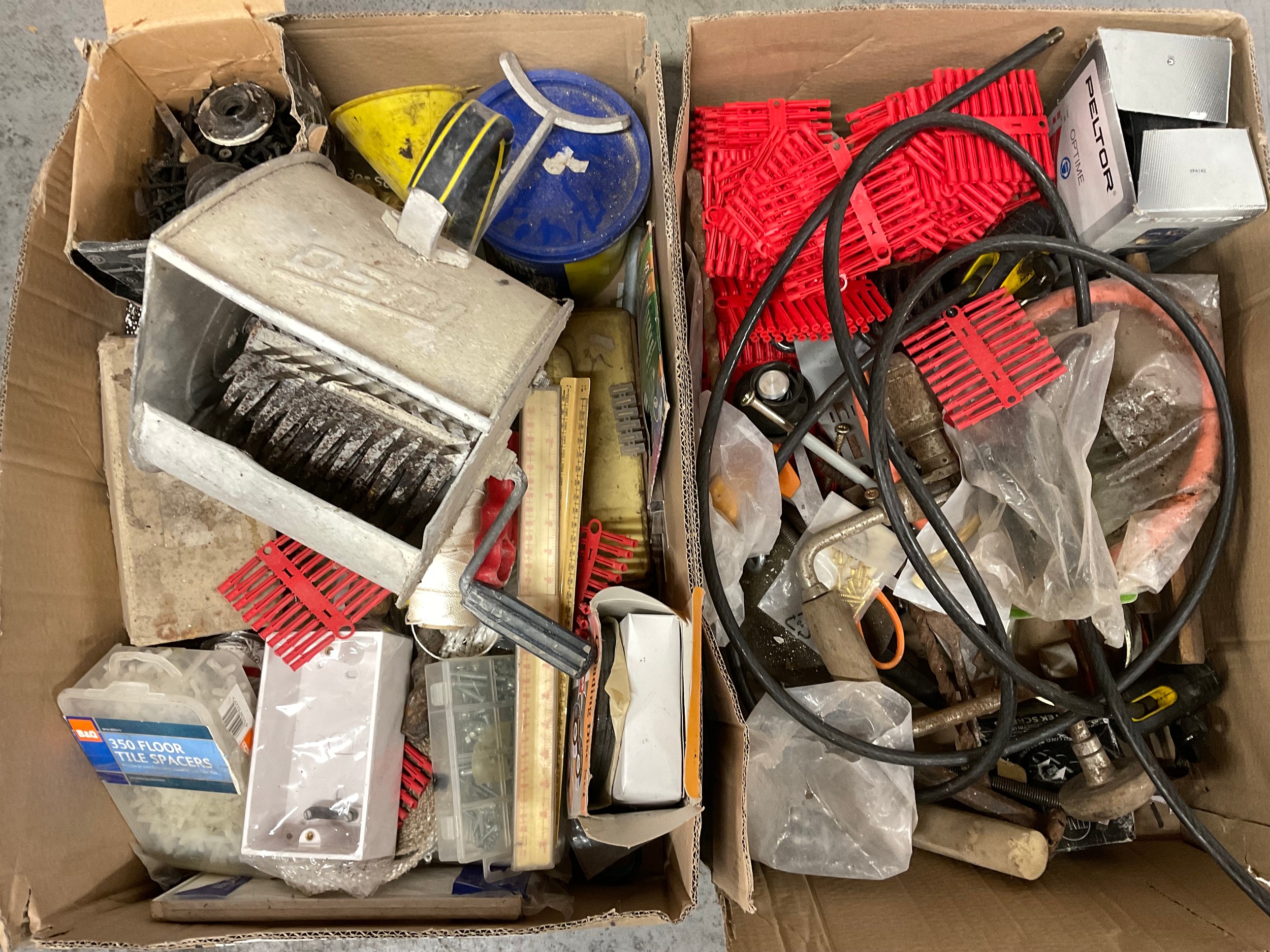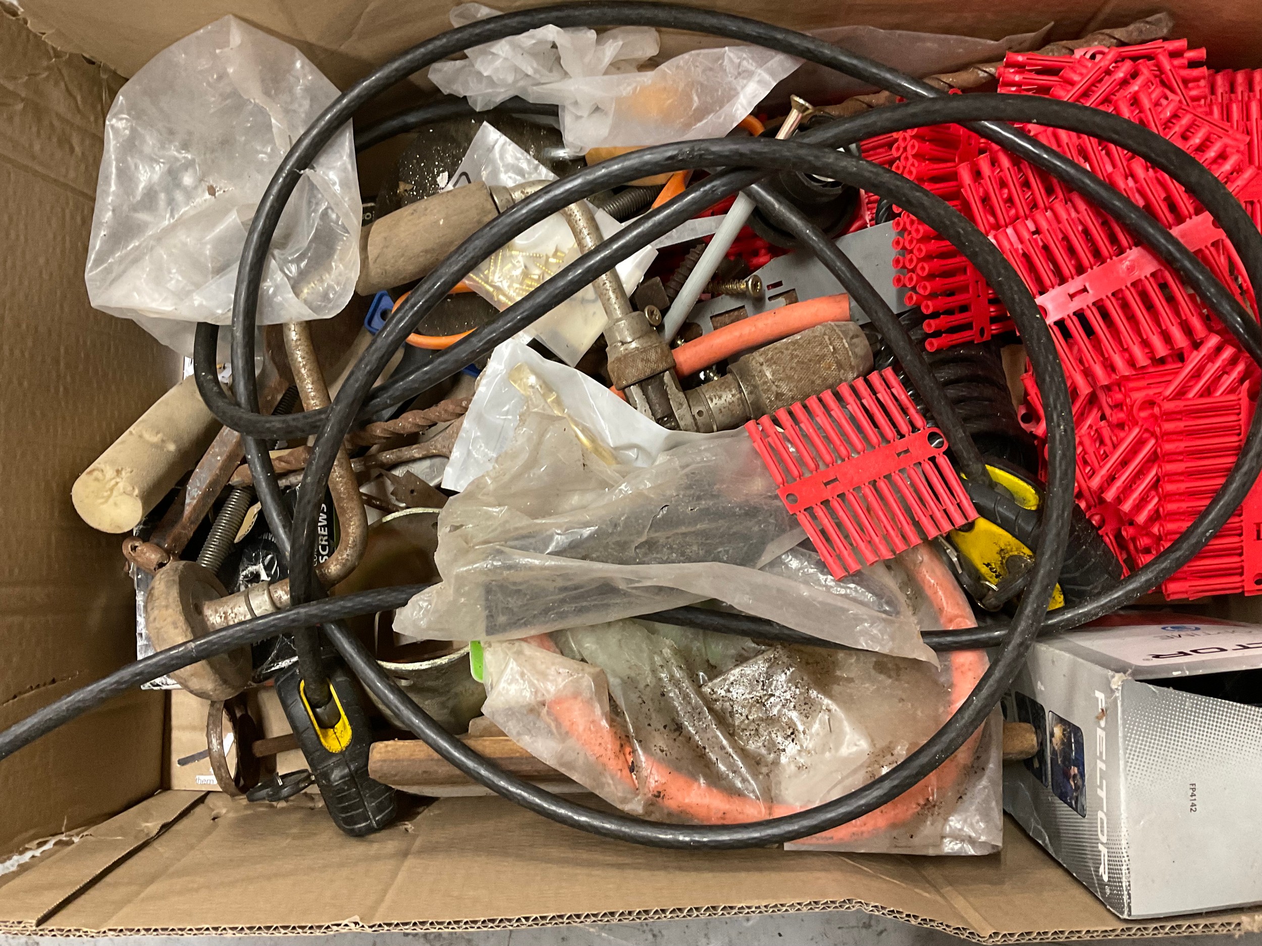 2 BOXES OF GARAGE & WORKSHOP ITEMS TO INCLUDE HAND DRILLS ETC