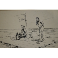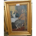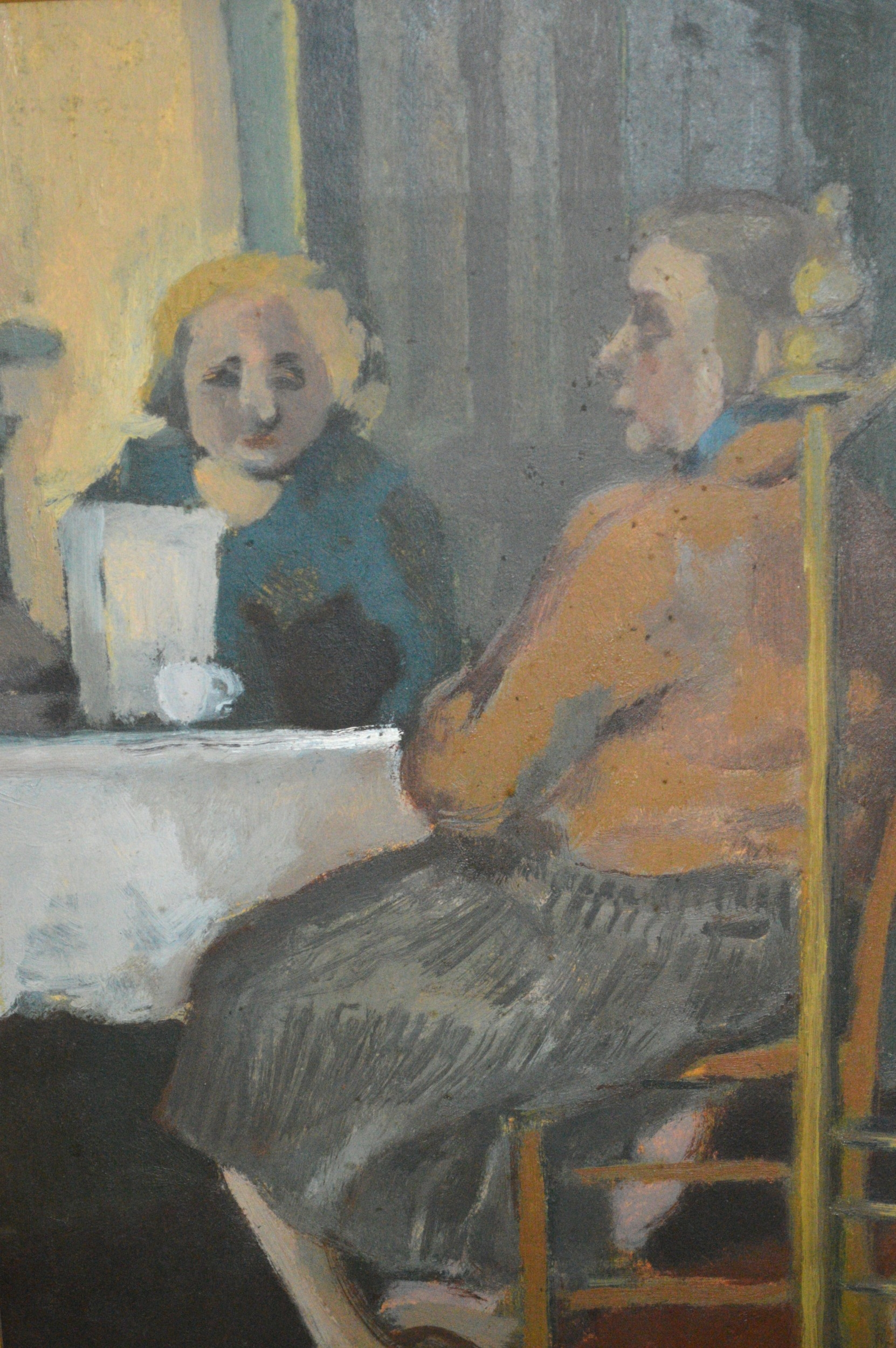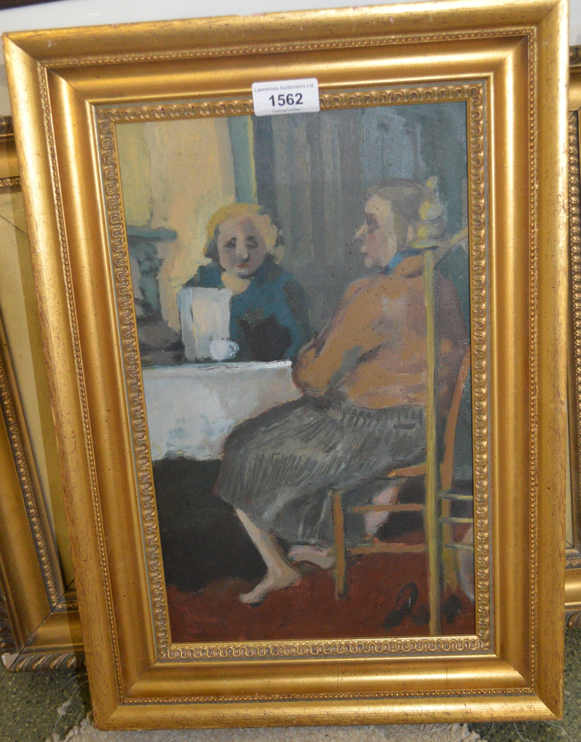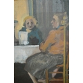Camberwell School oil on board, study of two ladies seated at a table, 35 x 21cm