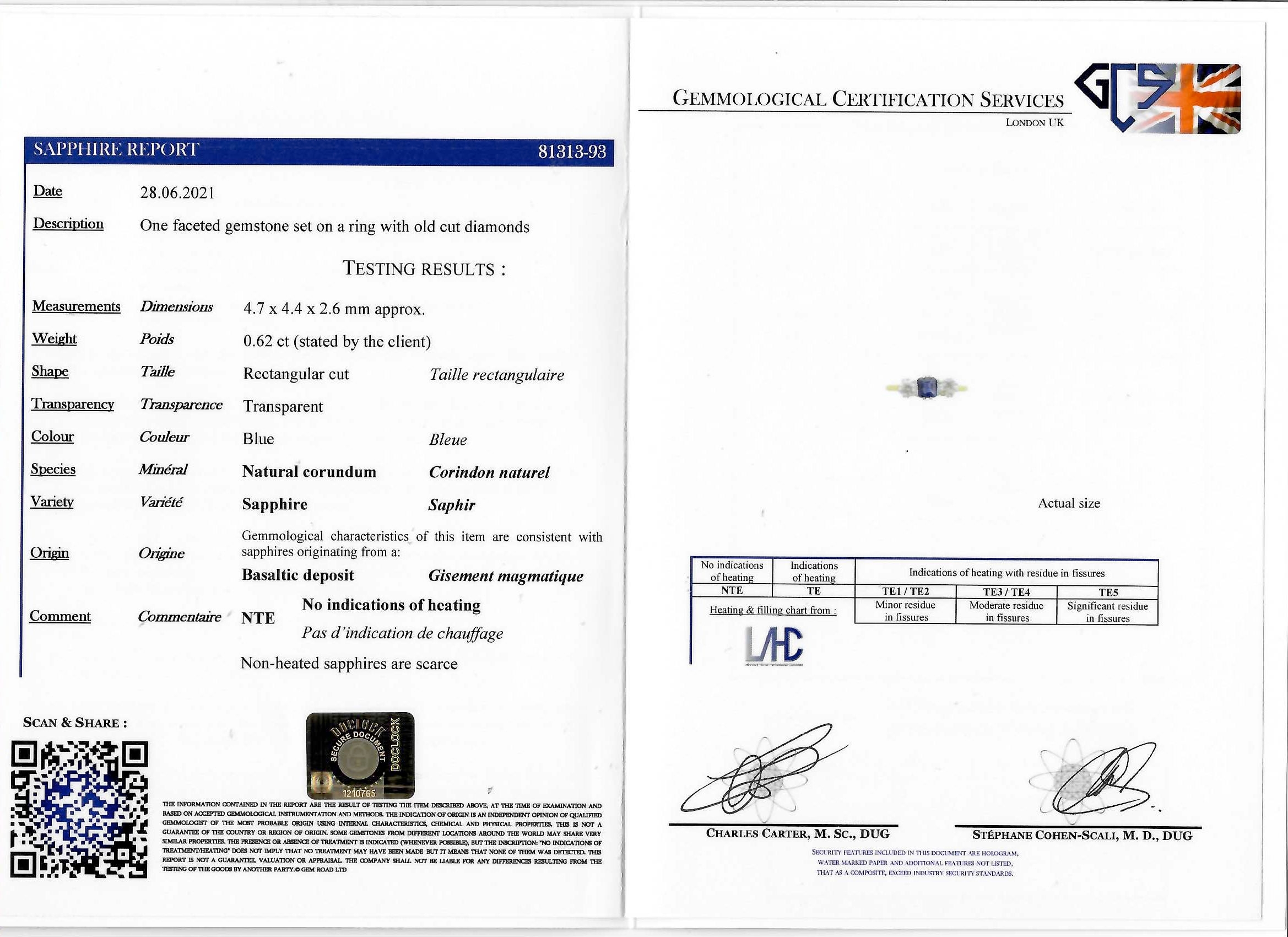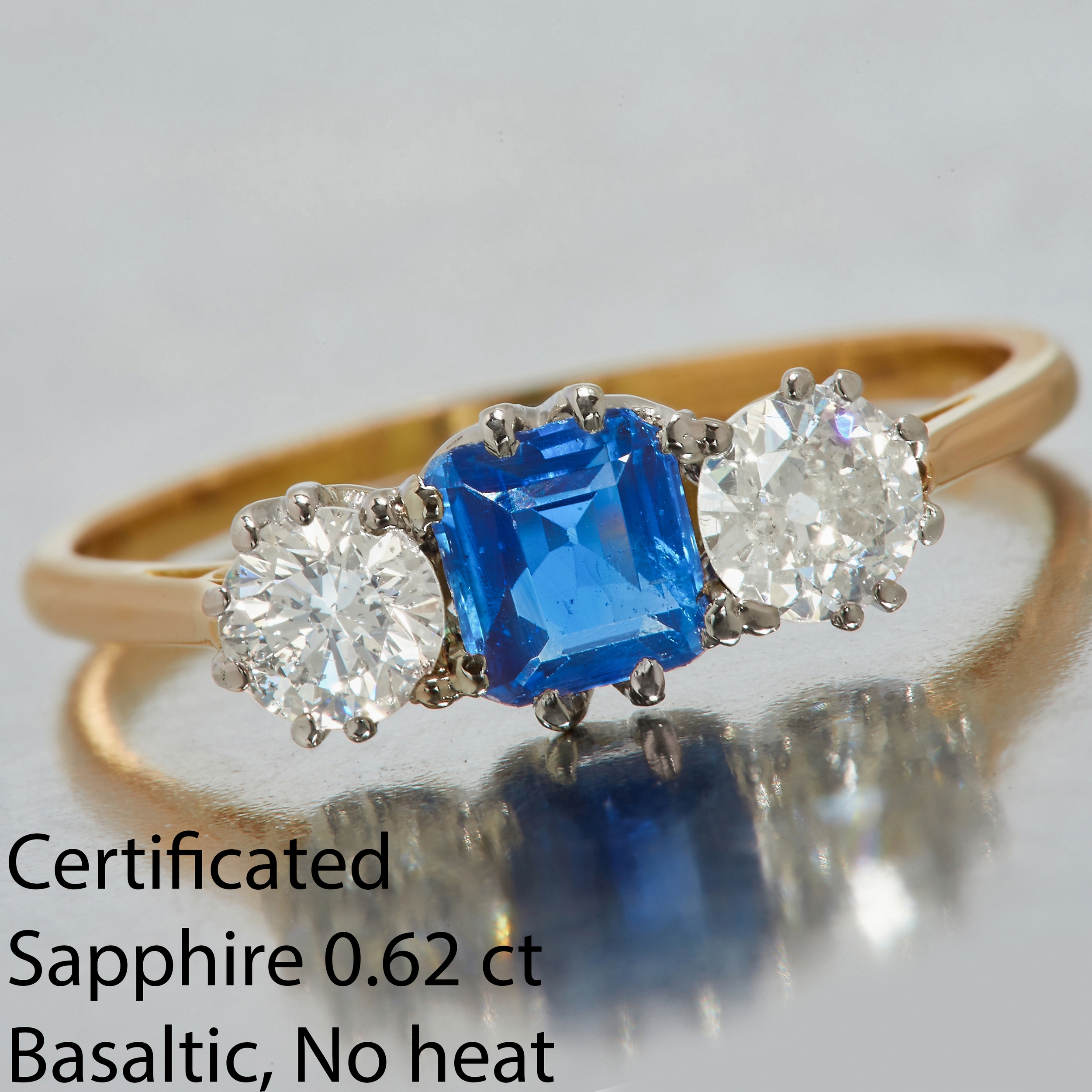 ERTIFICATED SAPPHIRE AND DIAMOND 3-STONE RING, set with a central blue sapphire of aprox. 0.62 ct. flanked by a diamond on each shoulder totalling approx. 0.50 ct. Size N 1/2. 2.4 grams. Accompanied by GCS london report No. 81313-93 stating that the 0.62 ct. blue sapphire is Natural, Basaltic deposit, No indications of heating.