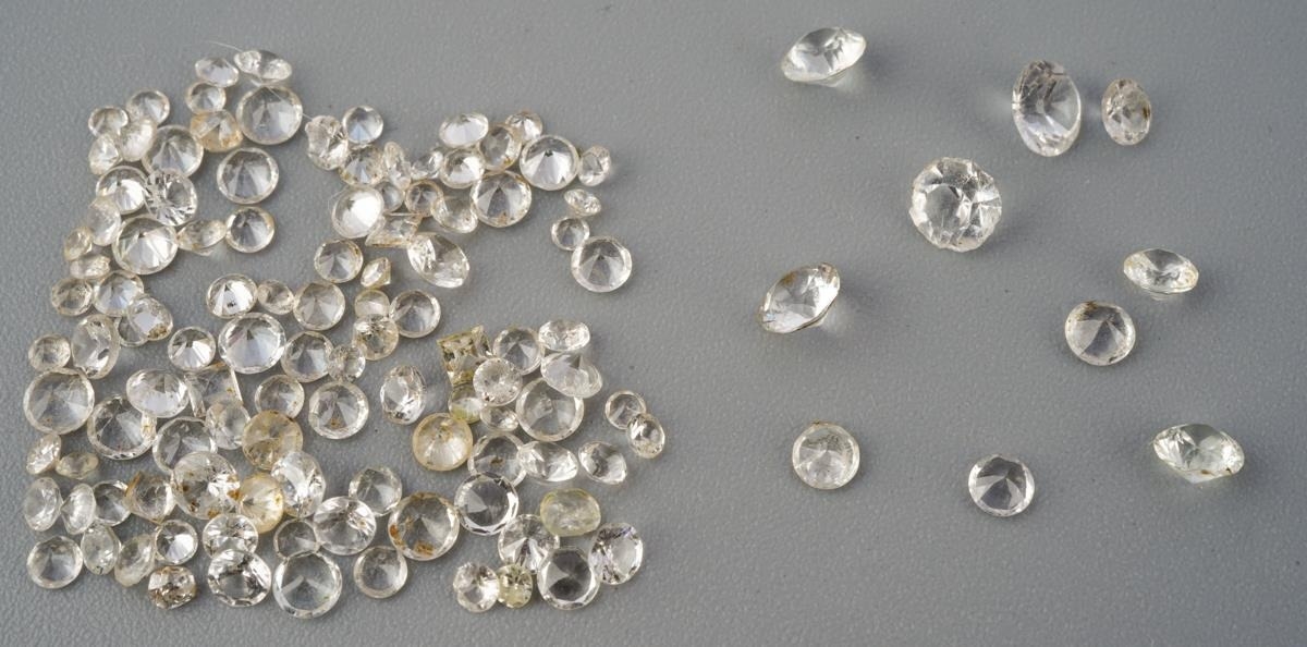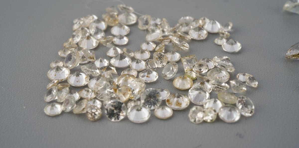 A collection of colourless sapphire, synthetixc spinel and colouless paste and other colourless stones, some AF.
