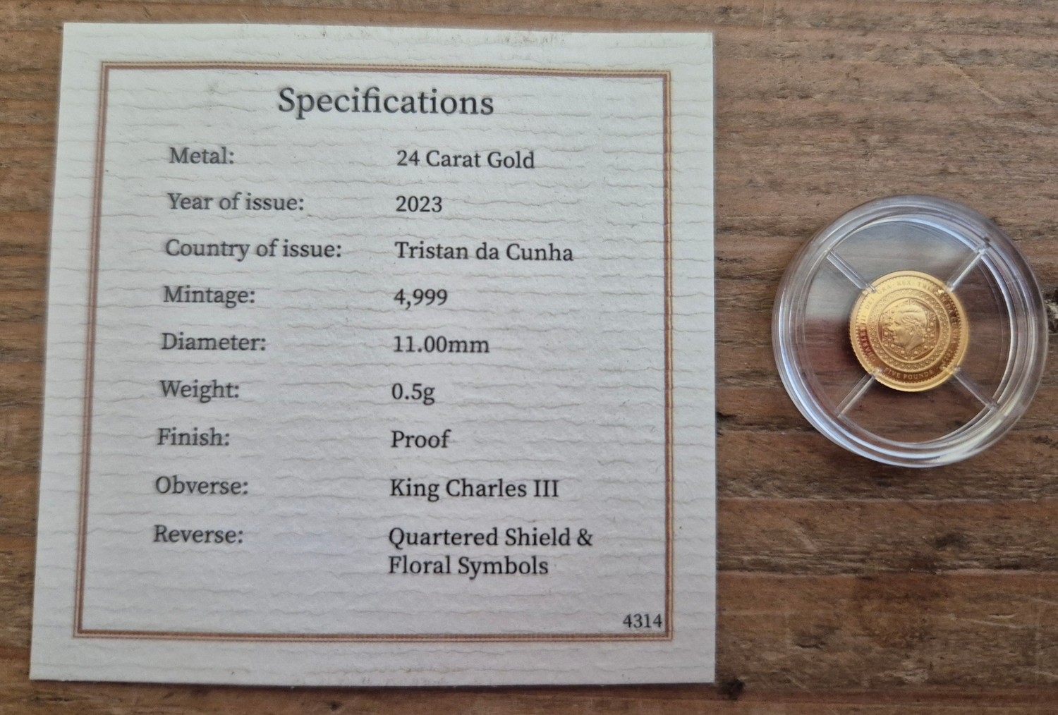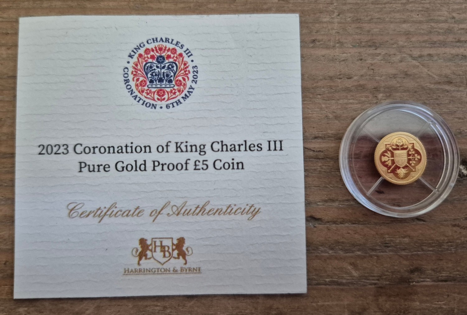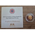 A Harrington & Byrne 2023 Coronation of King Charles III Pure Gold Proof £5 Coin, in capsule with certificate, 10% buyer's premium (inclusive of VAT), normal online bidding fees apply.