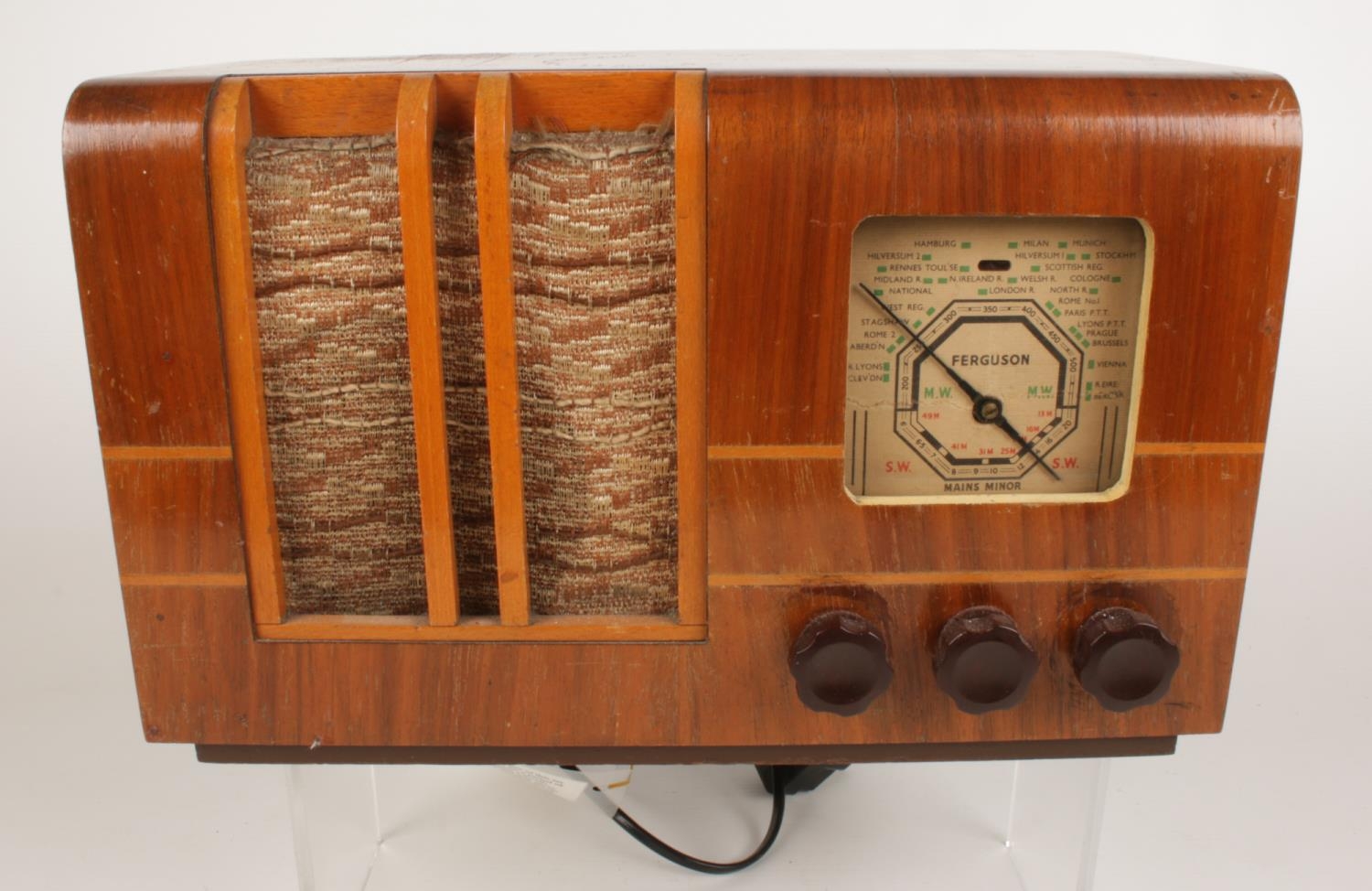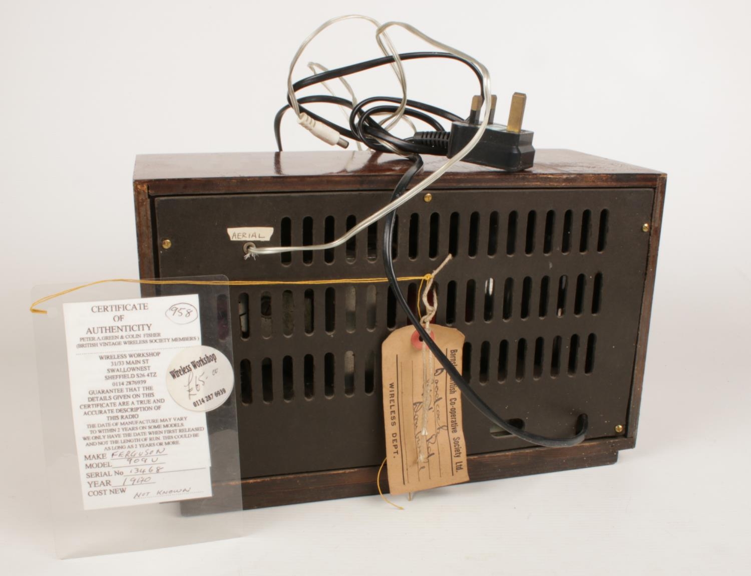 A Ferguson 1940's vintage wooden cased valve radio. Model no 909U, Serial no 13468. H: 20.5cm, W: 33cm, D: 16.5cm.