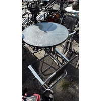 A garden bistro set comprising of a small table and two chairs.