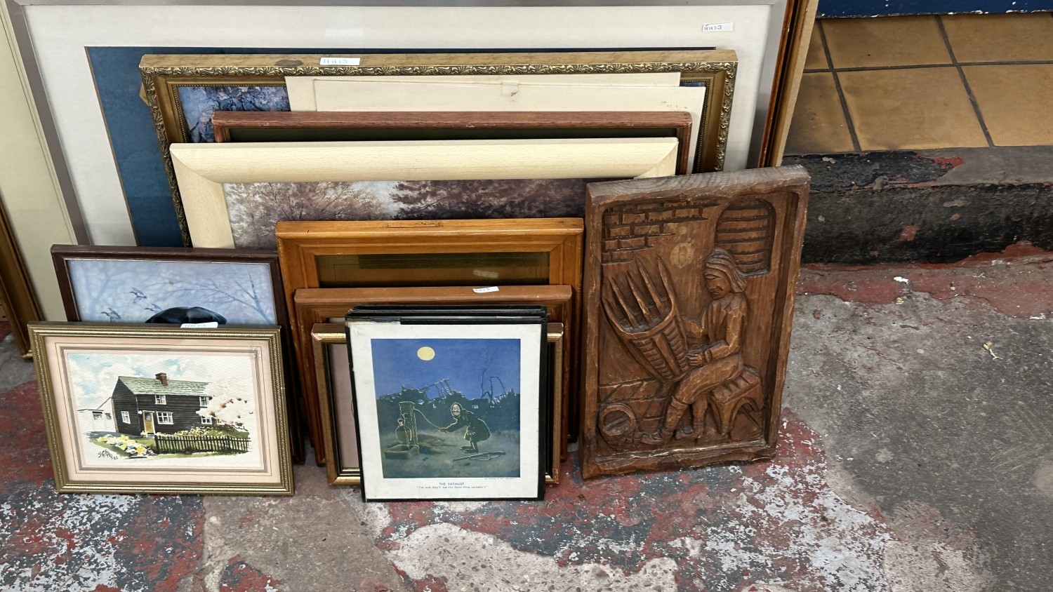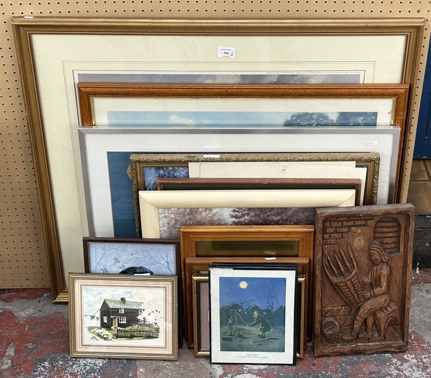 Seventeen pictures and wall hangings to include carved hardwood, three Bruce Bairnsfather prints, Madeline Selfe 'Grundy, Pat Eddery Up' print etc.