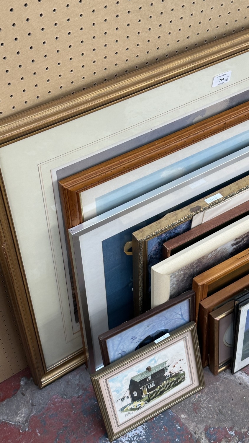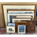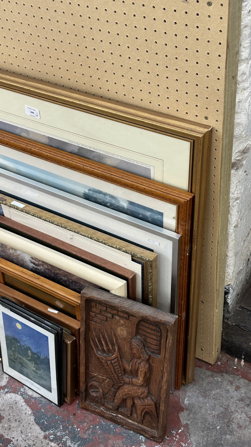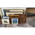 Seventeen pictures and wall hangings to include carved hardw...