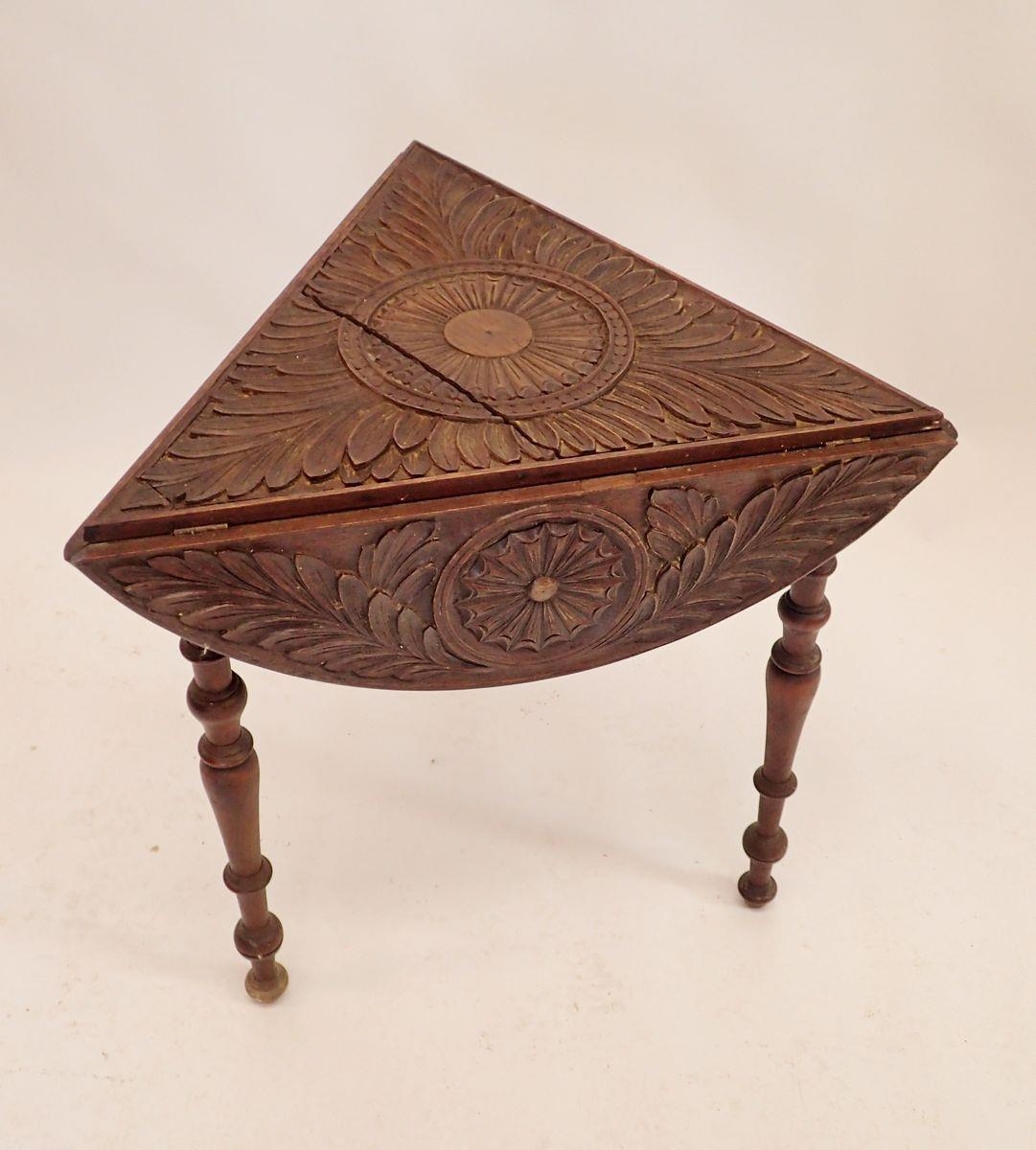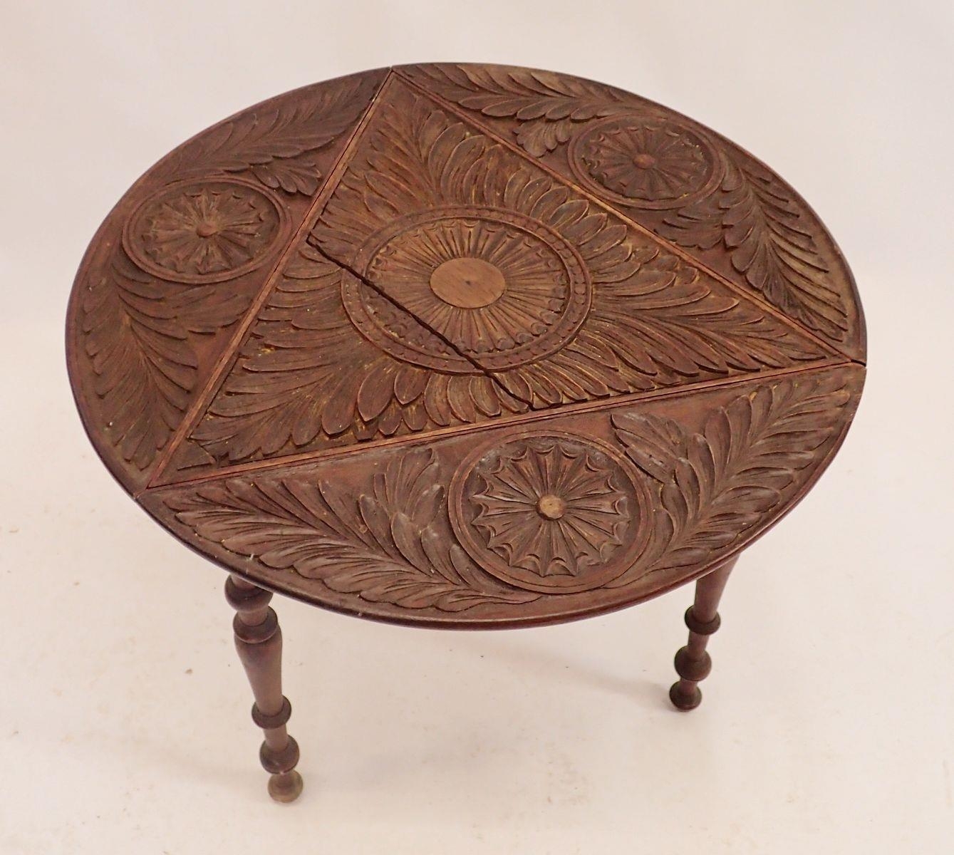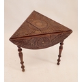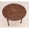 A Victorian circular carved occasional table folding down to make a triangle, 66cm diameter