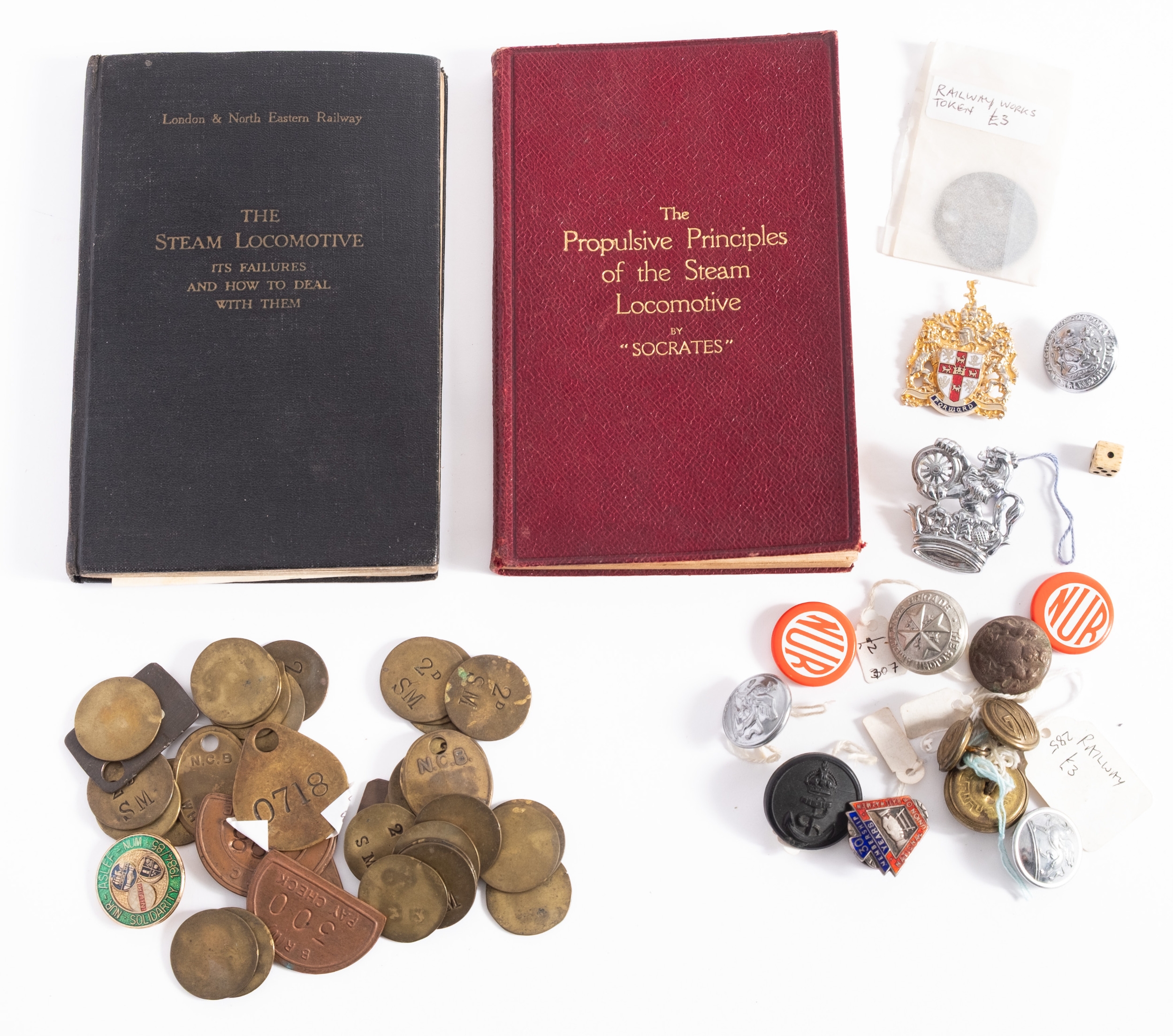 A collection of BR and other token and pay checks, together with an LNER cap badge, a BR cap badge, a copy of 'The Propulsive Principles of the Steam Locomotive', .a copy of The Steam Locomotive It's failures and how to deal with them' and related items. +