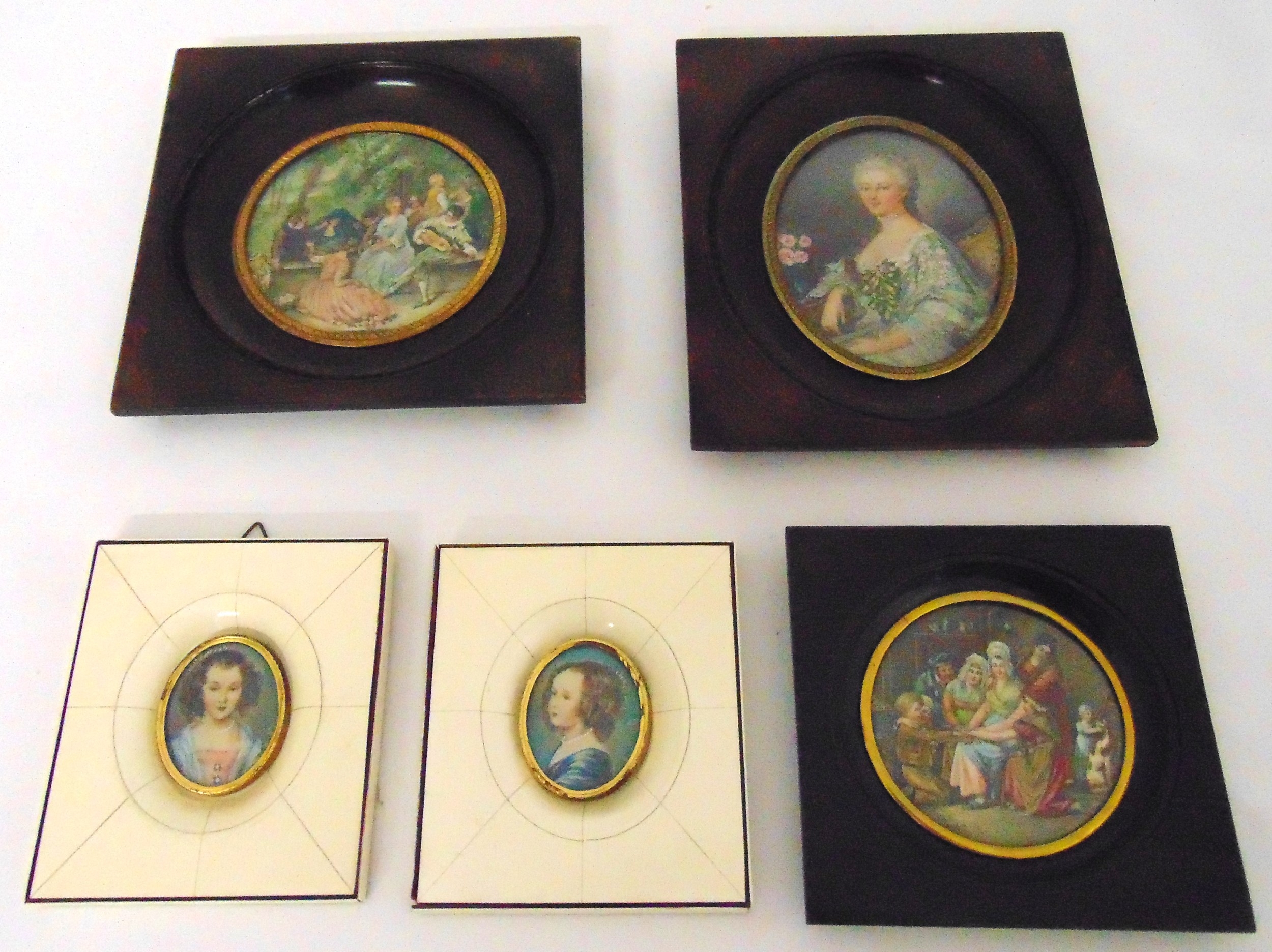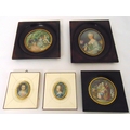 Five framed miniatures of ladies and gentlemen, 11 x 8.5cm