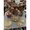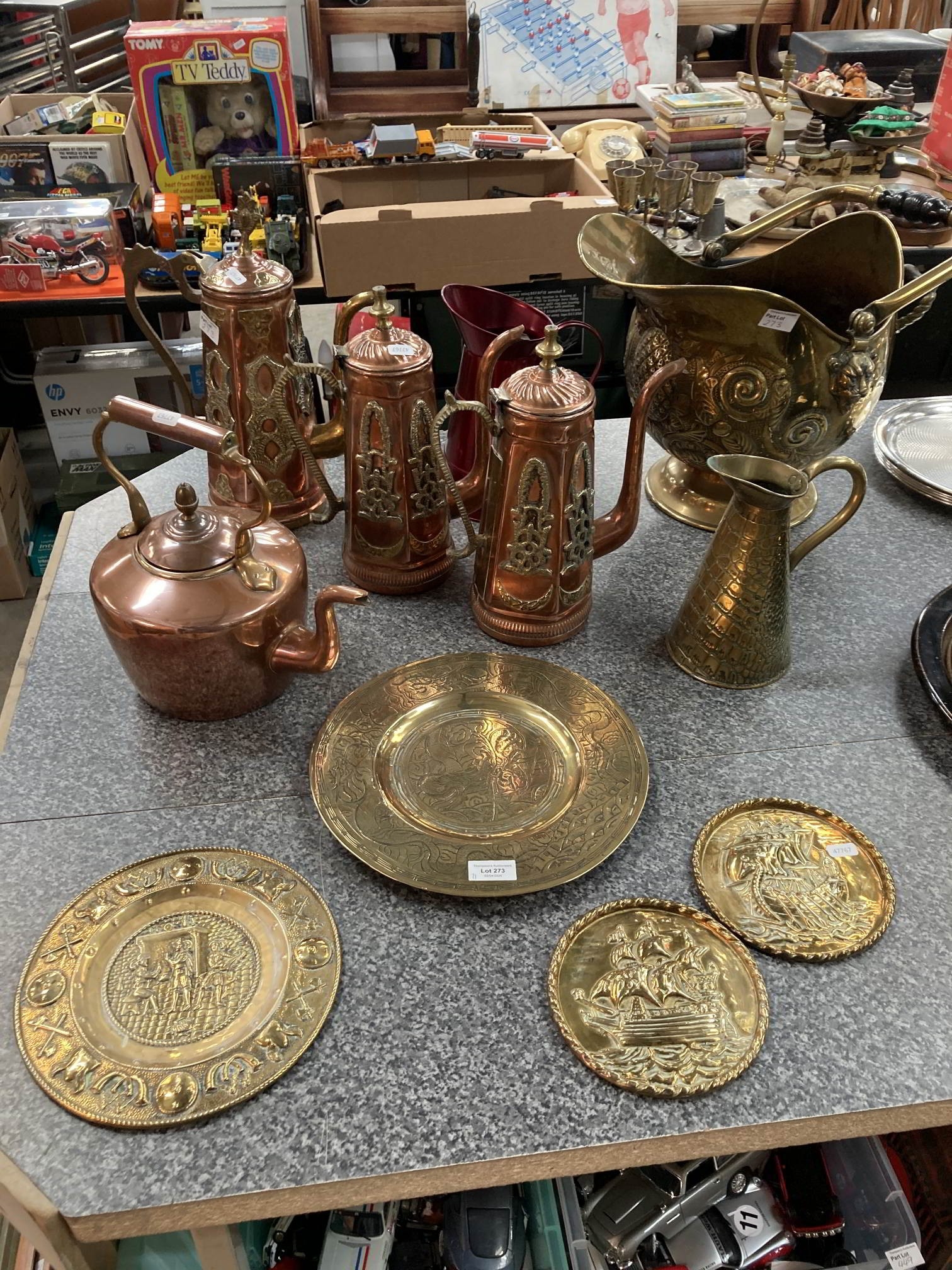 3 copper & brass Moroccan coffee/tea pots, brass coal scuttle, copper kettle etc