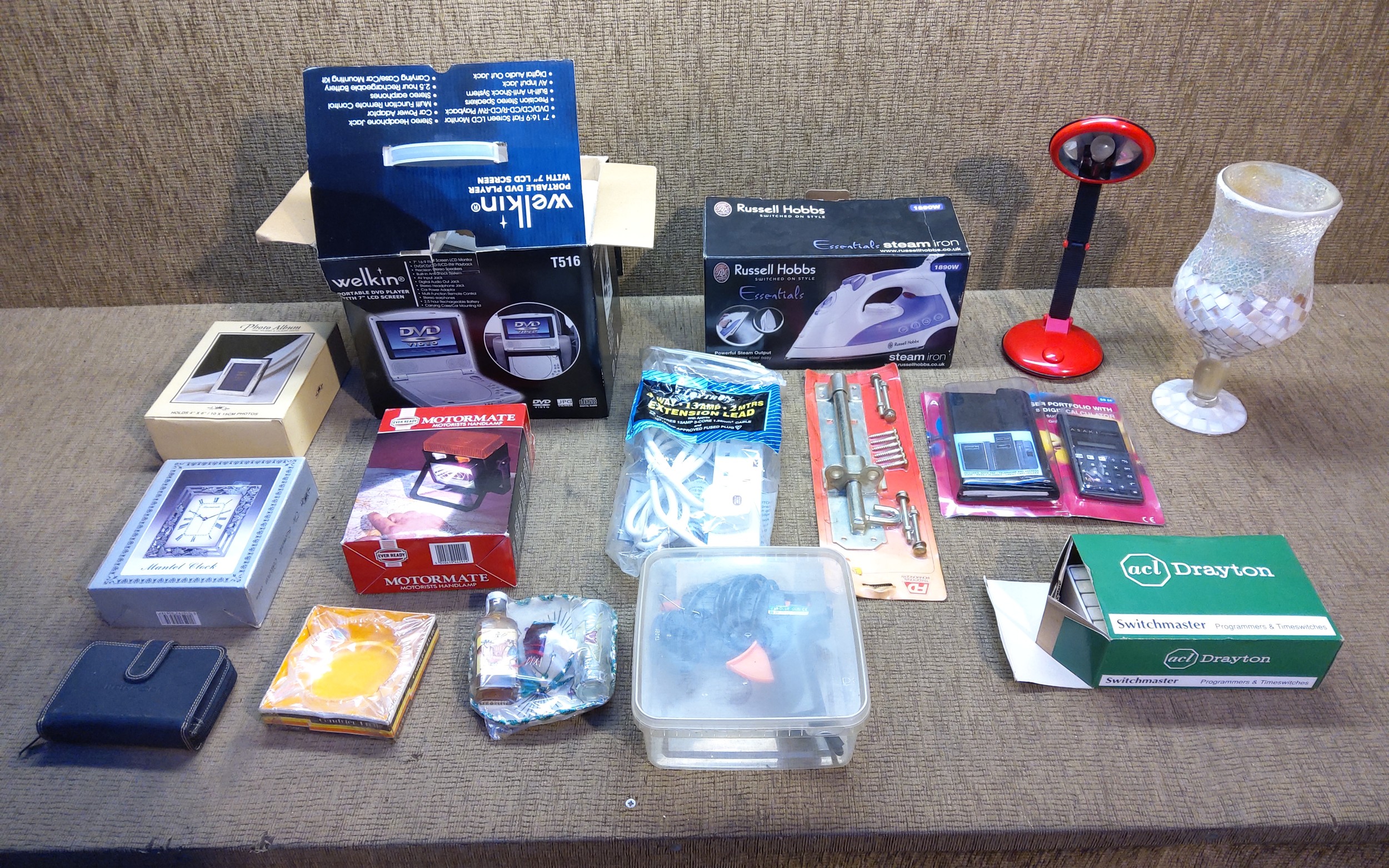 Mixed items including a boxed Russell Hobbs iron, portable DVD player and Ever-ready motorist hand lamp.