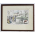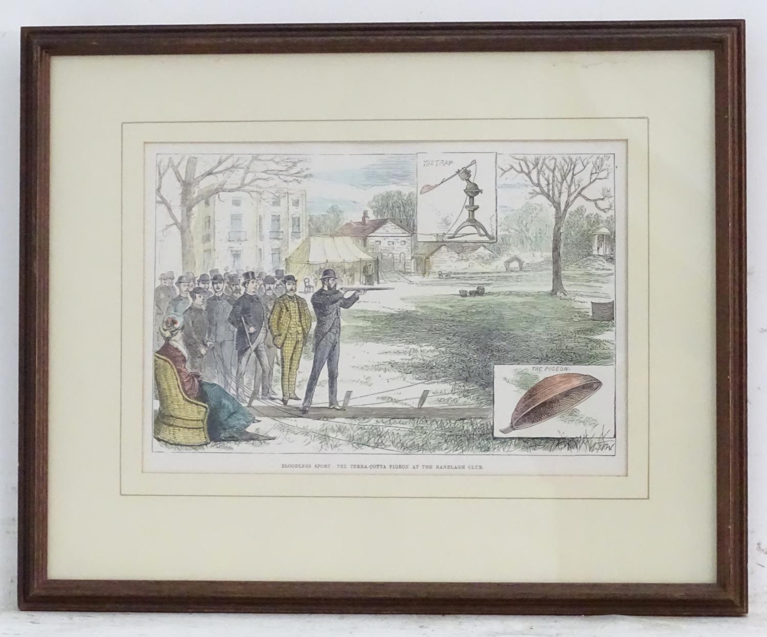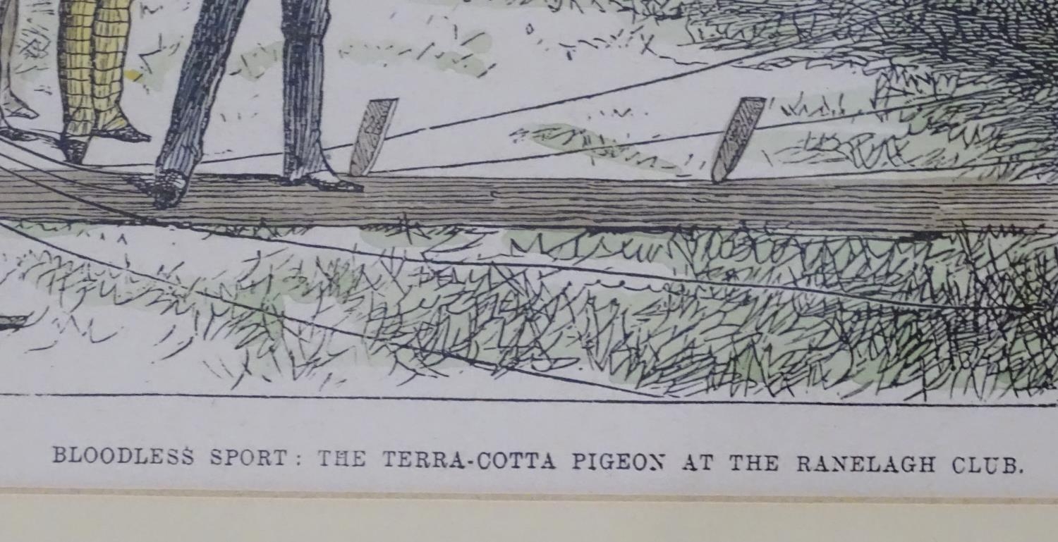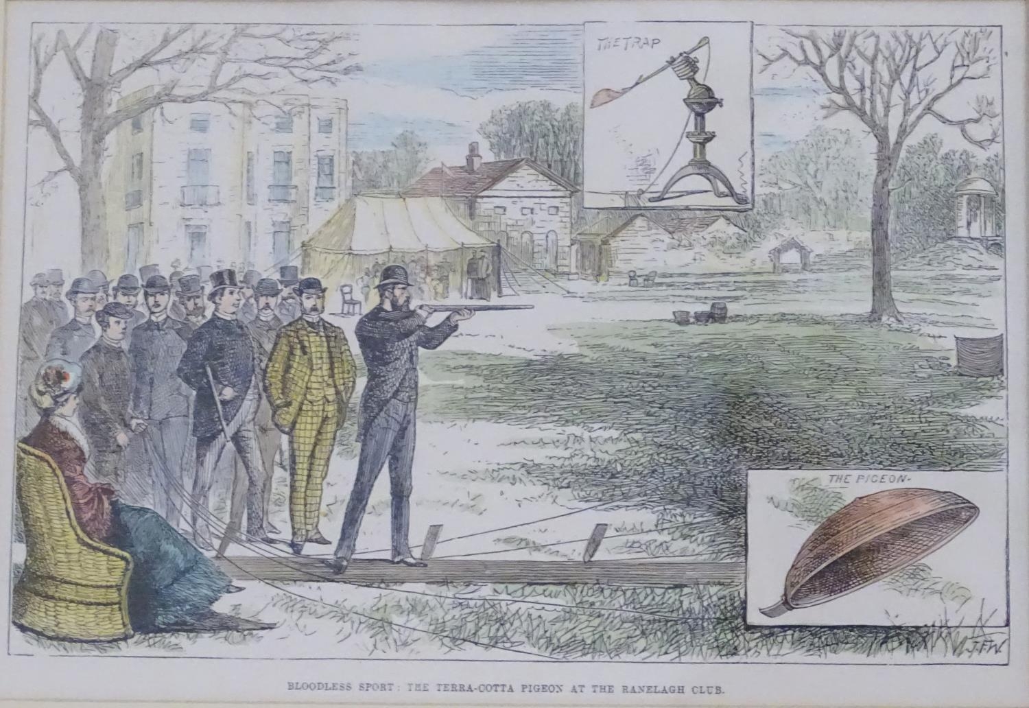 After J. F. W. (XIX), Hand coloured engraving, Bloodless Sport : The Terracotta Pigeon at the Ranelagh Club, Illustrating gentlemen testing the new clay pigeon shooting trap, also known as clay target shooting, and formally known as Inanimate Bird Shooting. Titled under. Approx. 6" x 9"