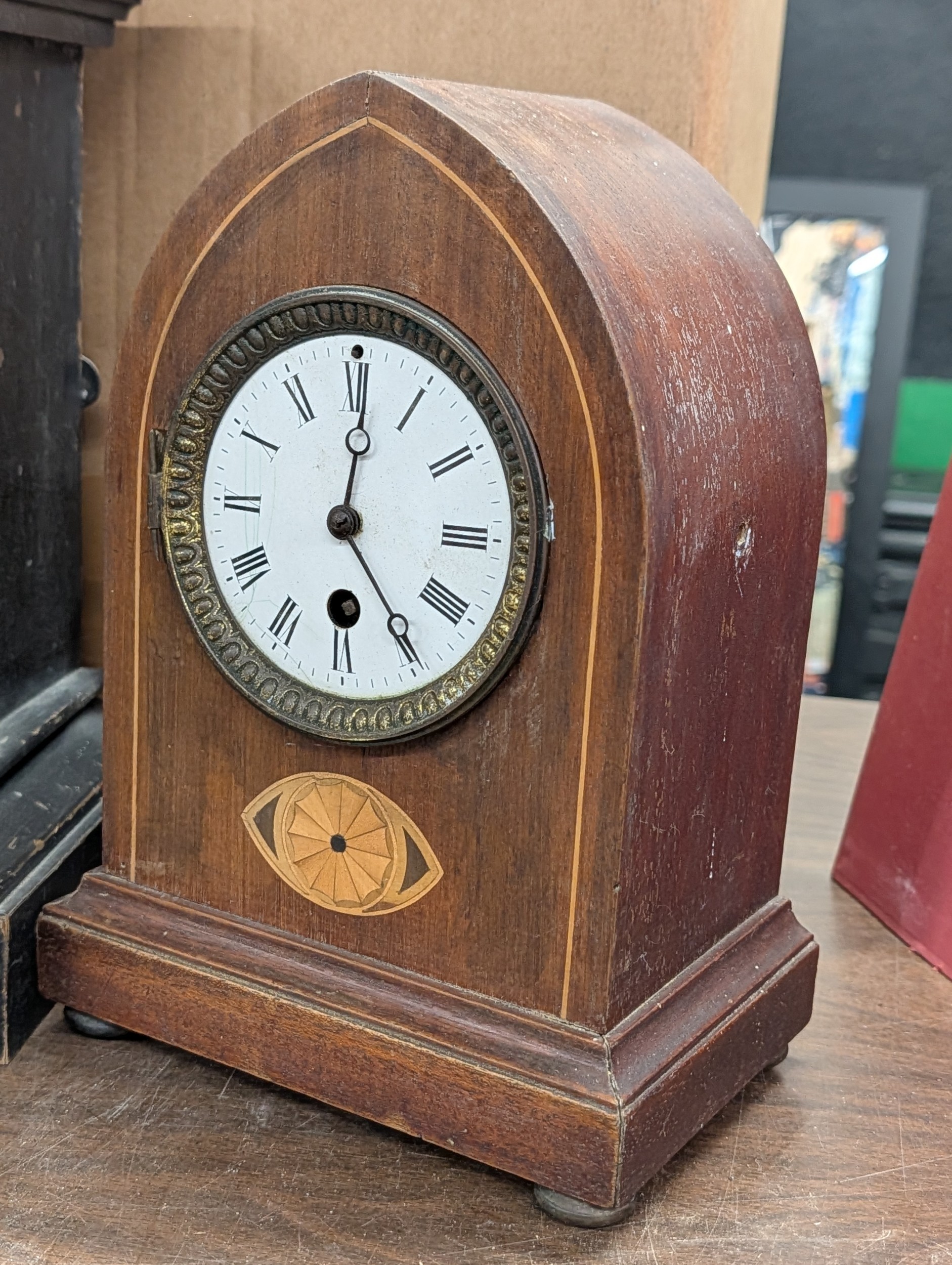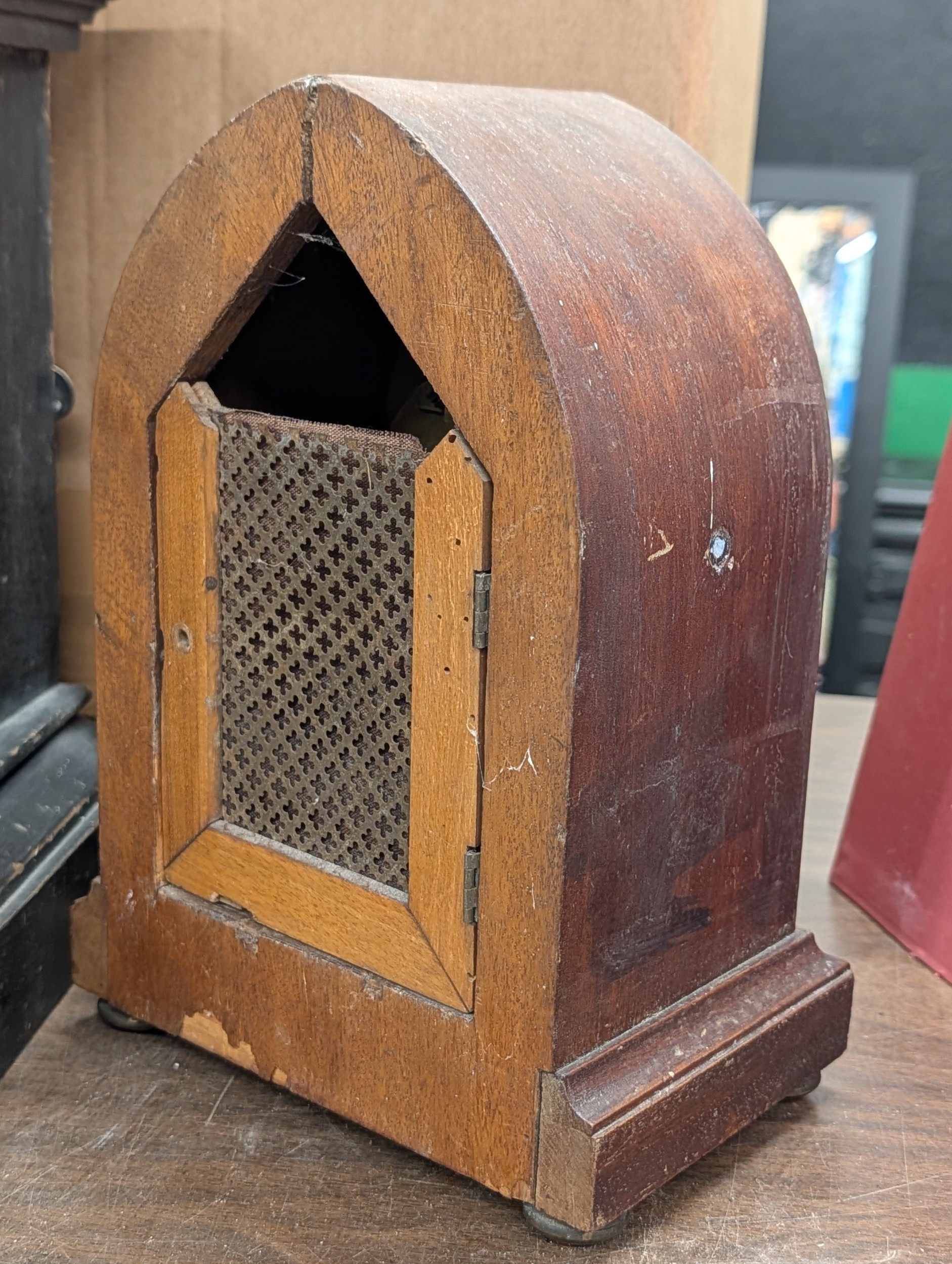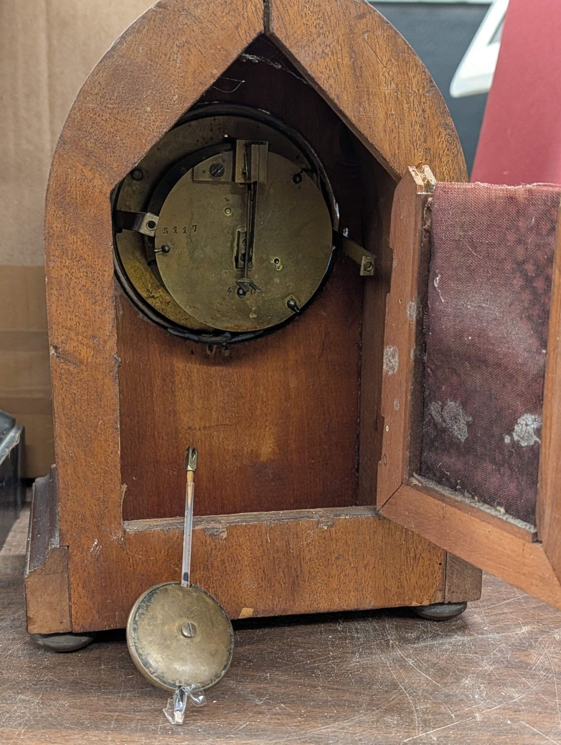 Two Antique Wooden Mantel Clocks including a Junghans Ebonized Architectural Clock and a Gothic Revival Mahogany Clock, Both offered for restoration