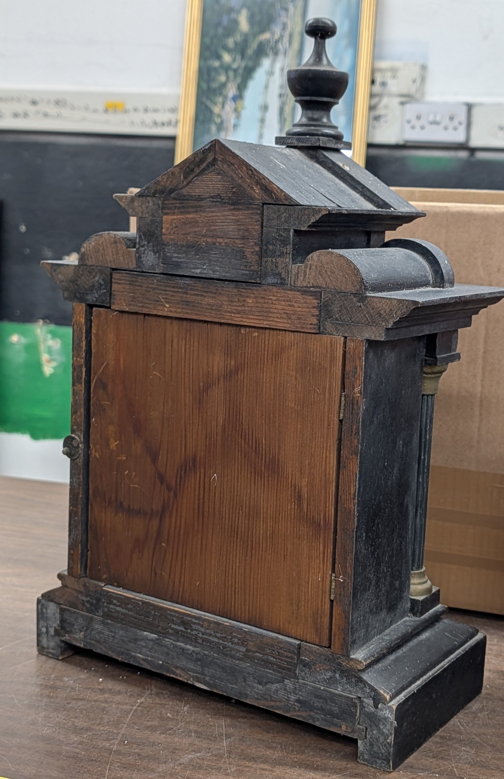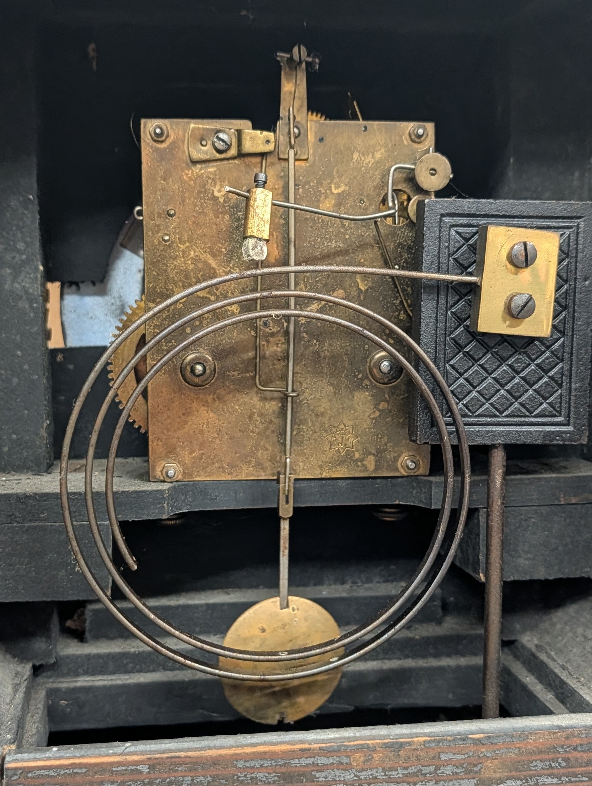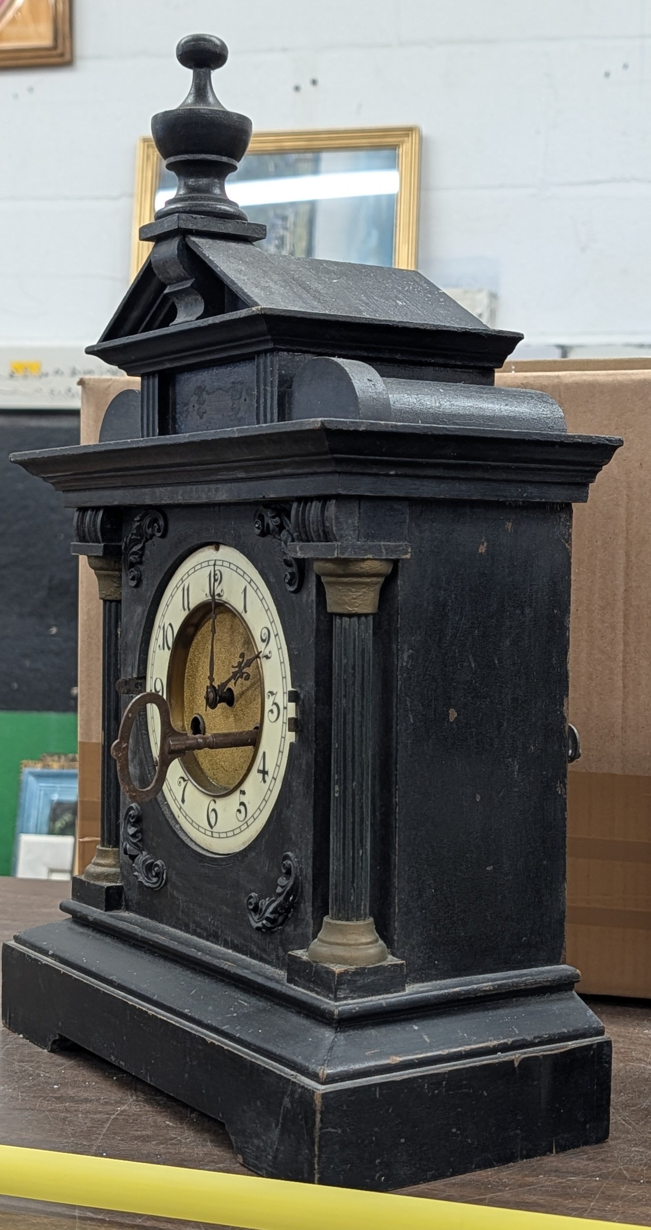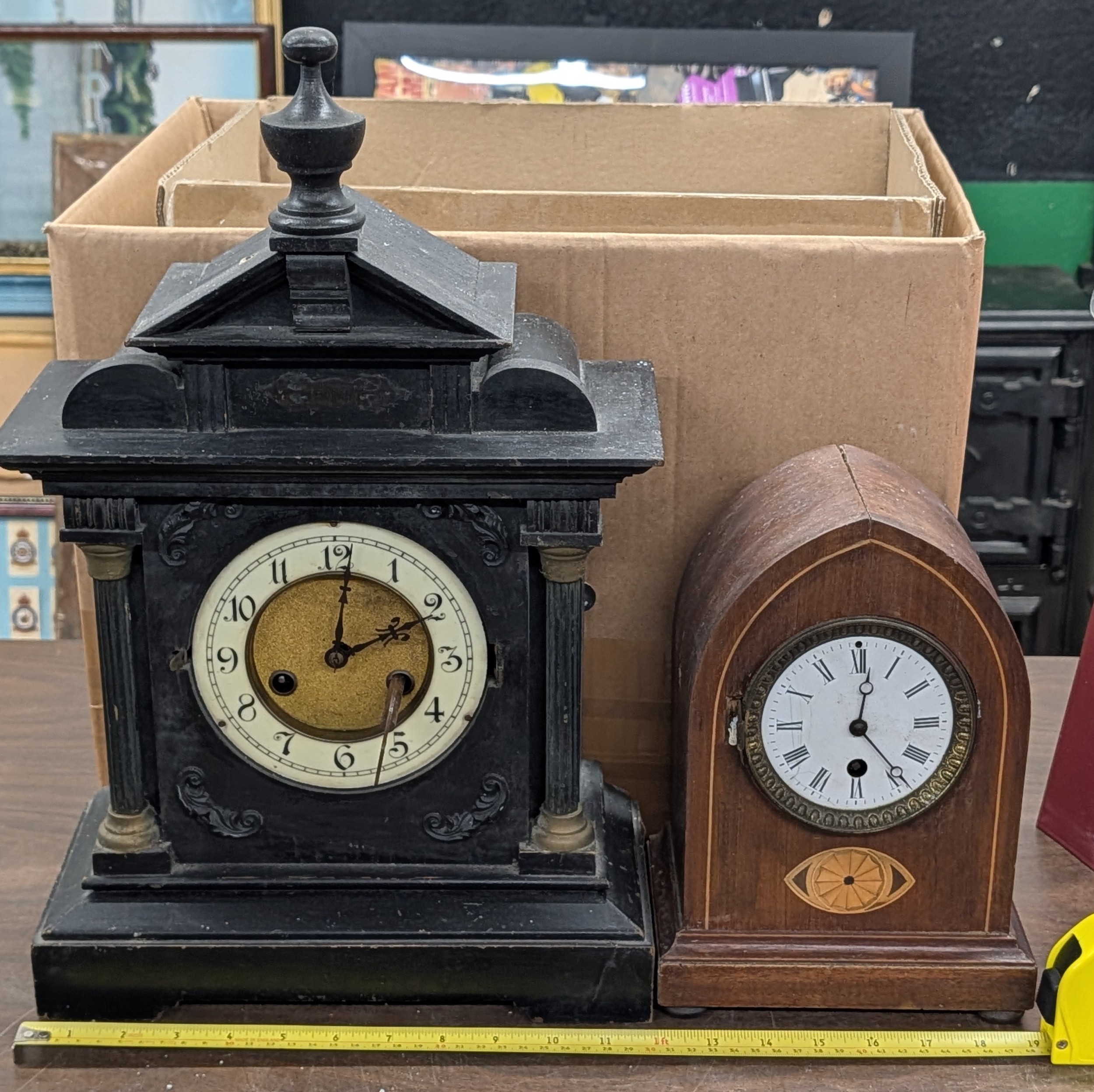 Two Antique Wooden Mantel Clocks including a Junghans Ebonized Architectural Clock and a Gothic Revival Mahogany Clock, Both offered for restoration