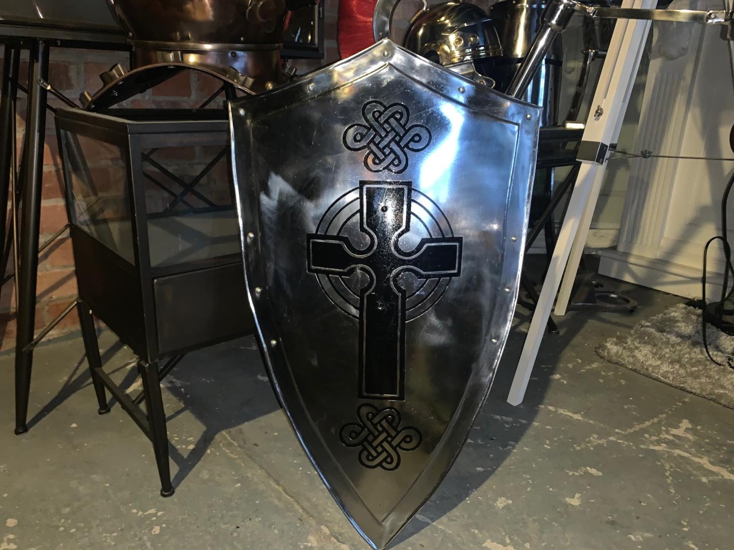 NEW BOXED POLISHED STEEL ROMAN CROSS ARMOUR SHIELD