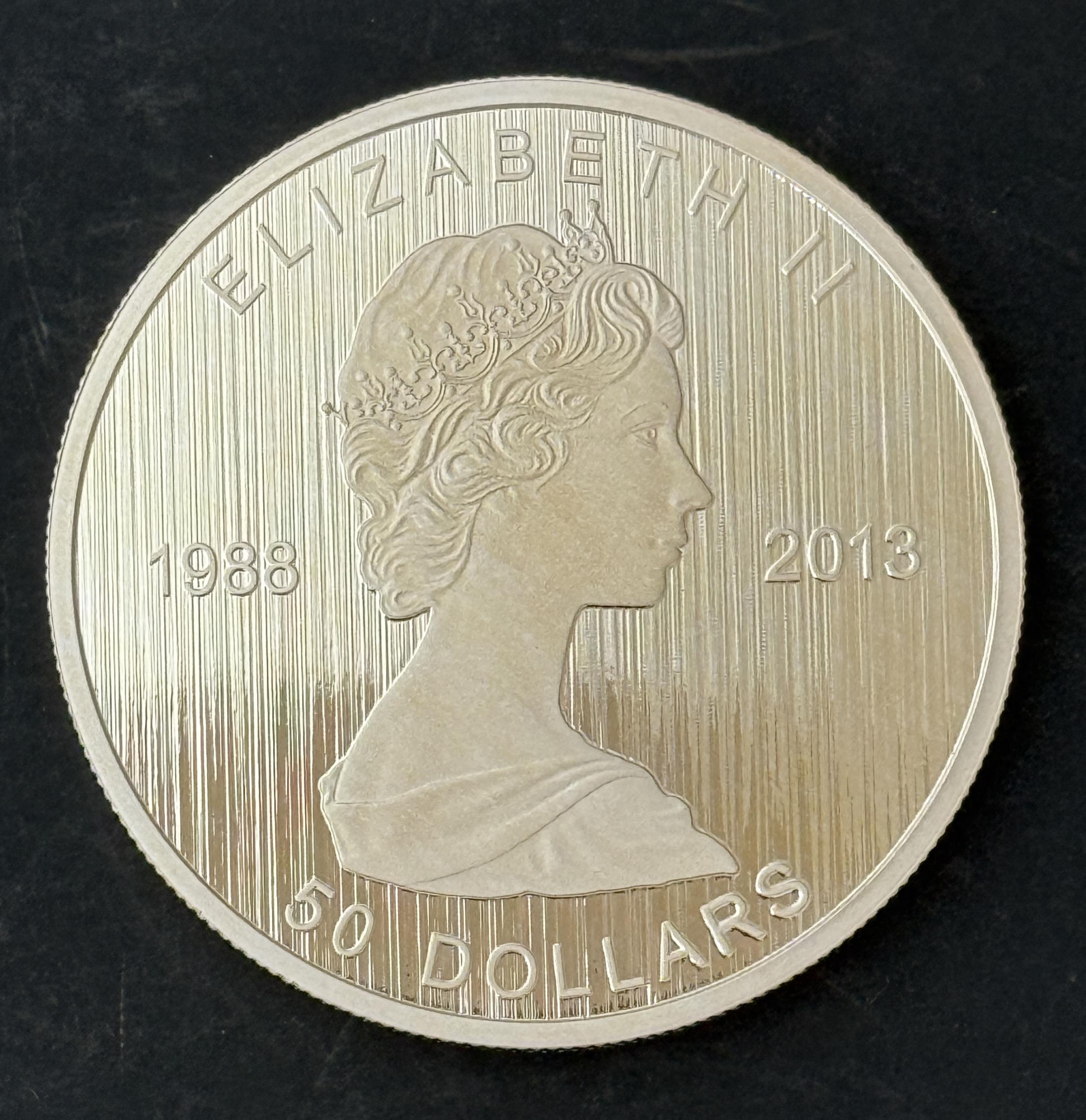 Canada 2013 25th Anniversary of the Silver Maple Leaf, $50 Silver Proof coin, struck in 99.99% fine Silver, weight 5oz (157.6g). boxed with CoA.
