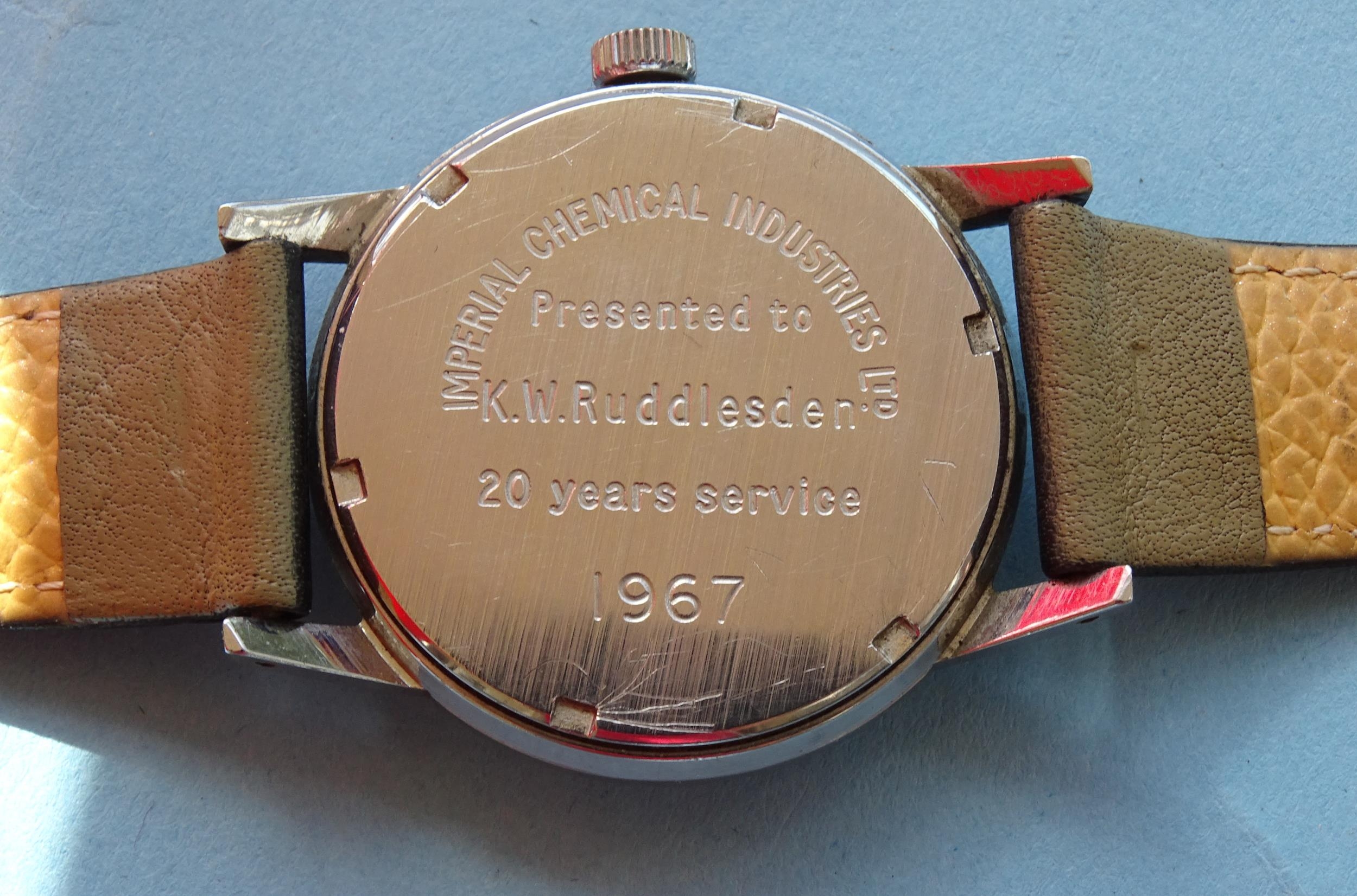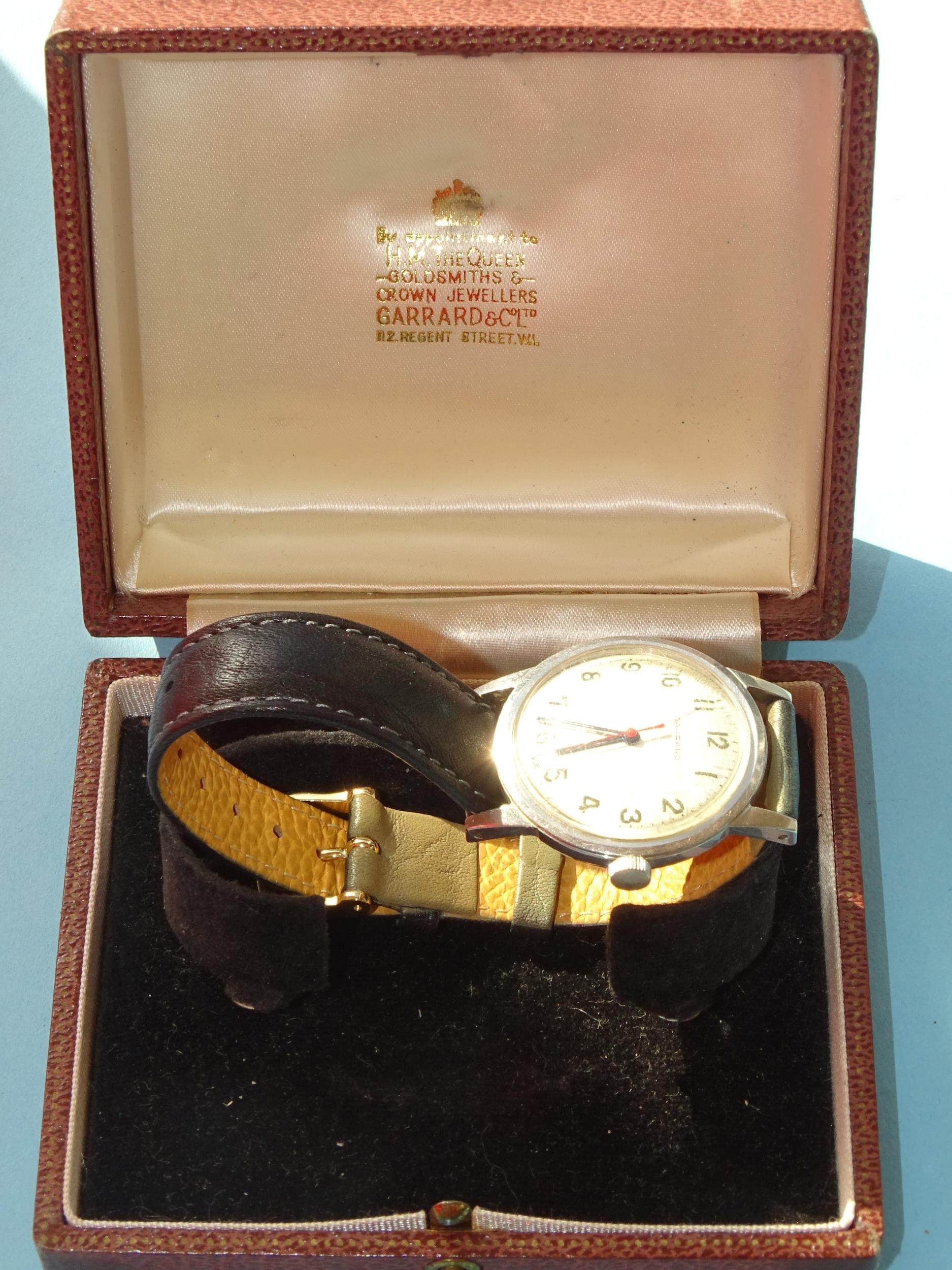 Garrard, a gentleman's steel-cased manual wind wrist watch, the silvered dial with Arabic numerals, inscription dated 1967 to back, 33mm diameter, (working, no guarantee on time-keeping), in Garrard box.