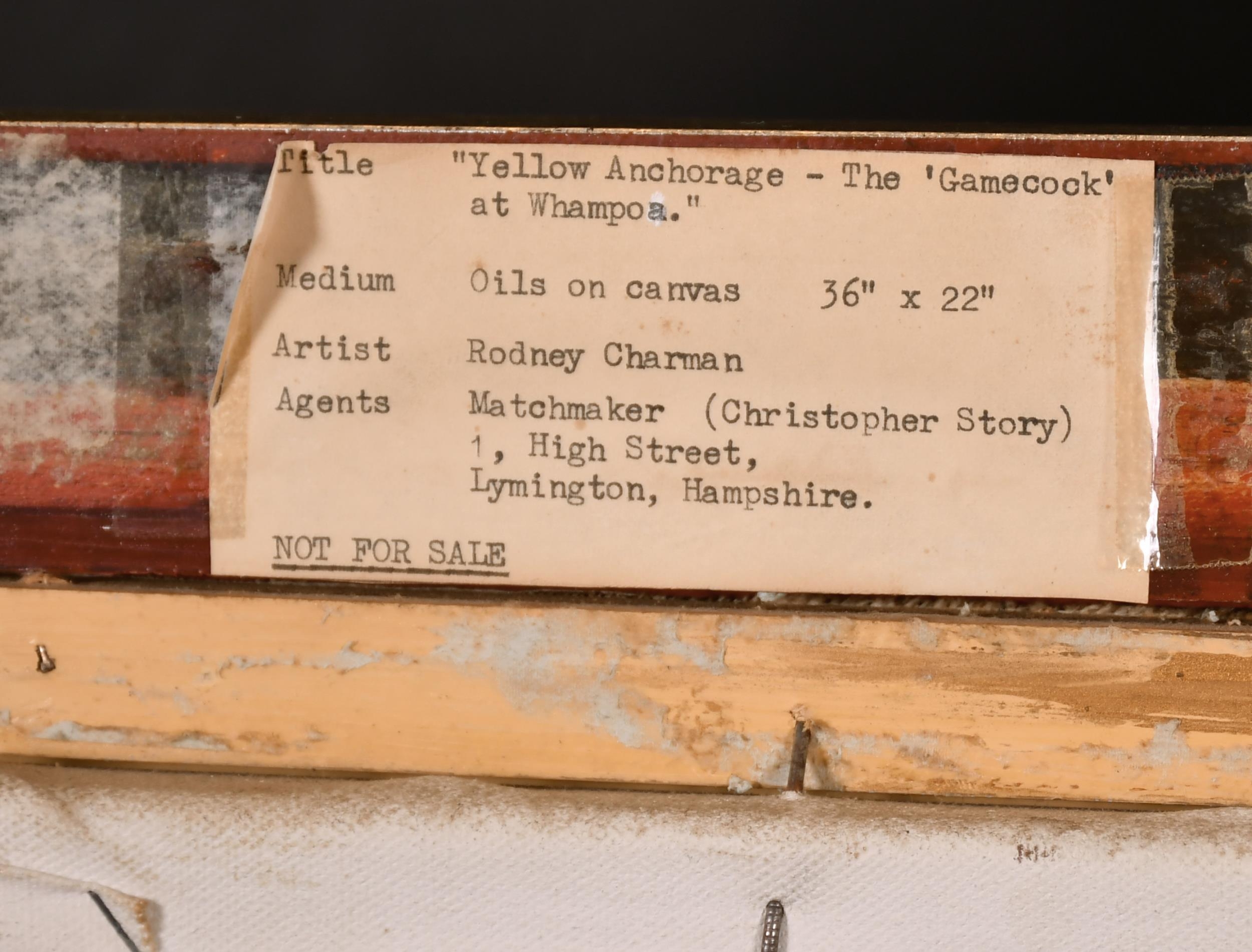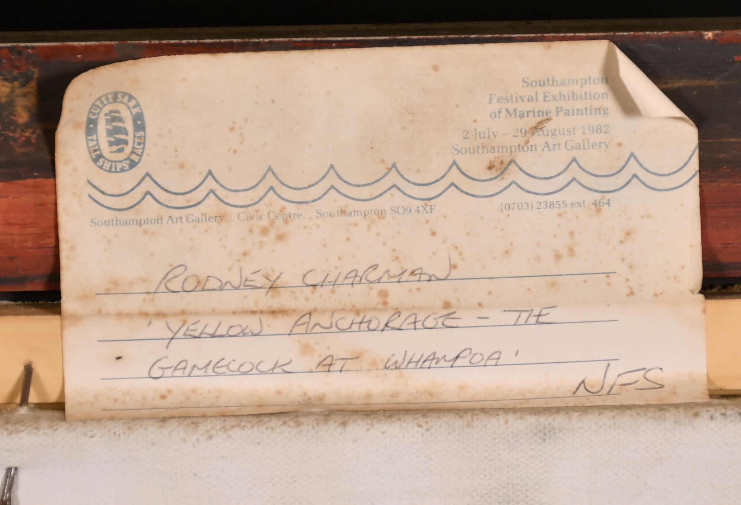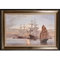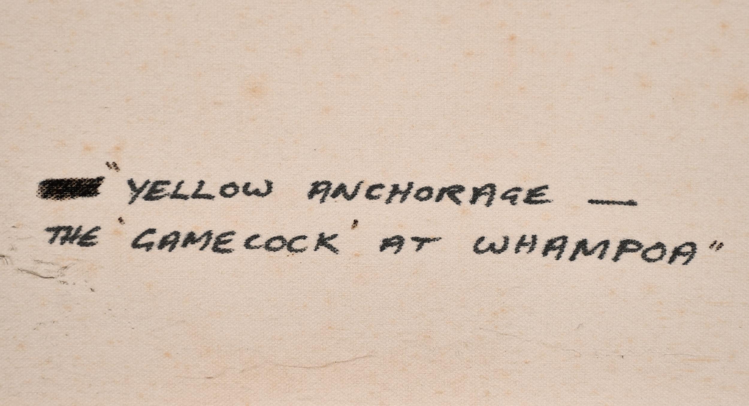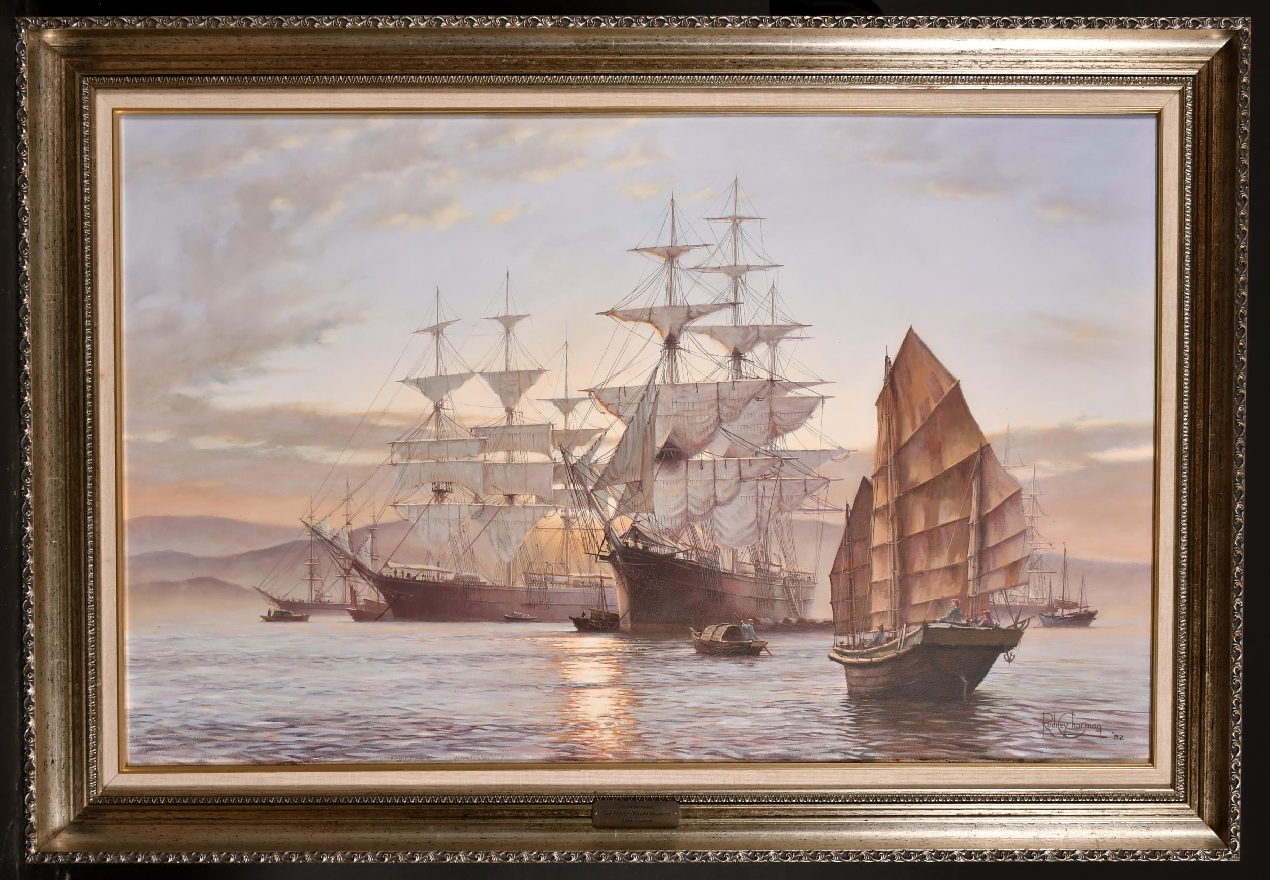 Rodney John Keith Charman (1944- ) British. "Yellow Anchorage, The Gamecock at Whampoa", Oil on Canvas, Signed and Dated '82, and Inscribed verso and Inscribed on two labels verso, 22" x 36" (55.8 x 91.5cm)