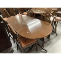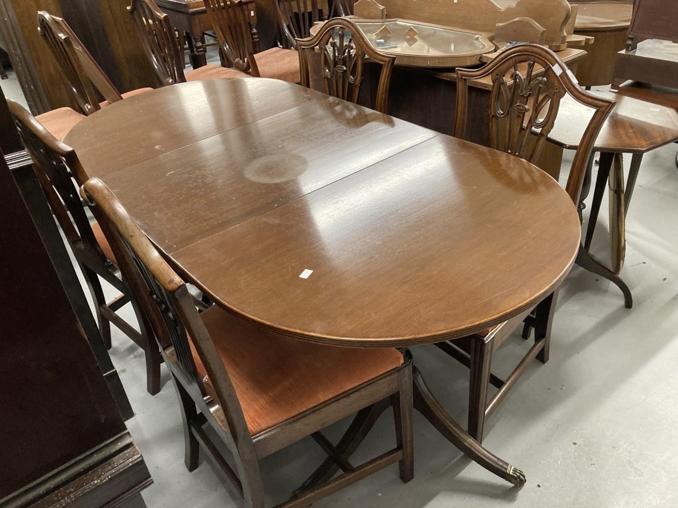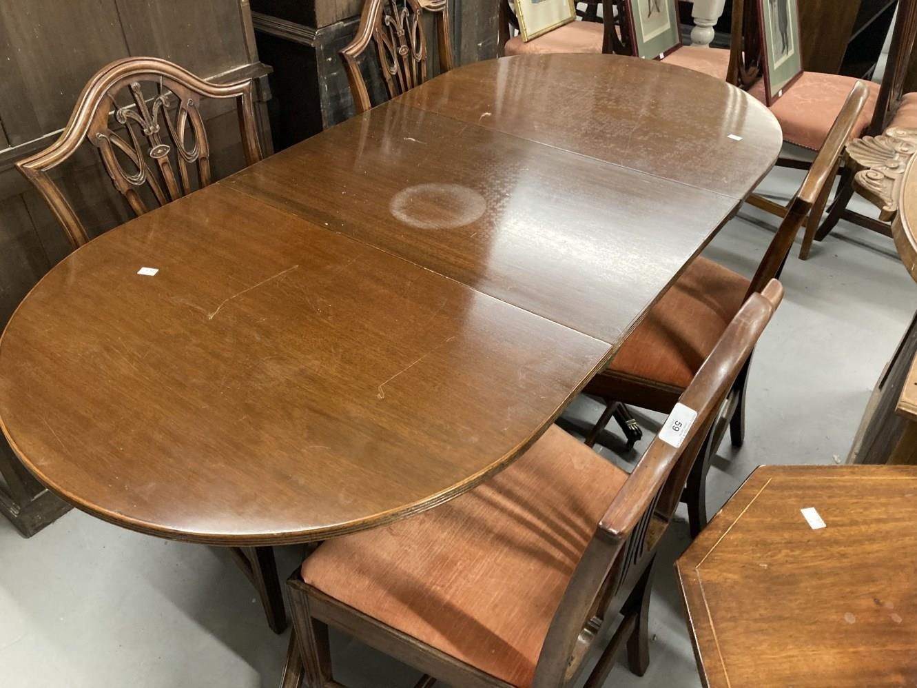 Early/mid 20th cent. Regency revival small mahogany extending dining table on turned supports on tripod feet with claw terminals, one insert leaf. 67ins. Extended. 32ins. Wide. Plus four Hepplewhite style mahogany chairs with fleur-de-lyse backs.