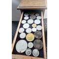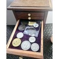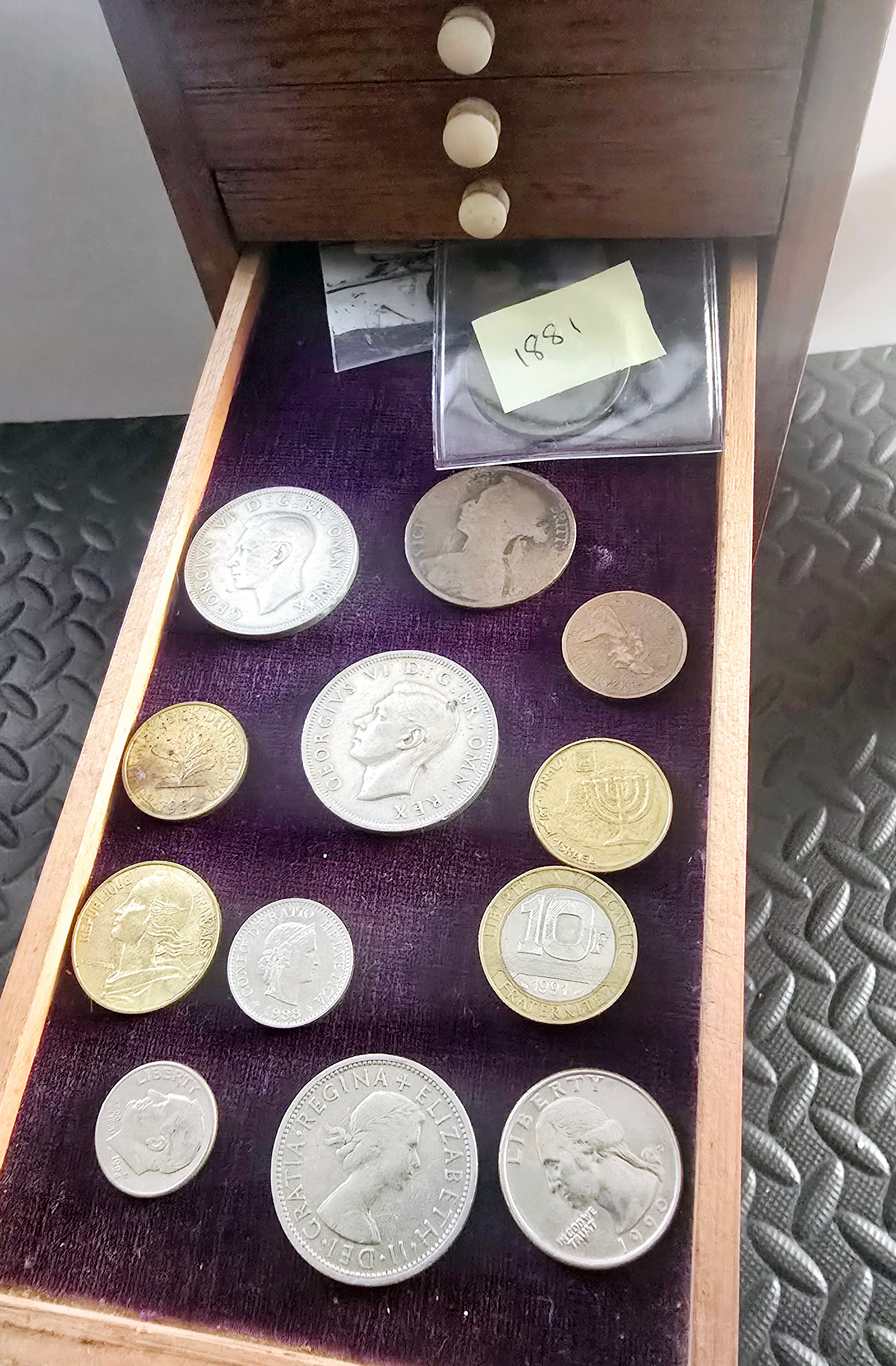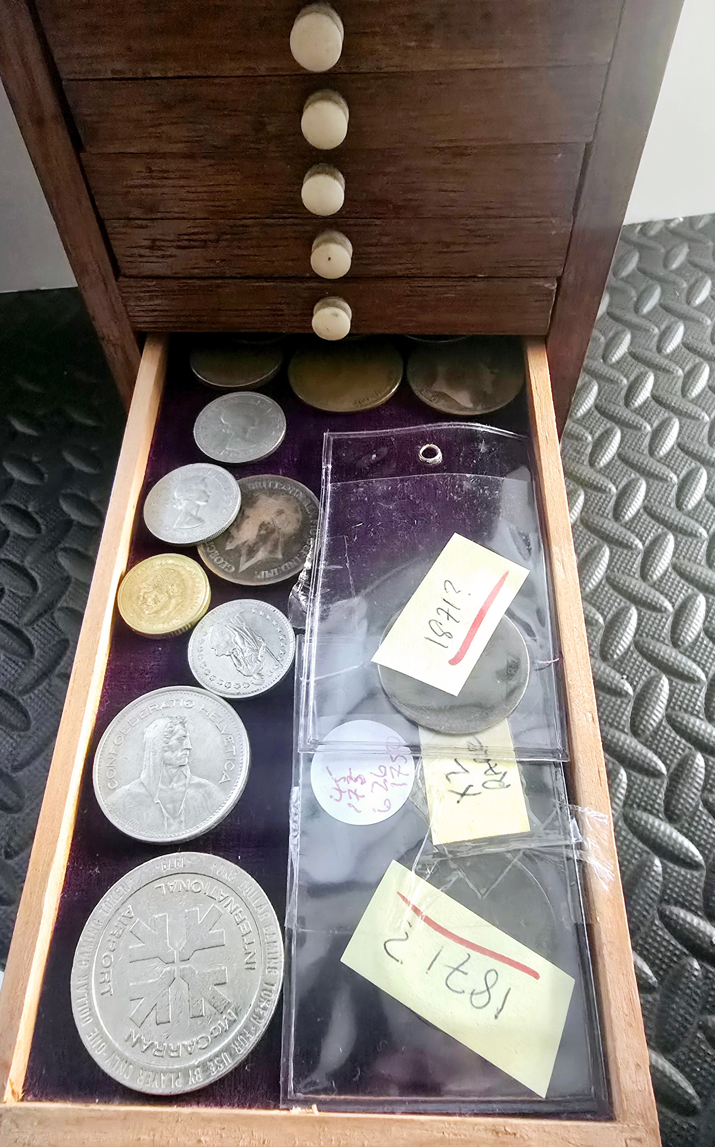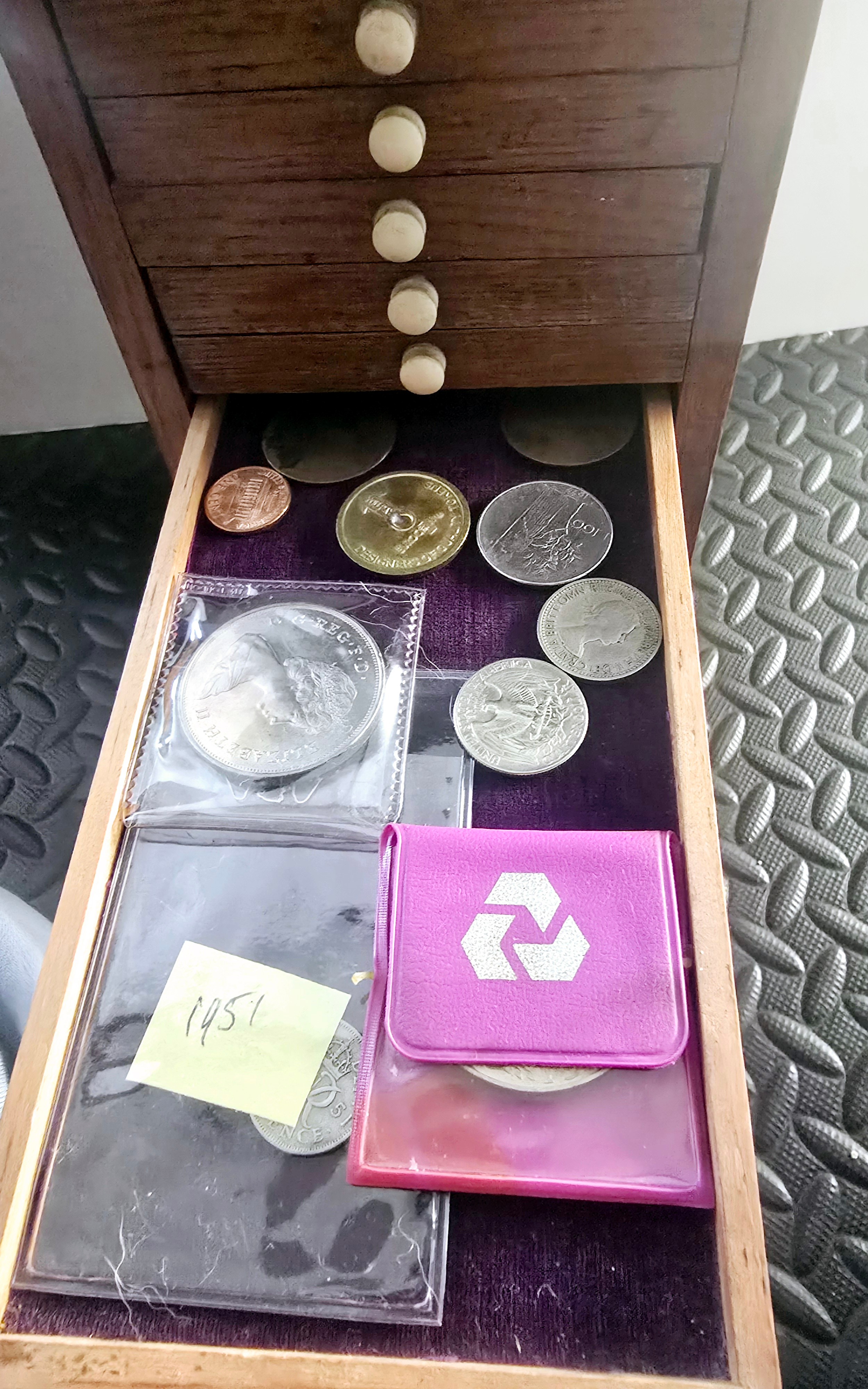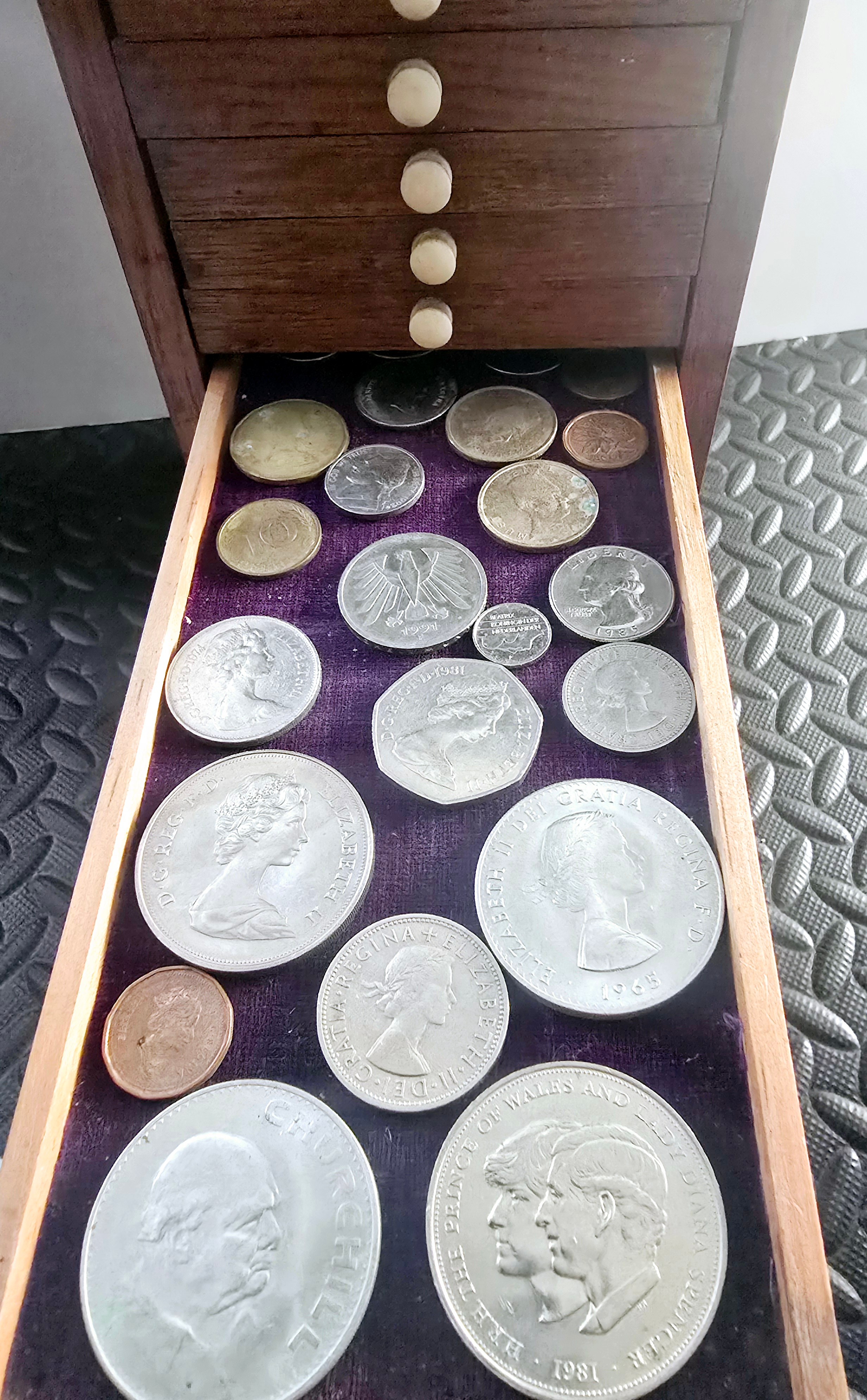 A Vintage Coin Collectors Drawer Cabinet containing a quantity of various Coins - Approx 400 coins inside drawers