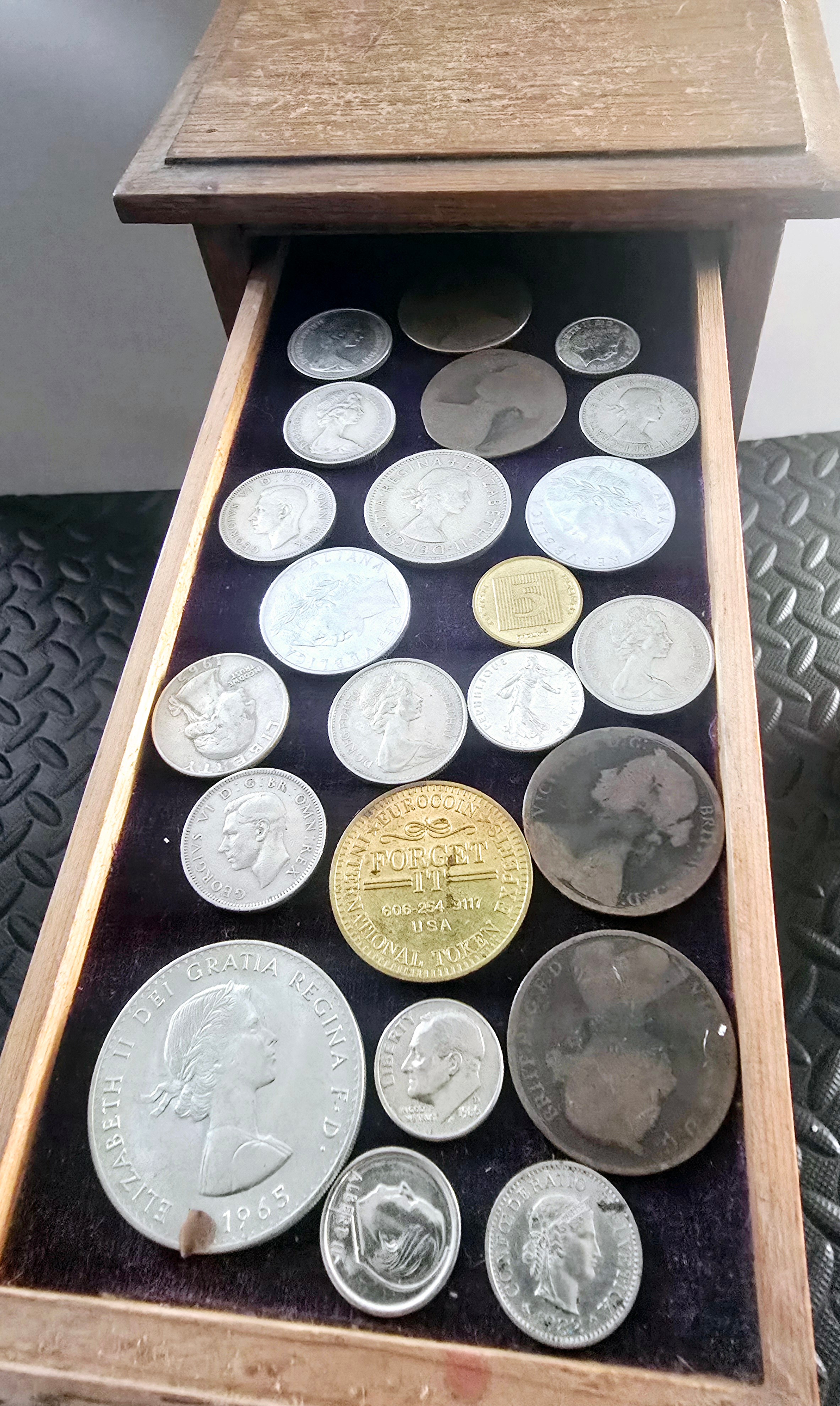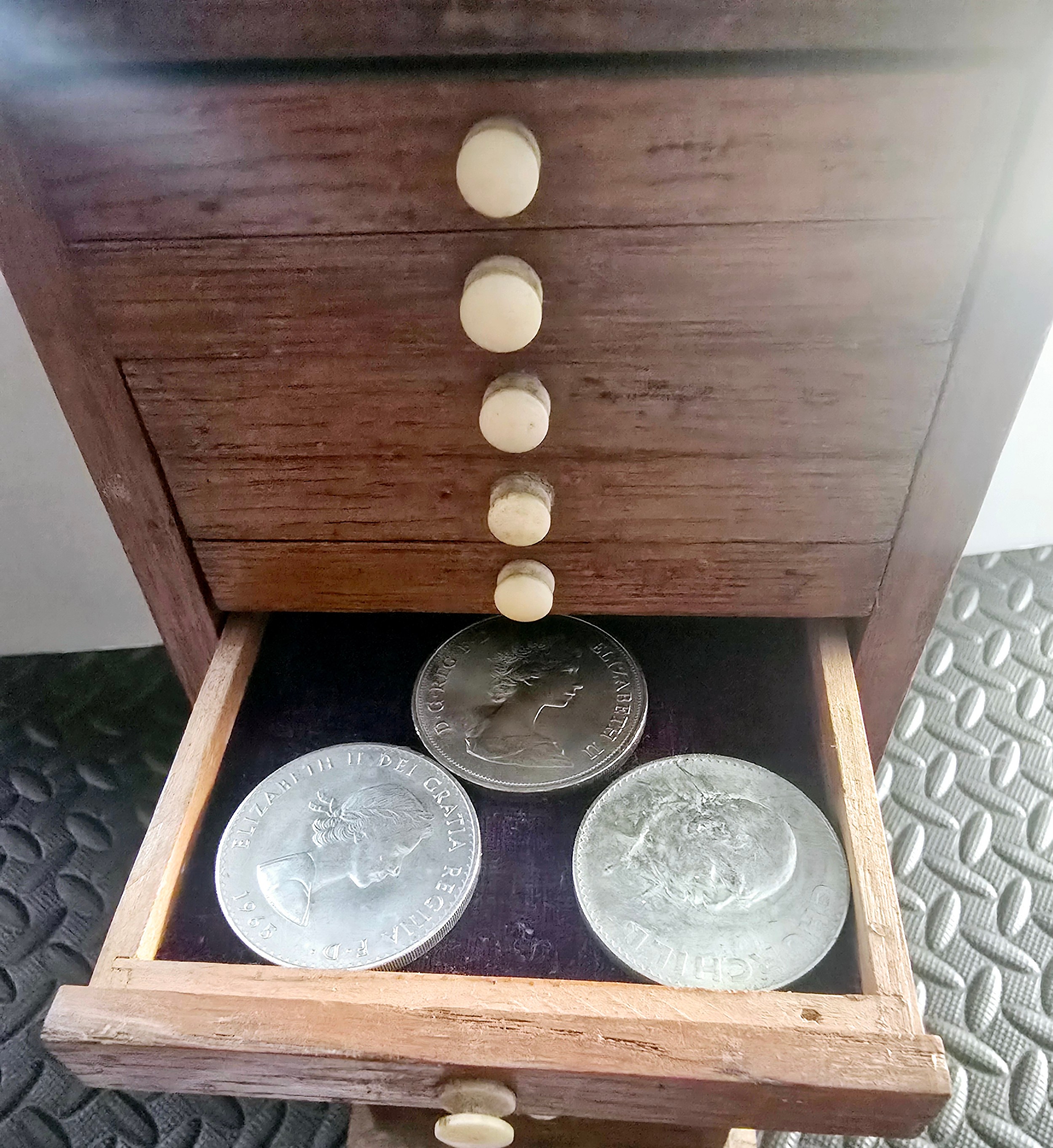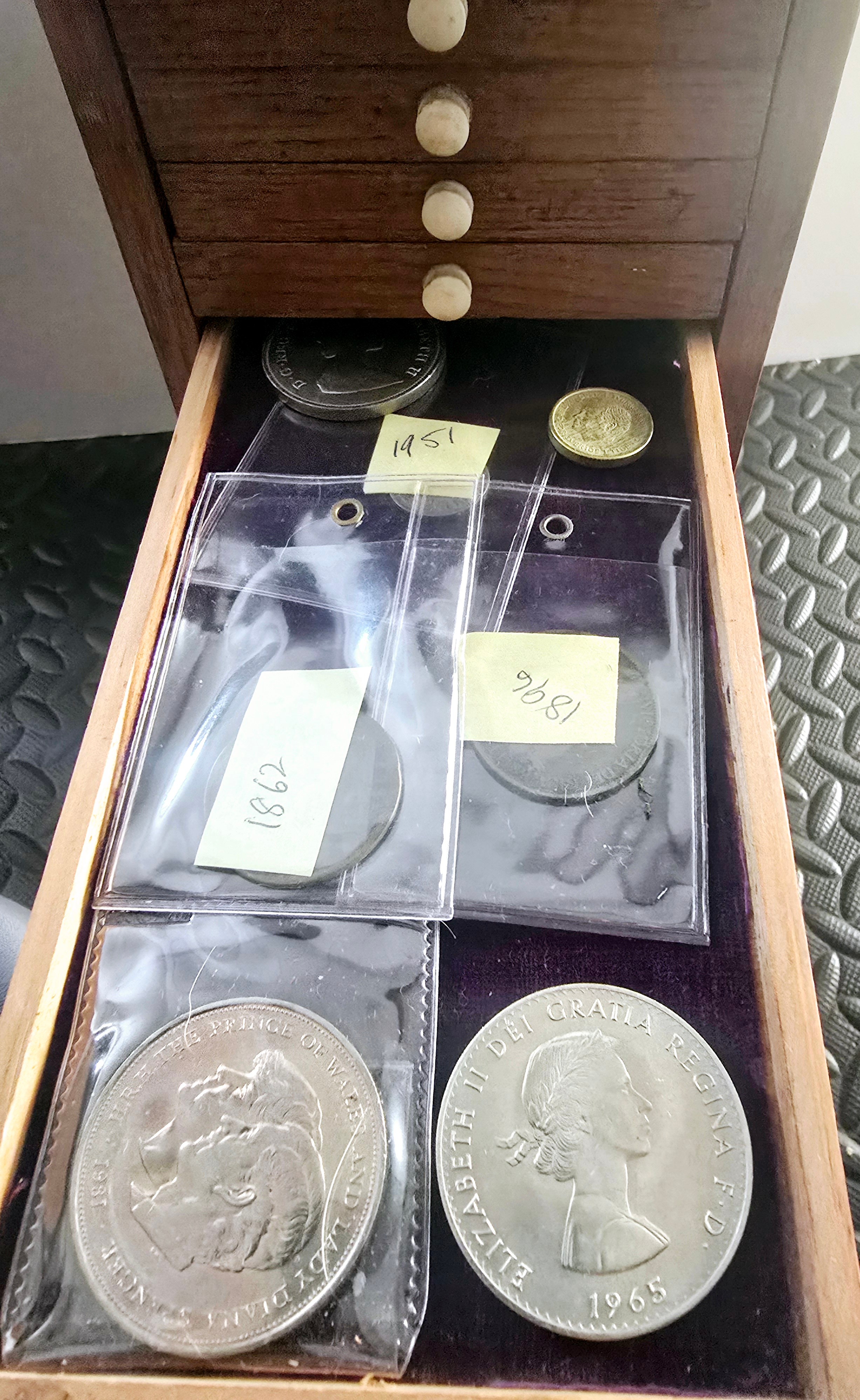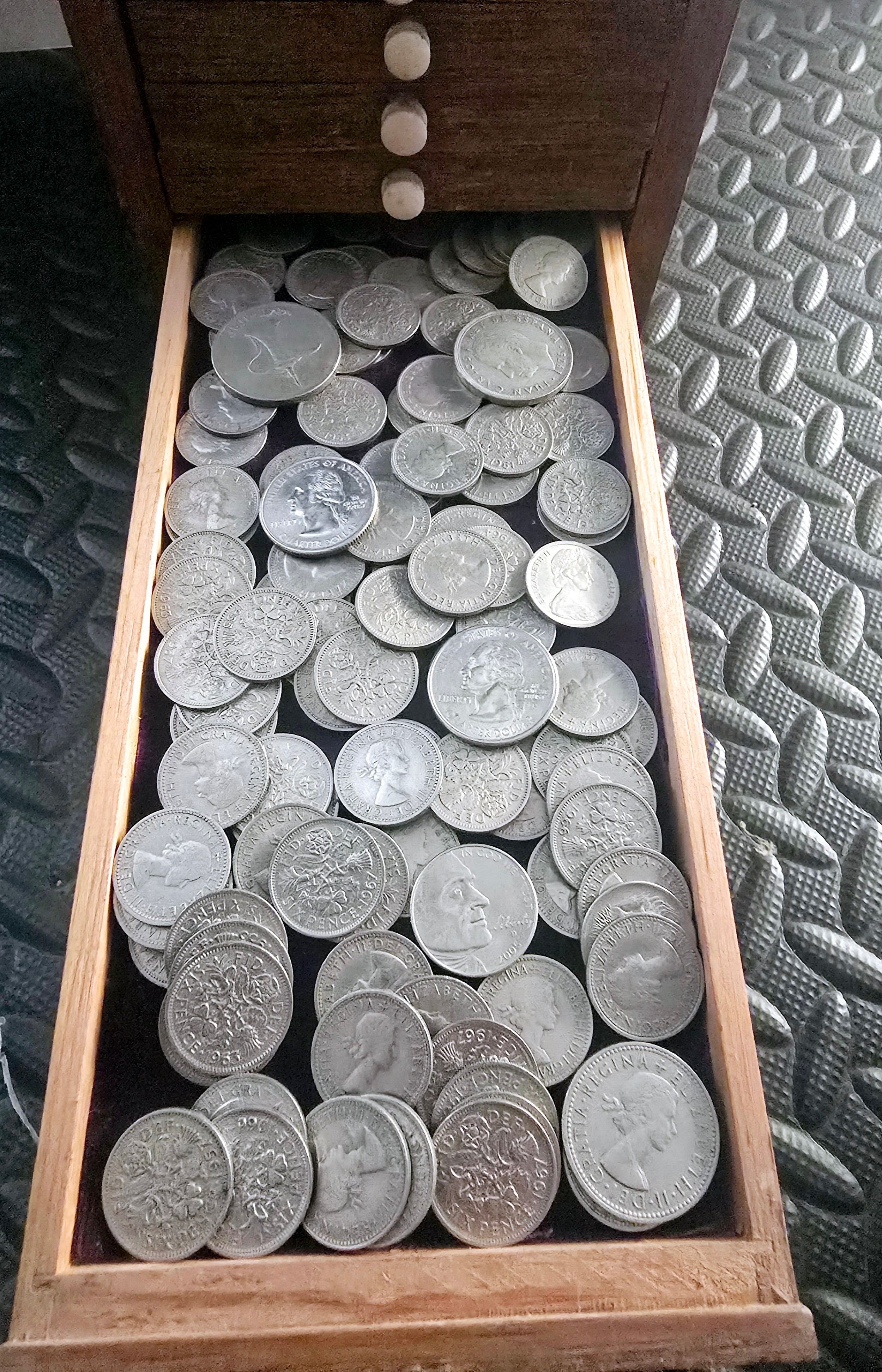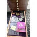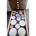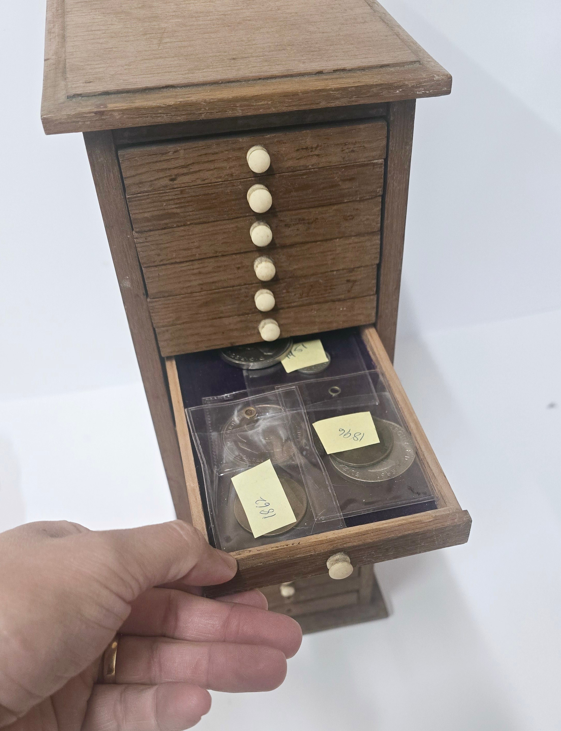 A Vintage Coin Collectors Drawer Cabinet containing a quantity of various Coins - Approx 400 coins inside drawers