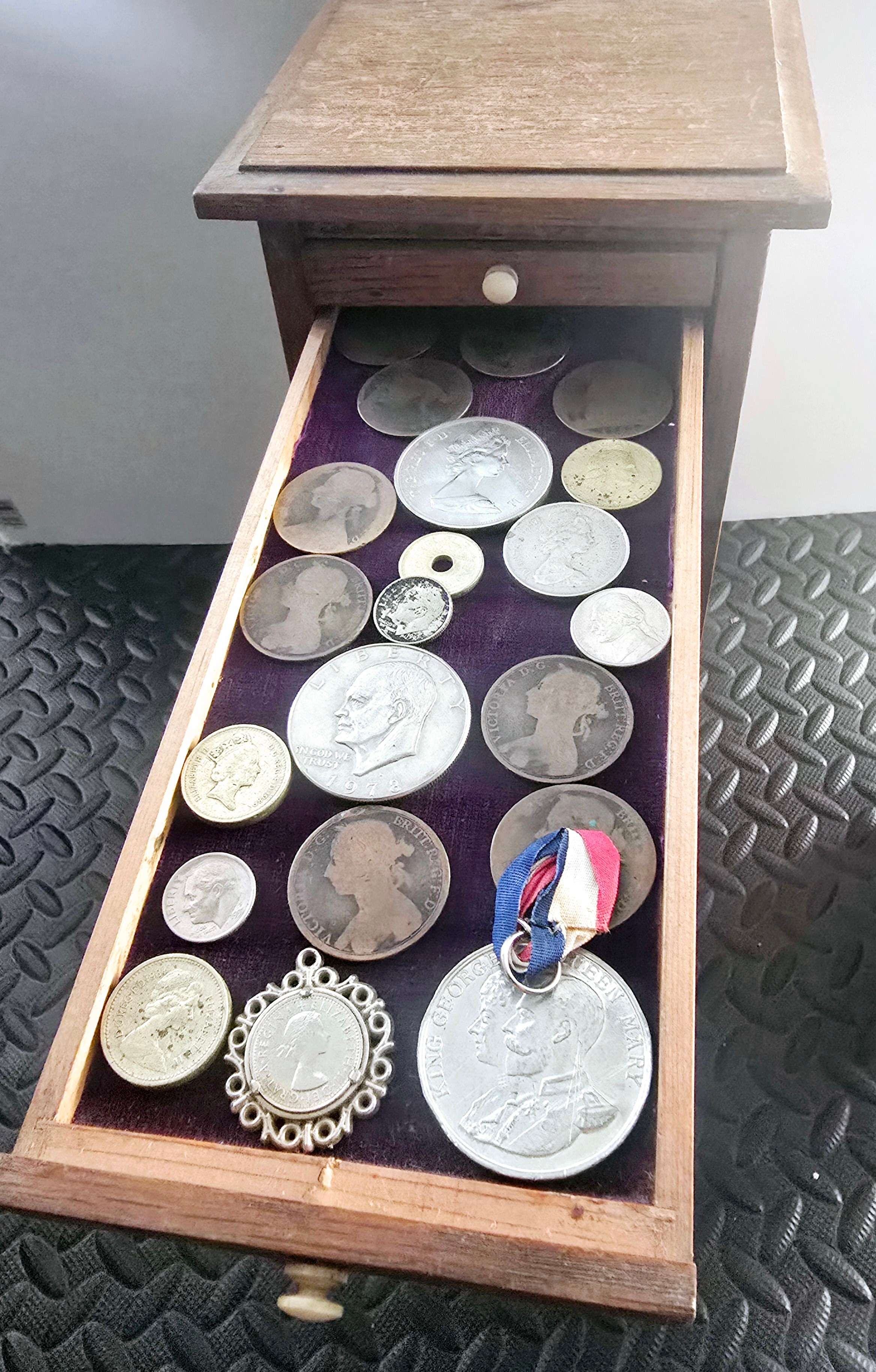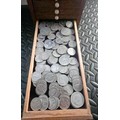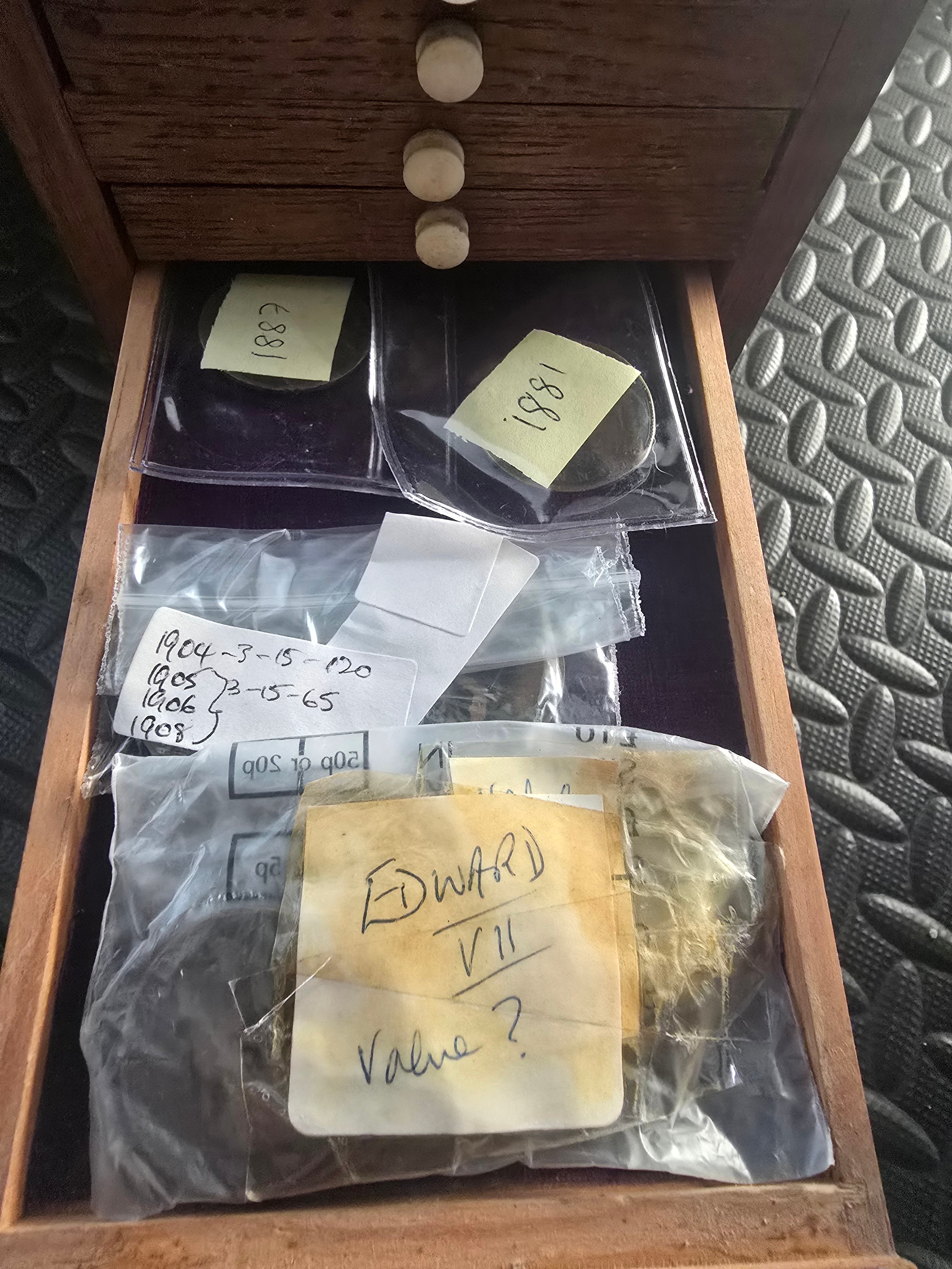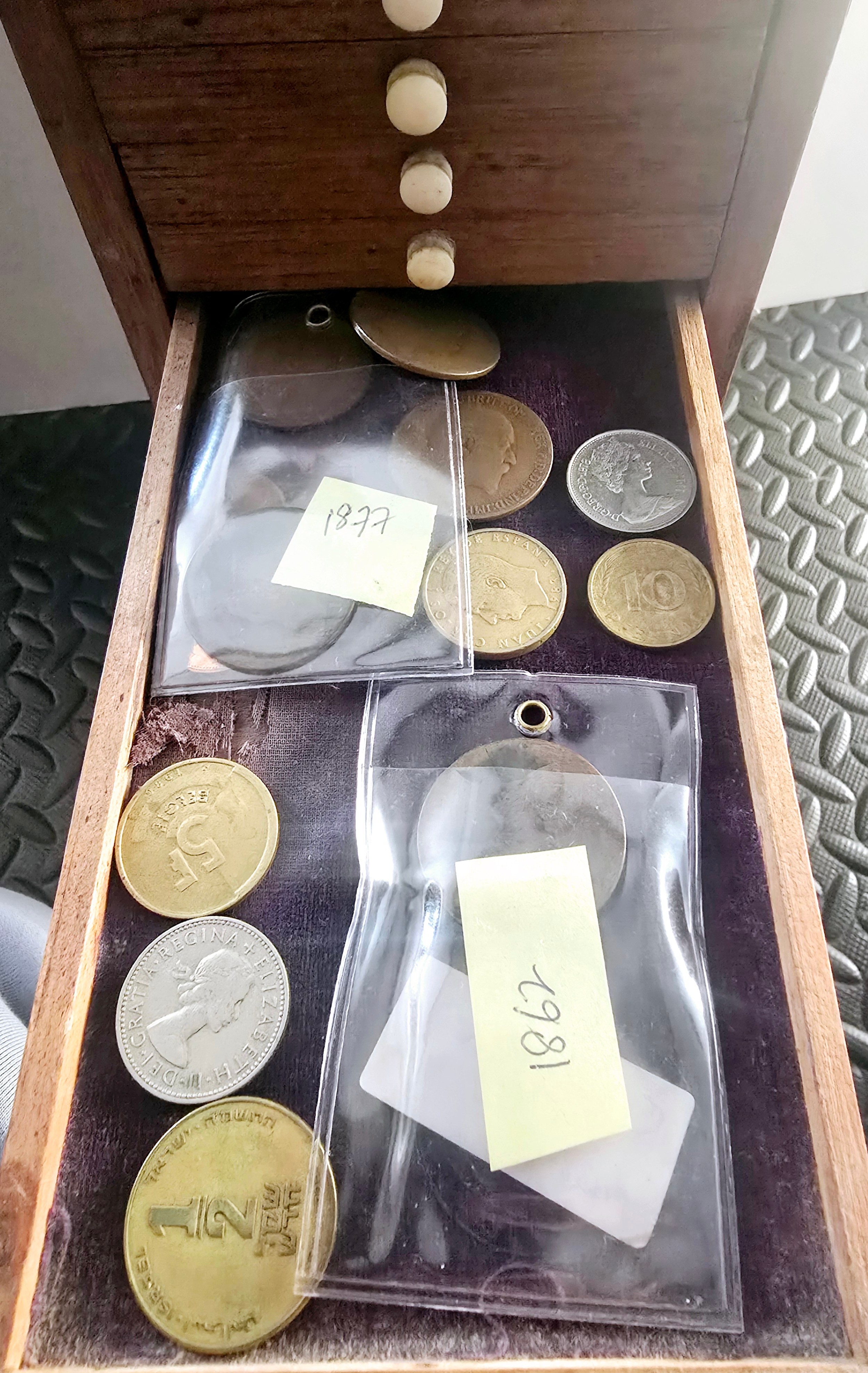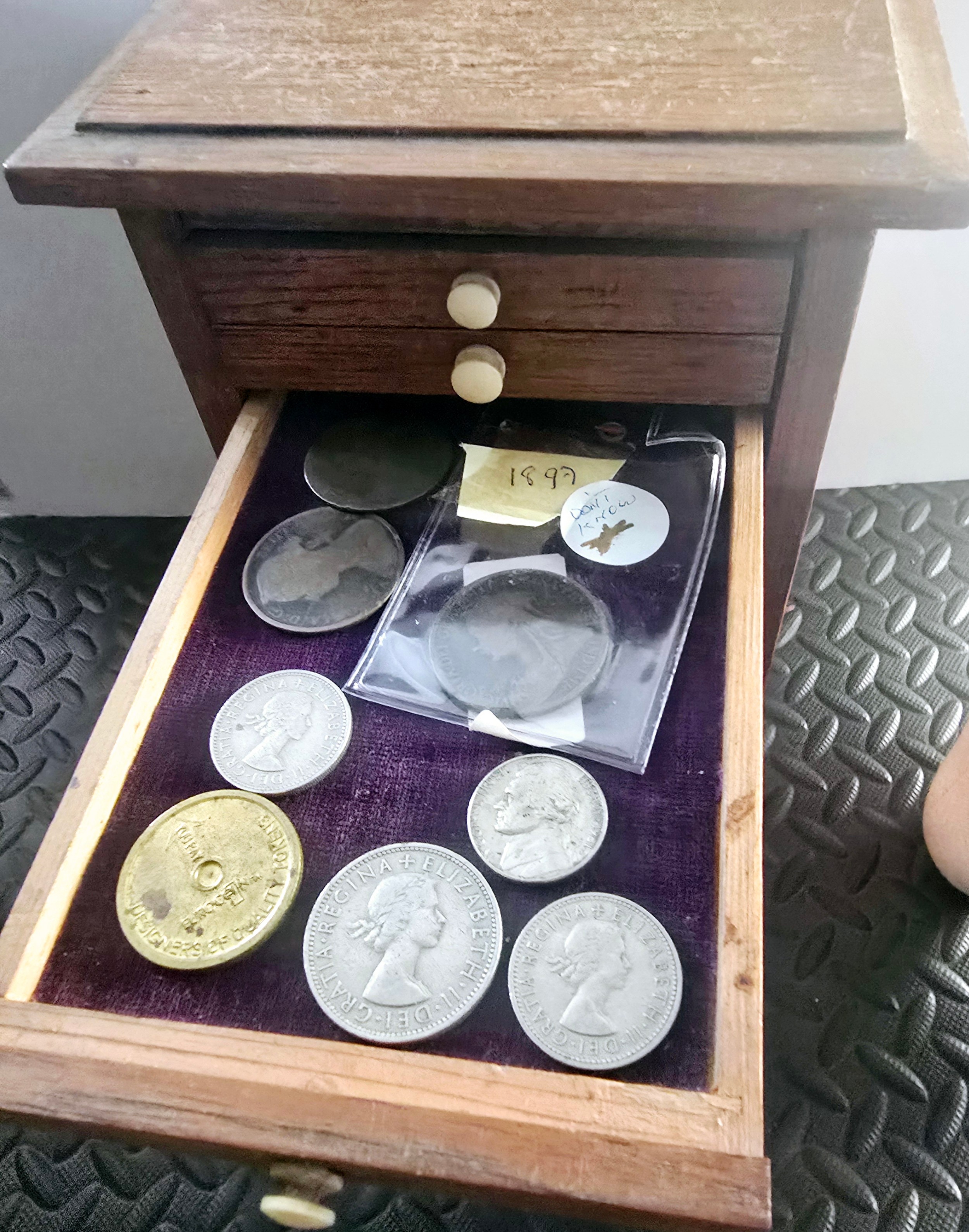 A Vintage Coin Collectors Drawer Cabinet containing a quantity of various Coins - Approx 400 coins inside drawers