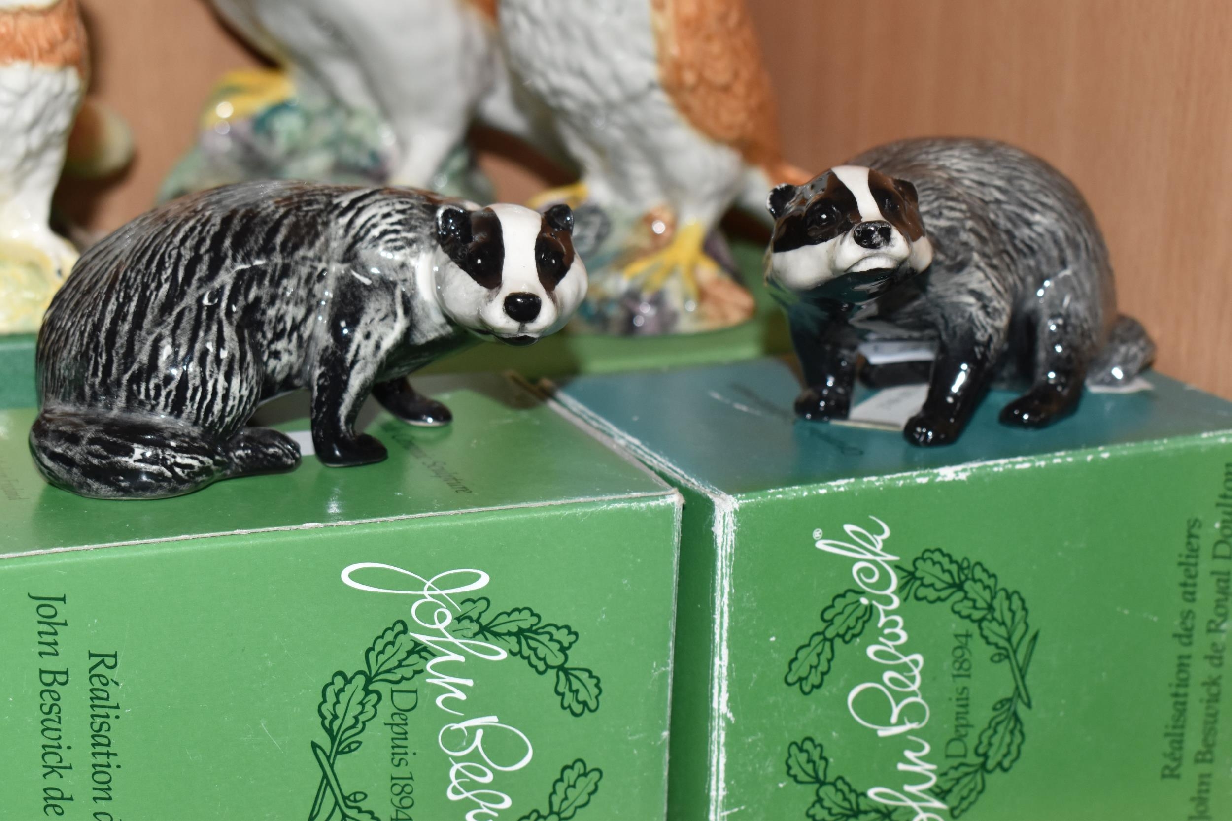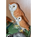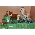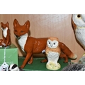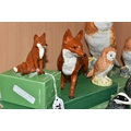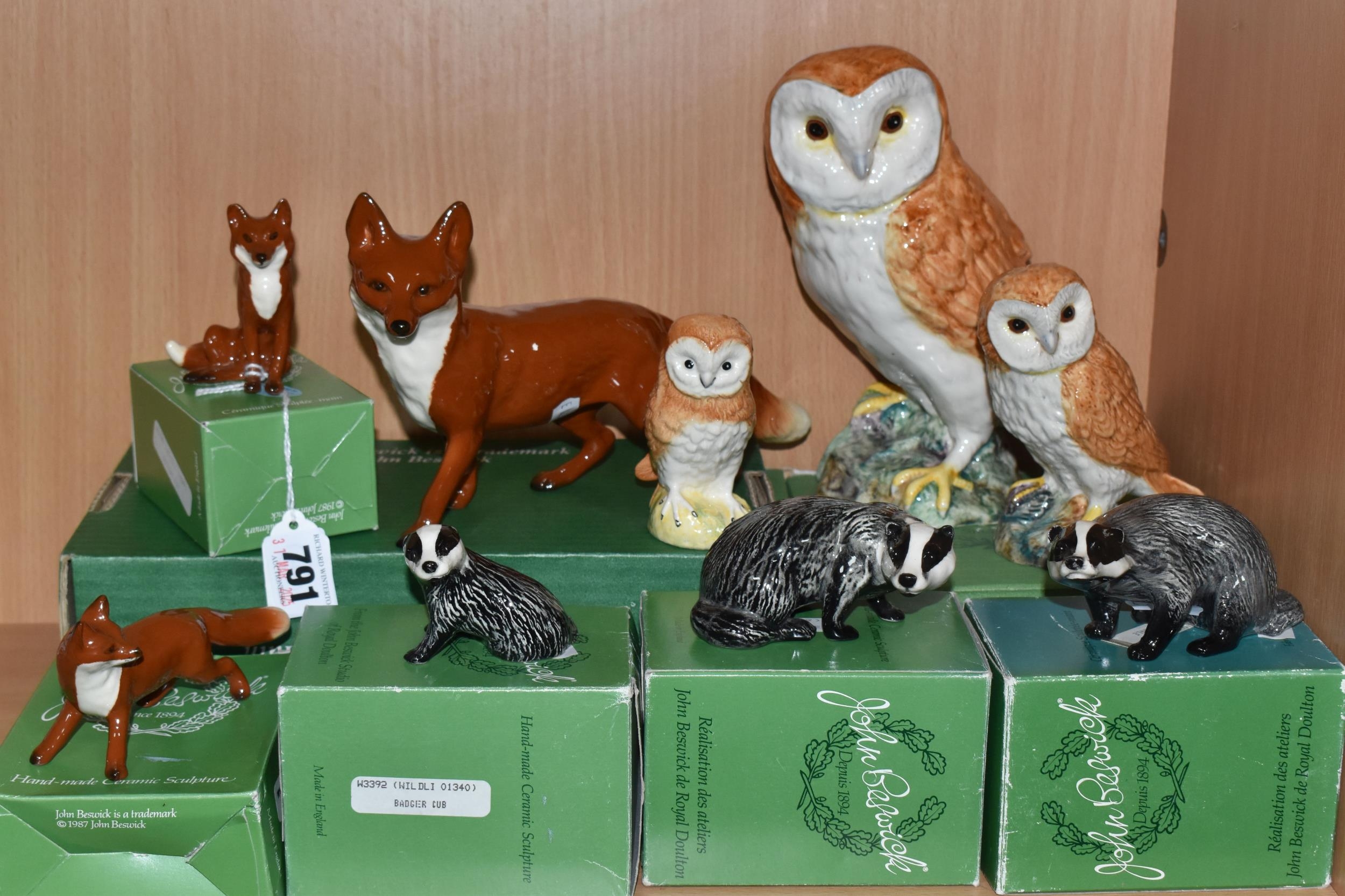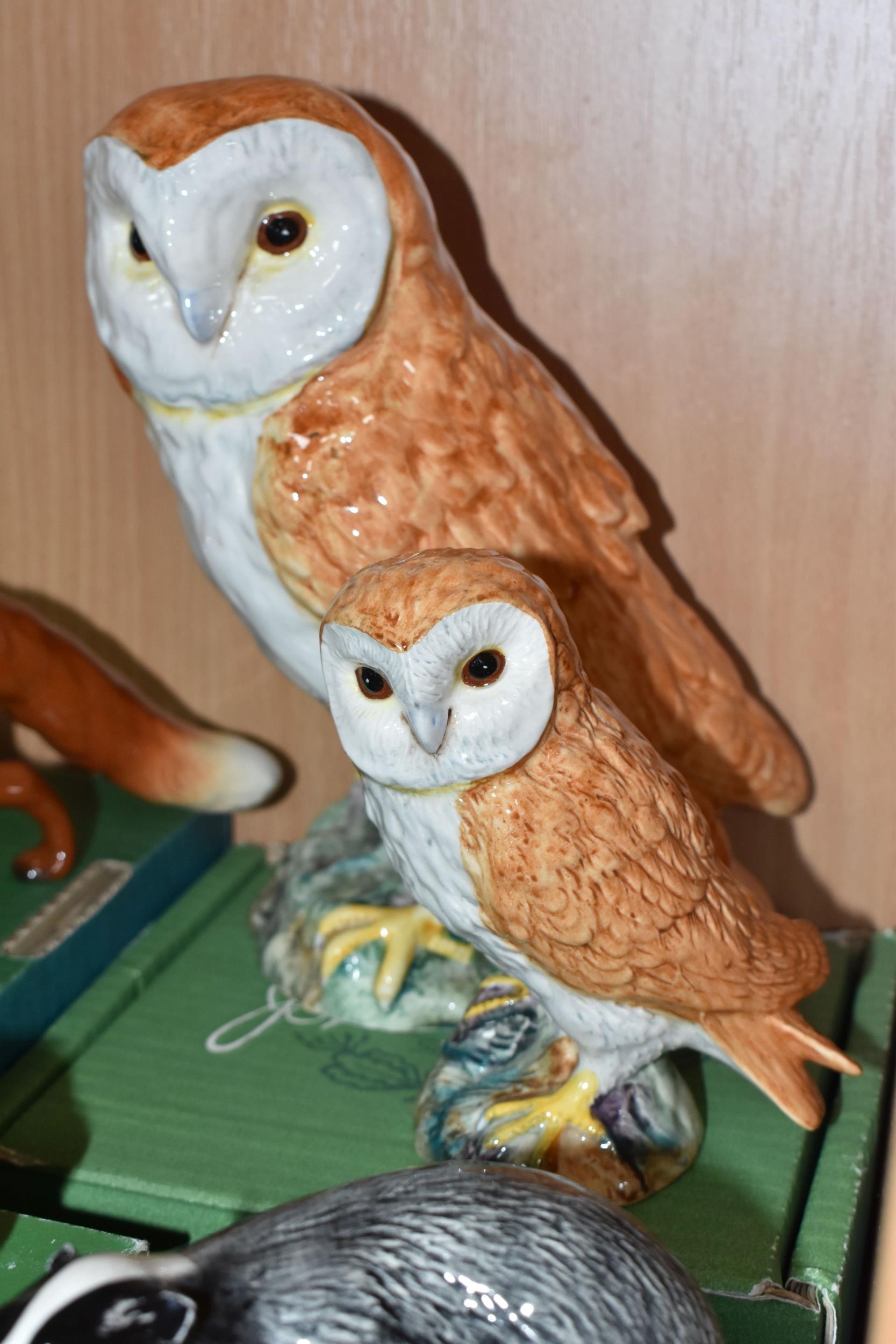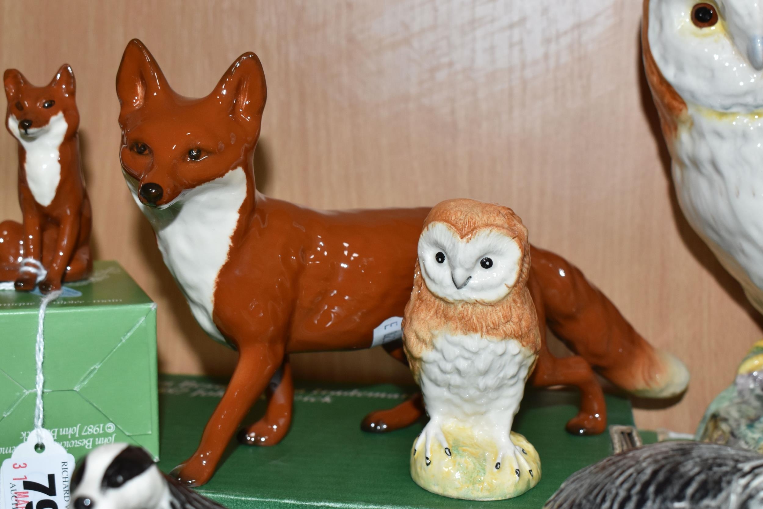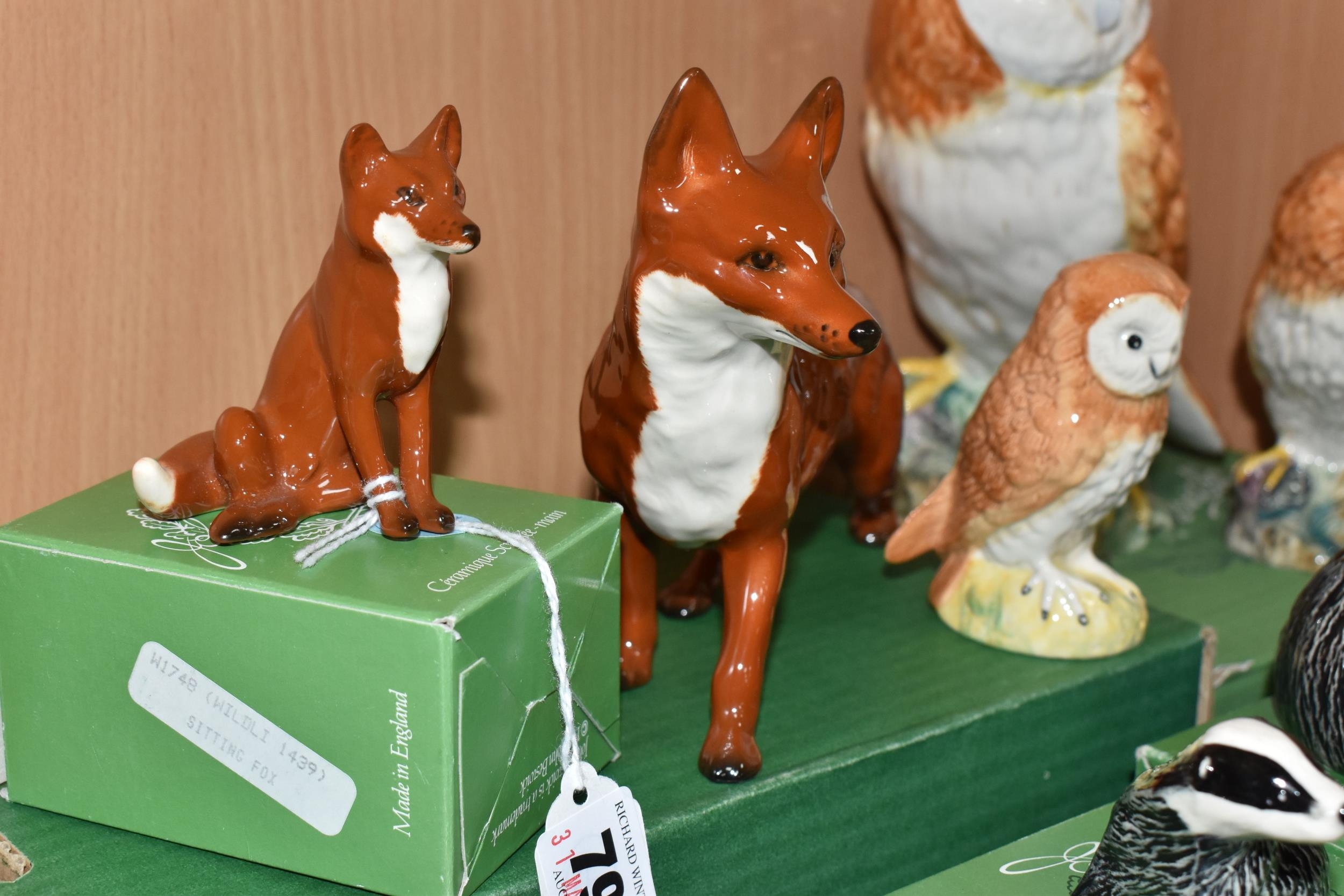 A GROUP OF BESWICK ANIMAL FIGURES, comprising a Barn Owl model no 1046B, second version, an Owl no 2026, a Barn Owl no 3273, with an unassociated box, a boxed Badger - Male no 3393, a boxed Badger - Female no 3394, a boxed Badger Cub no 3392, a boxed Fox - Seated no 1748, a boxed Fox - Standing no 1440 and a boxed Fox - Standing no 1016A (9 + 7 boxes) (Condition Report: figures appear in good condition, barn owl 1046B has a small shallow chip on the underside of the foot rim, male badger has a manufacturing fault behind his right ear, both his ears feel rough)