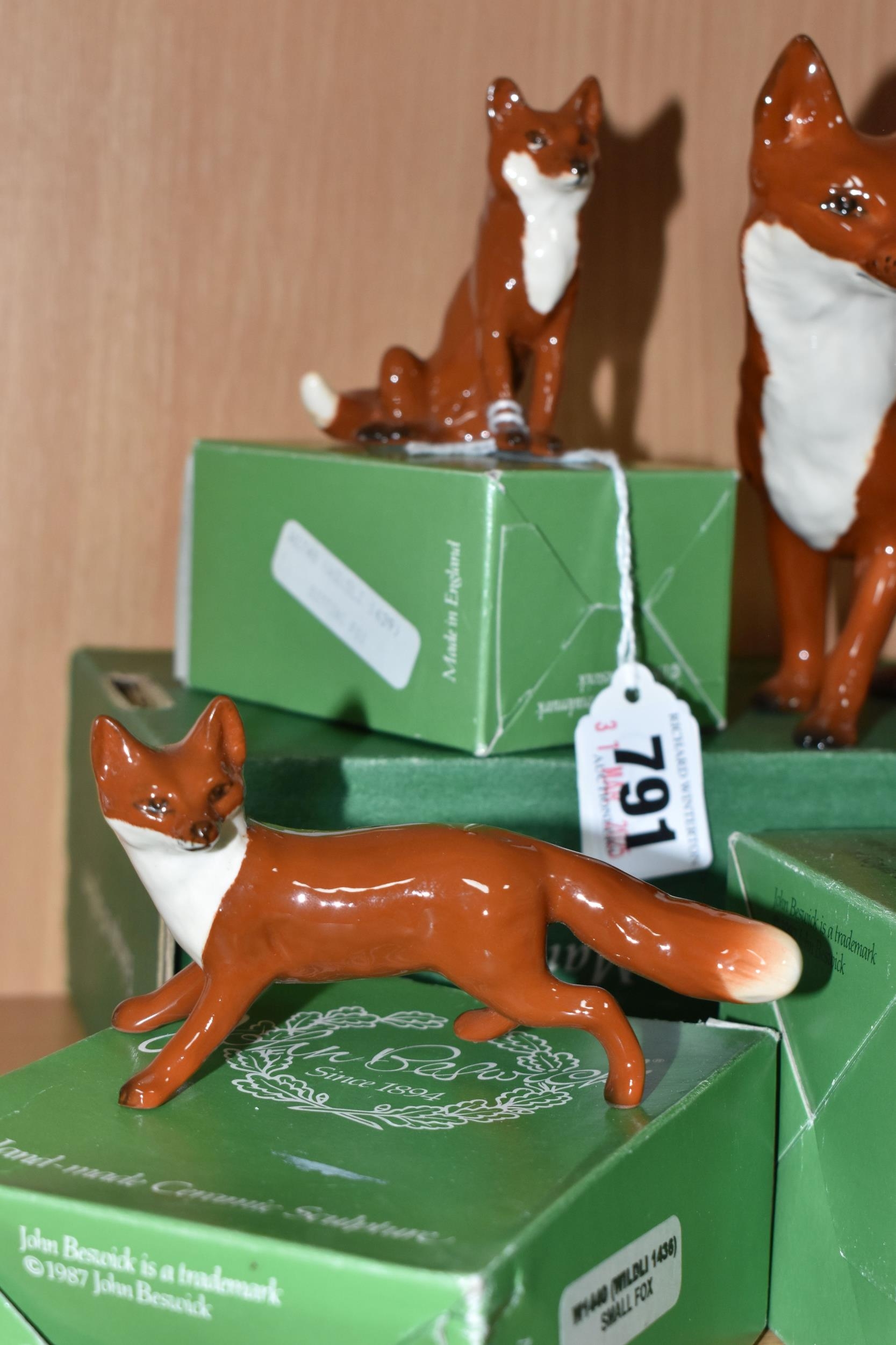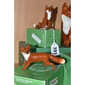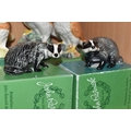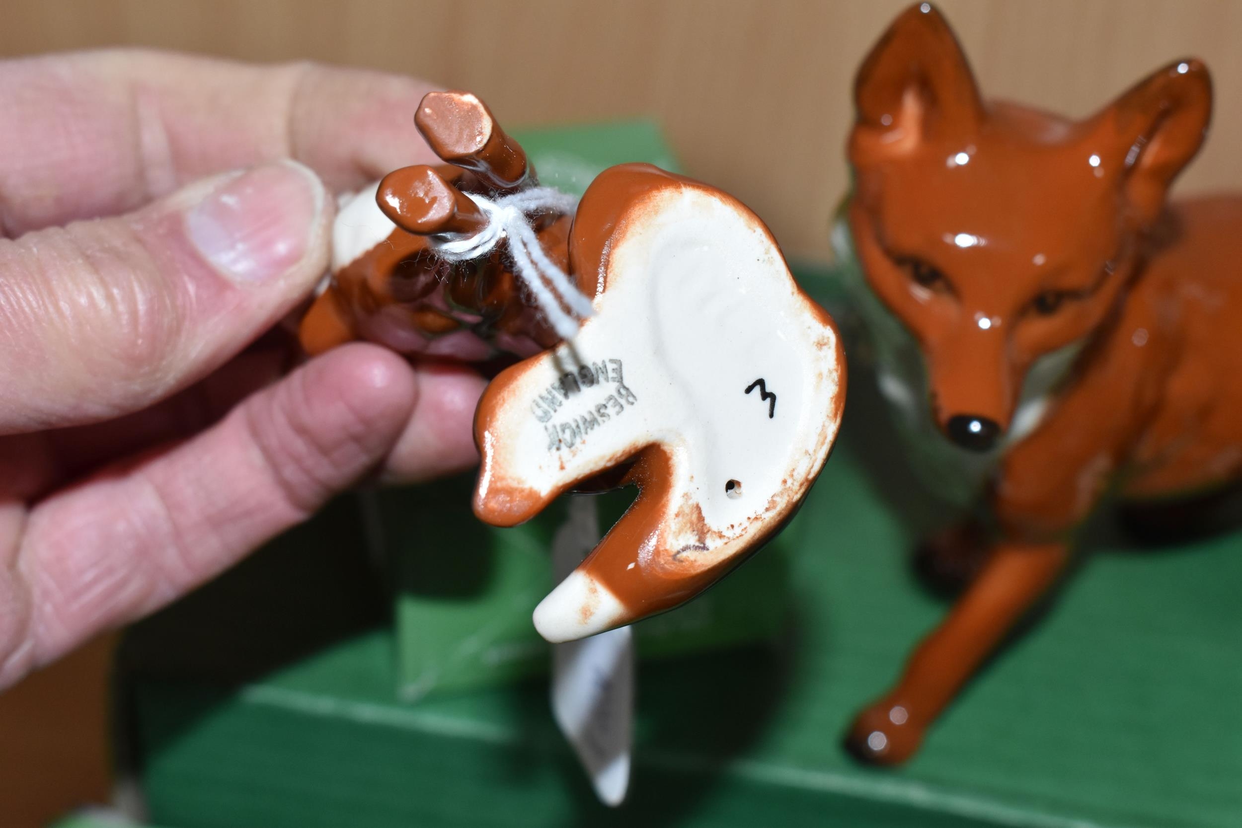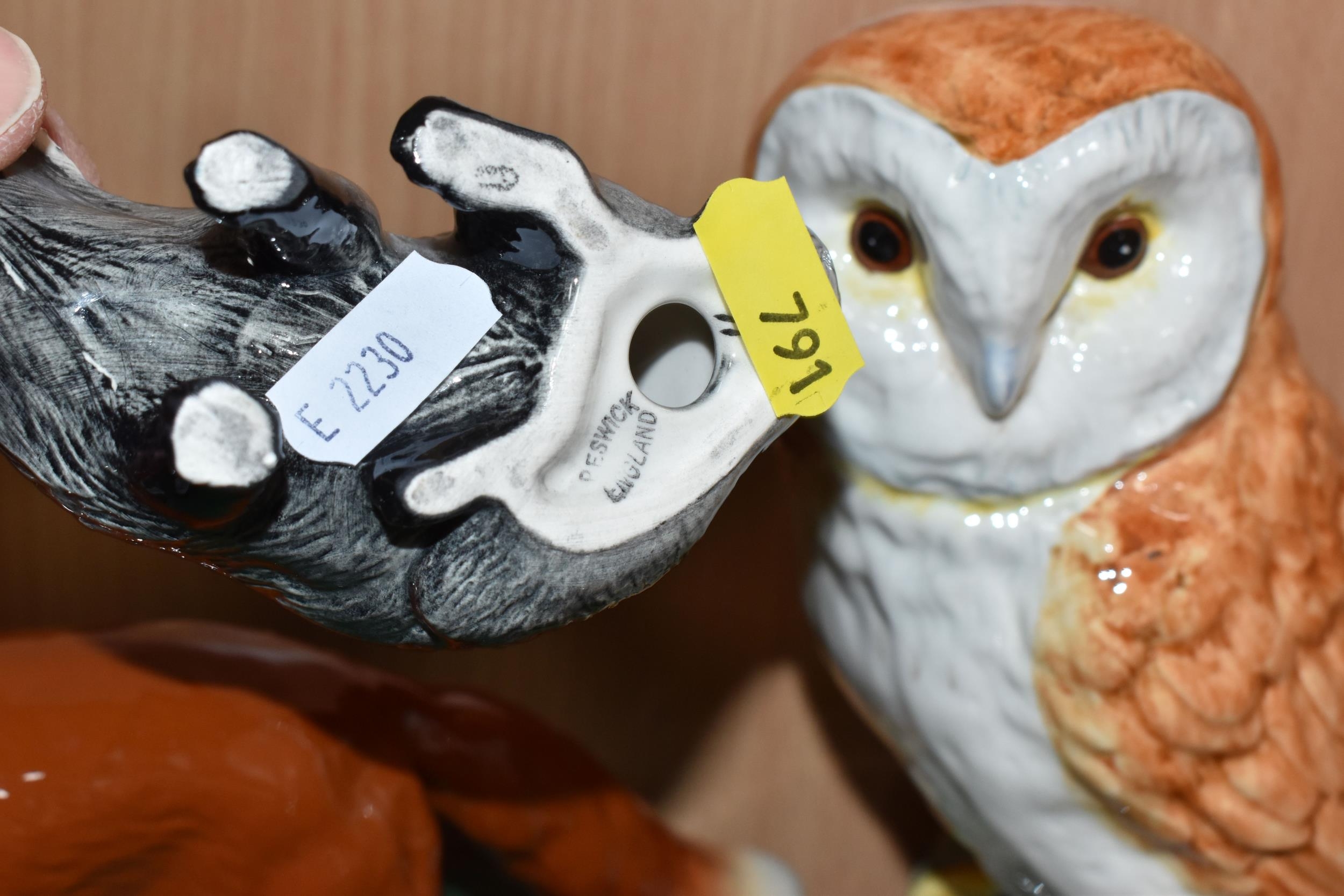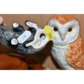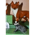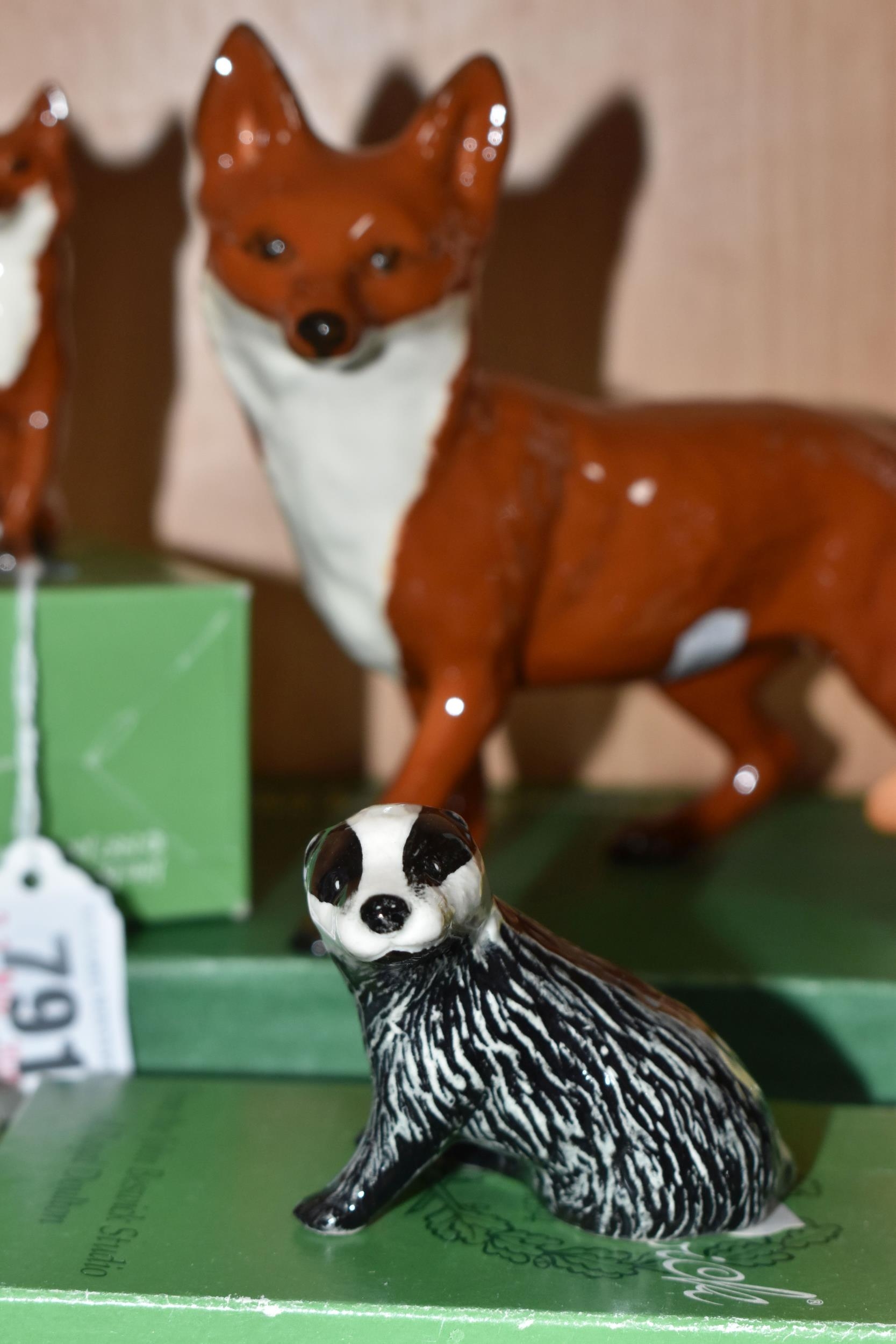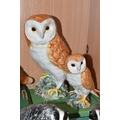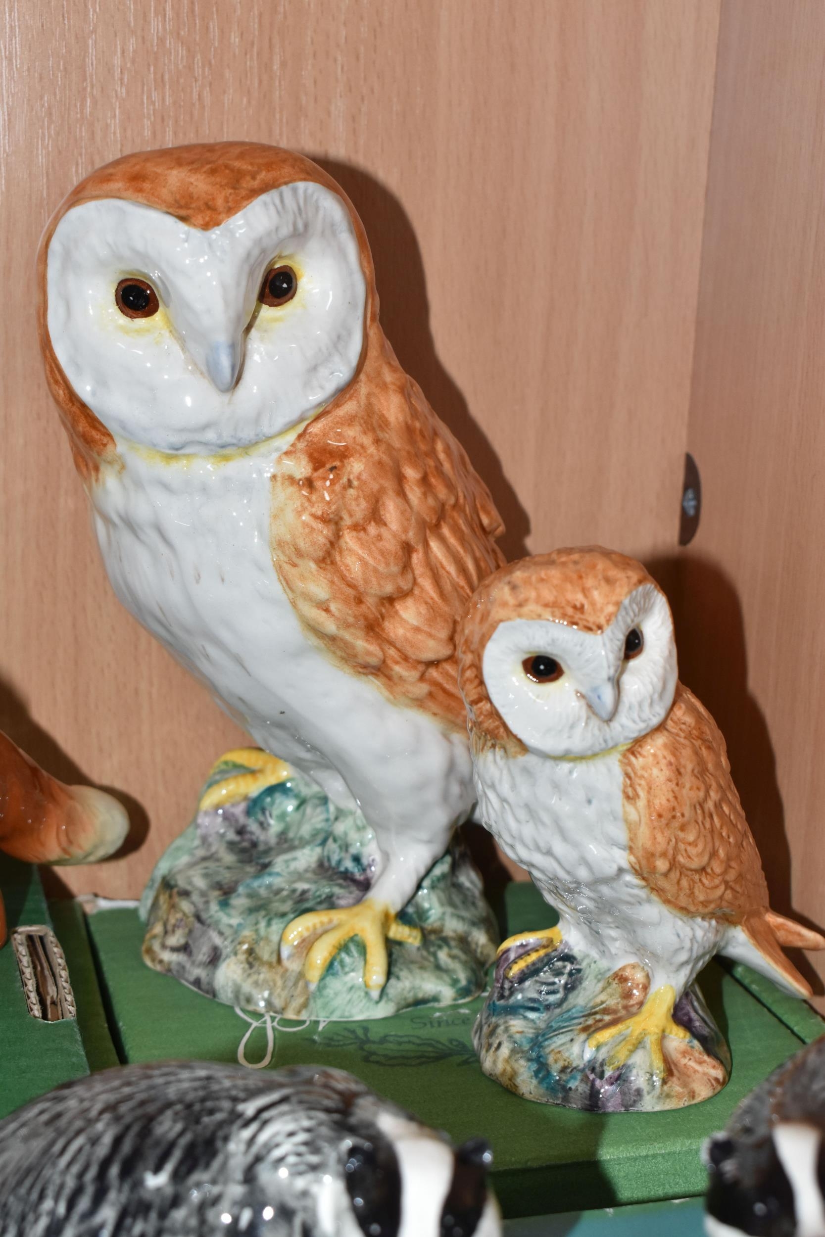 A GROUP OF BESWICK ANIMAL FIGURES, comprising a Barn Owl model no 1046B, second version, an Owl no 2026, a Barn Owl no 3273, with an unassociated box, a boxed Badger - Male no 3393, a boxed Badger - Female no 3394, a boxed Badger Cub no 3392, a boxed Fox - Seated no 1748, a boxed Fox - Standing no 1440 and a boxed Fox - Standing no 1016A (9 + 7 boxes) (Condition Report: figures appear in good condition, barn owl 1046B has a small shallow chip on the underside of the foot rim, male badger has a manufacturing fault behind his right ear, both his ears feel rough)