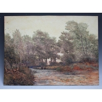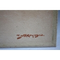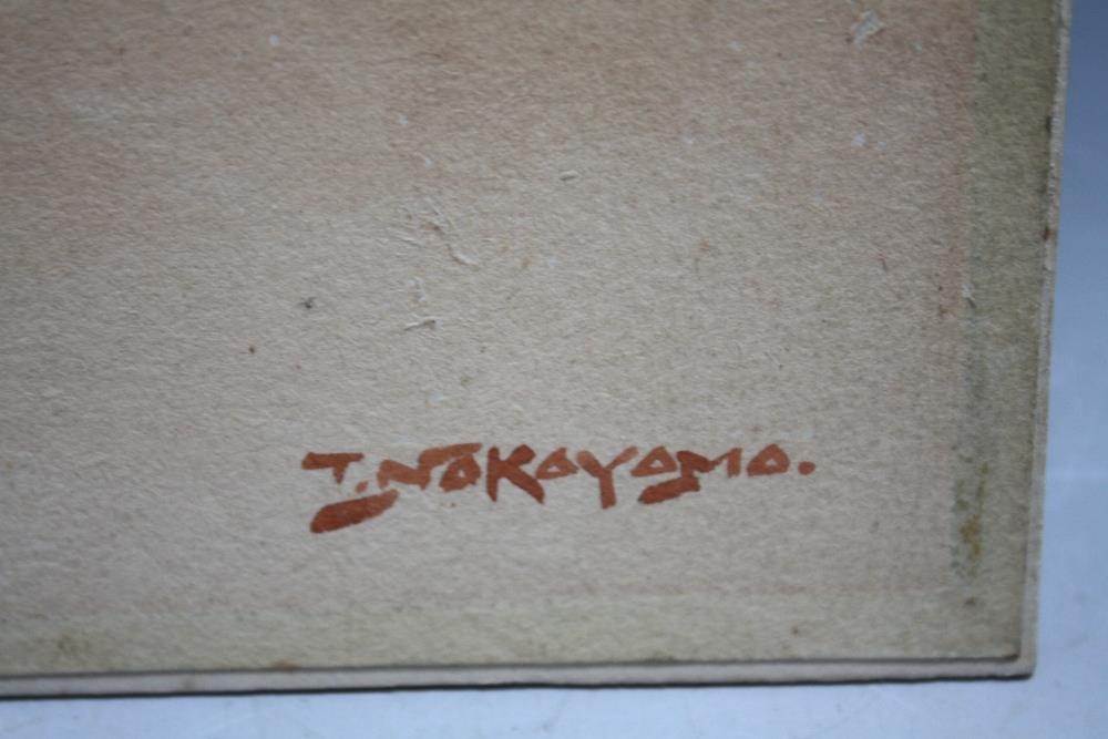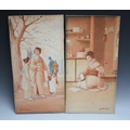 T. NAKAYAMA (XX). Japanese school, a pair of interior scenes with Geisha playing a stringed instrument and figures in a wooded setting, signed lower left and right, watercolours, unframed, 33 x 17 cm