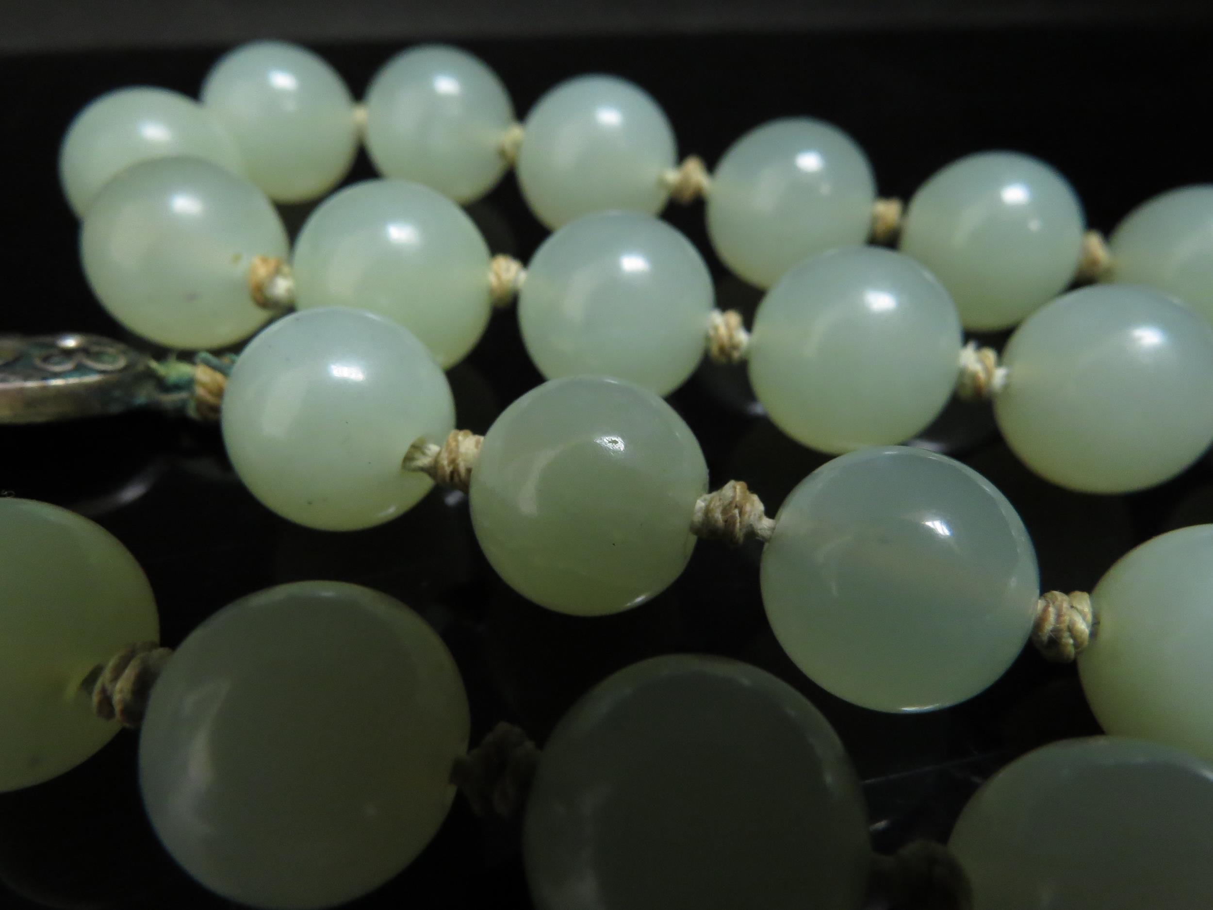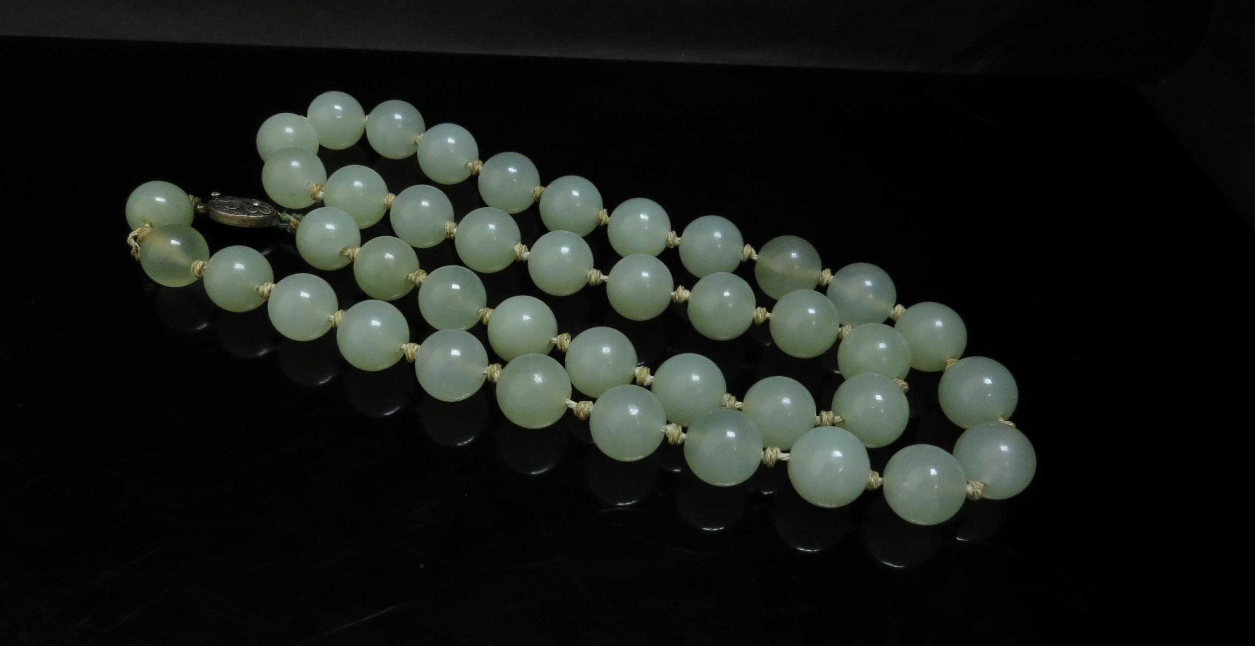 A Jade necklace with silver clasp, 14mm beads, 65cm long, 138g (R) £50
