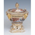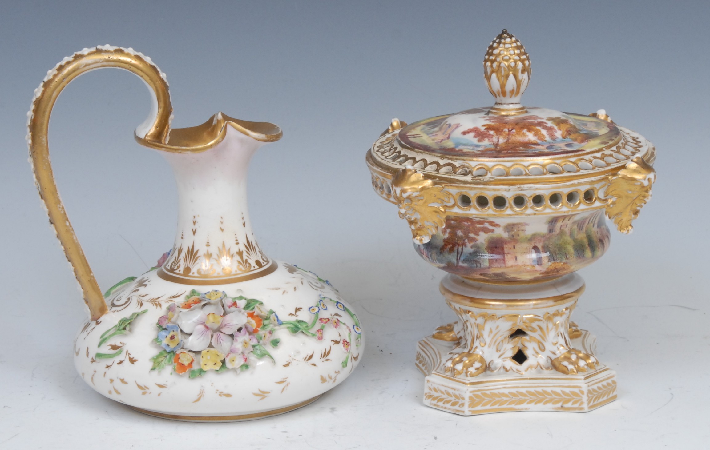 A Derby pot pourri and cover, painted with figures and ruins in a Picturesque landscape, pine cone finial, lion paw feet, canted incurved base, 16cm high, red mark, c.1820; a Bloor Derby compressed ewer, encrusted with flowers and decorated in gilt, 14.5cm high, red crowned D mark, c.1830 (2)