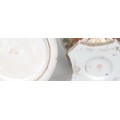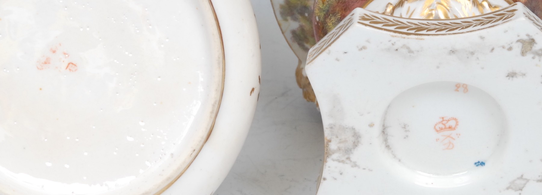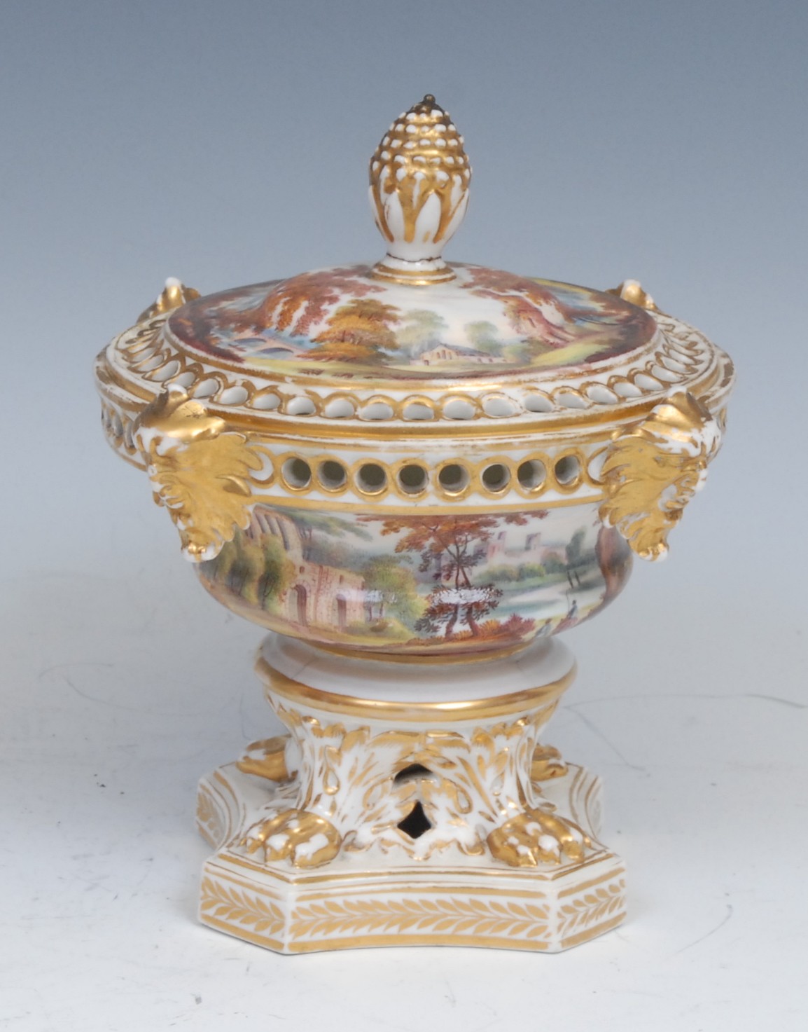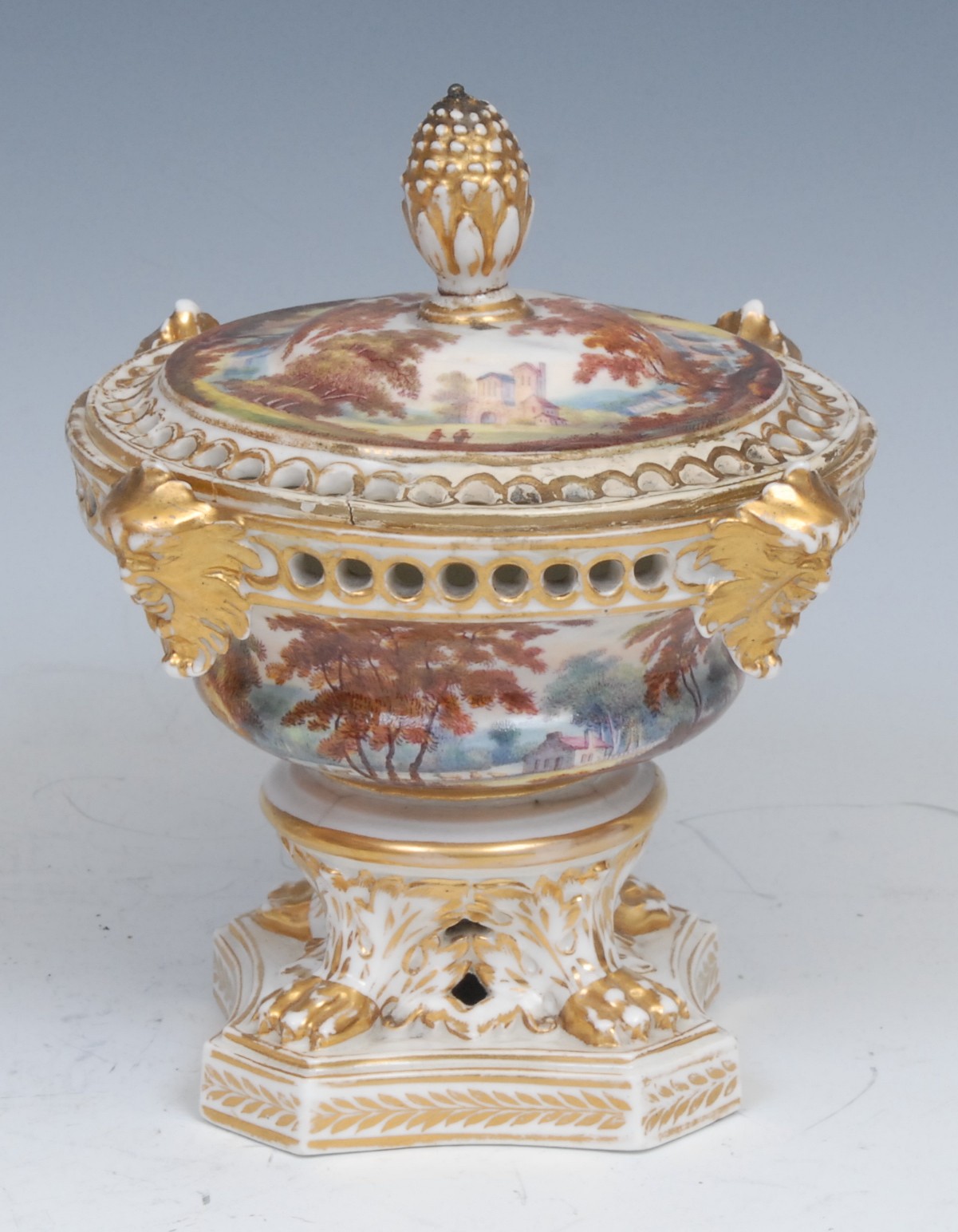 The pot purri lid has major restoration, on punched hole frame, lacking gilding, lid topple has been repaired, showing dark line of where the breakage was. Two hairlines present on lid too.