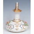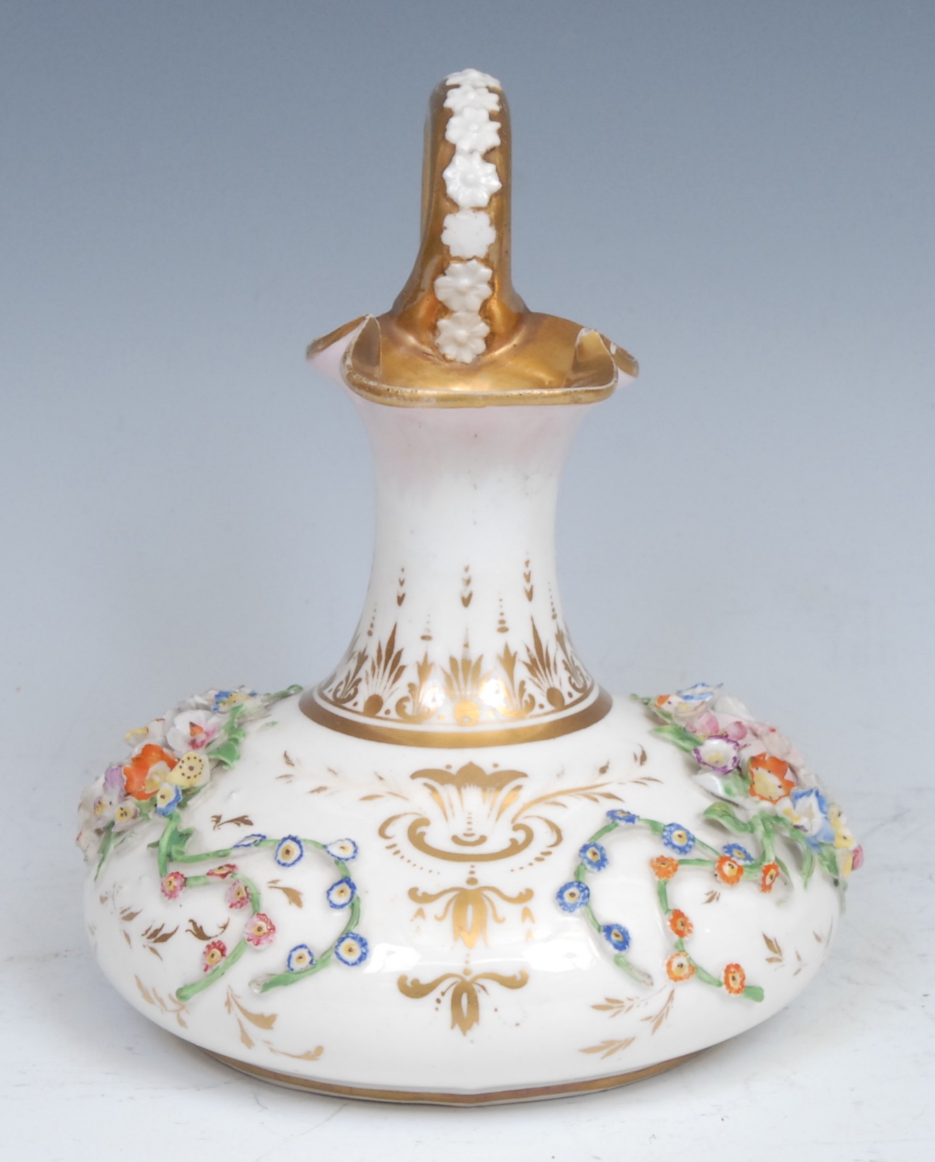 The compressed ewer has a border of worn gilding and chip to pinched lip, handle over gilded as well as lacking gilding, he flower missing, a few chipped.The whole body has minor crazing, worm gilded detail and chip flowers to body.