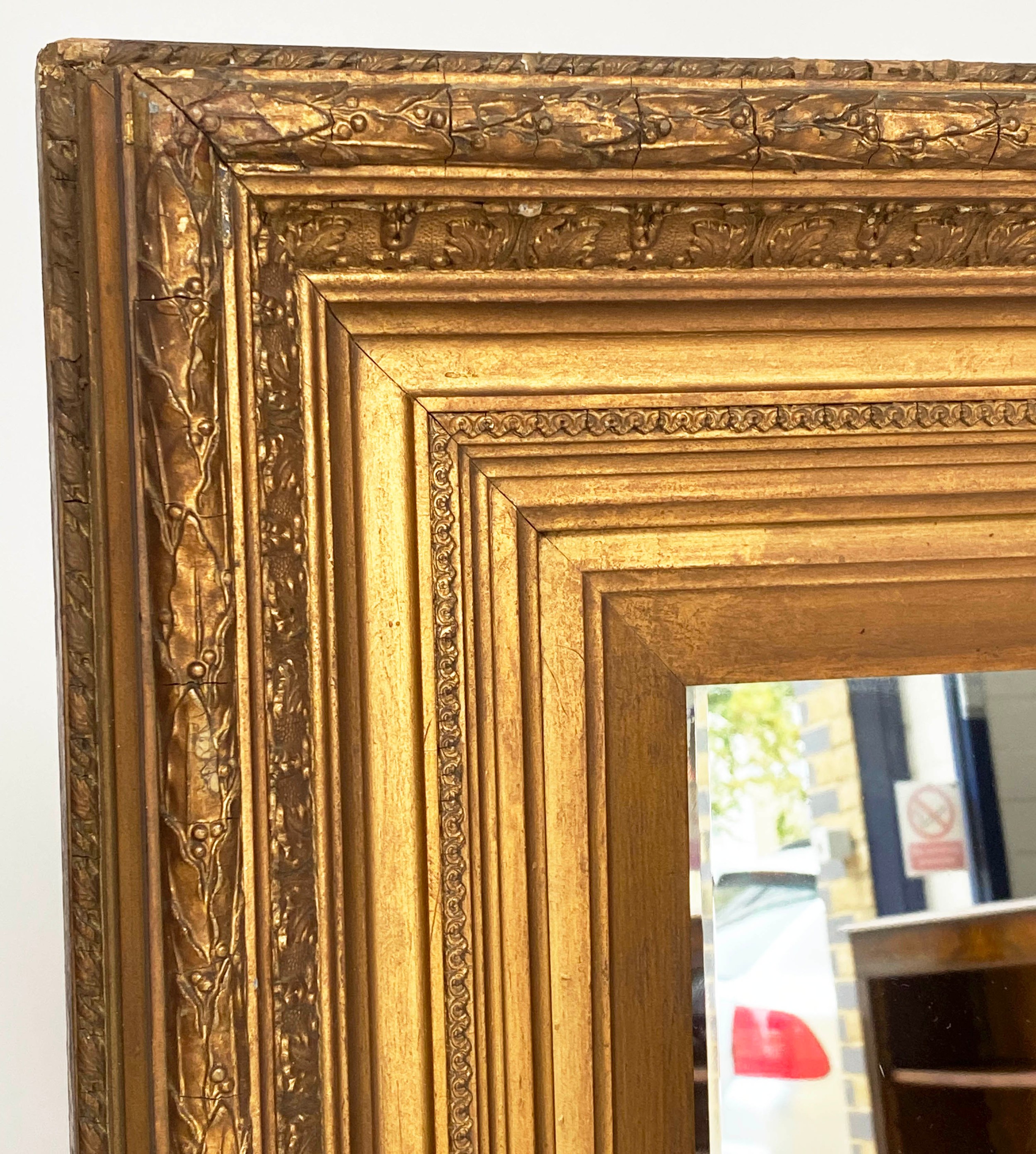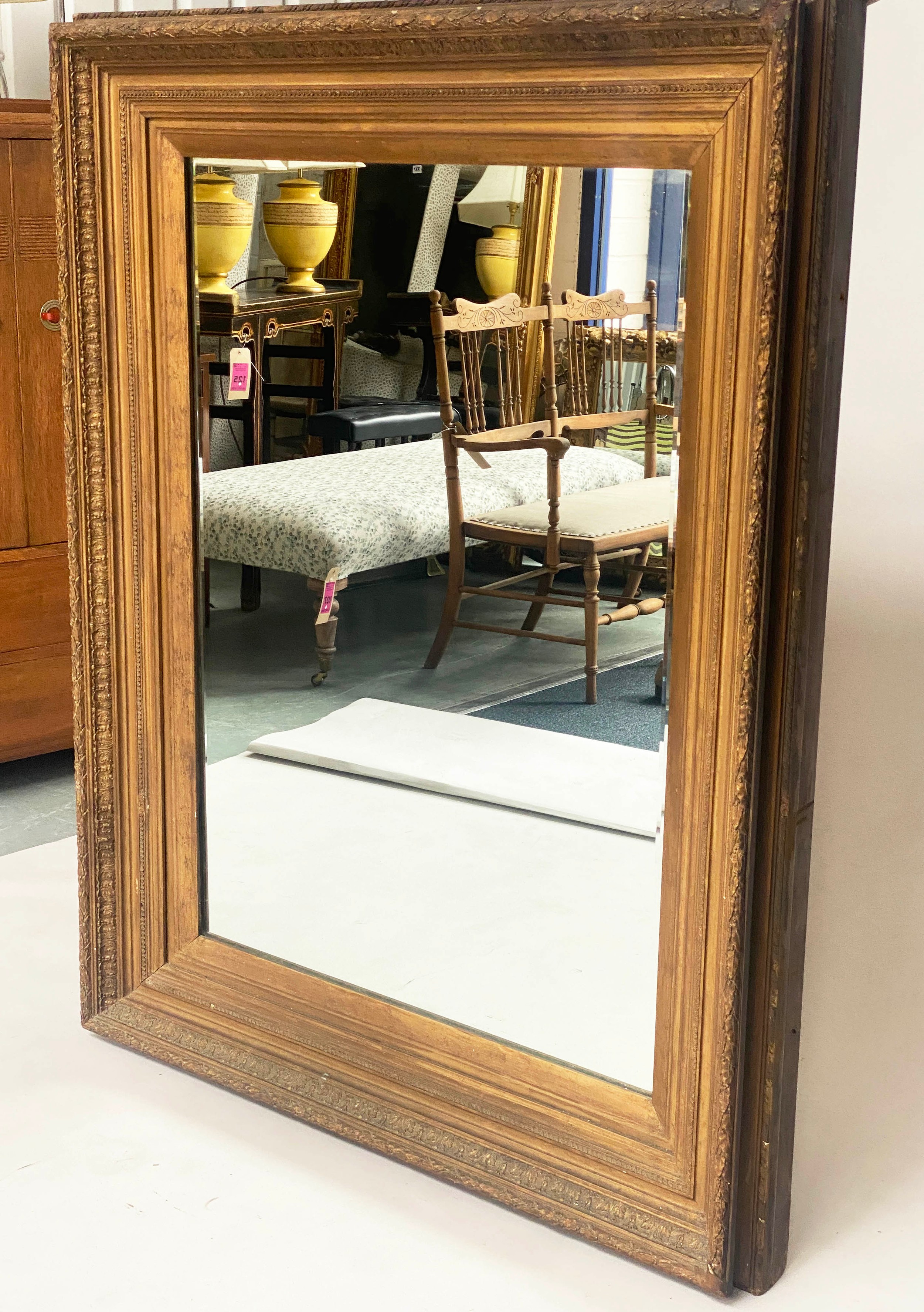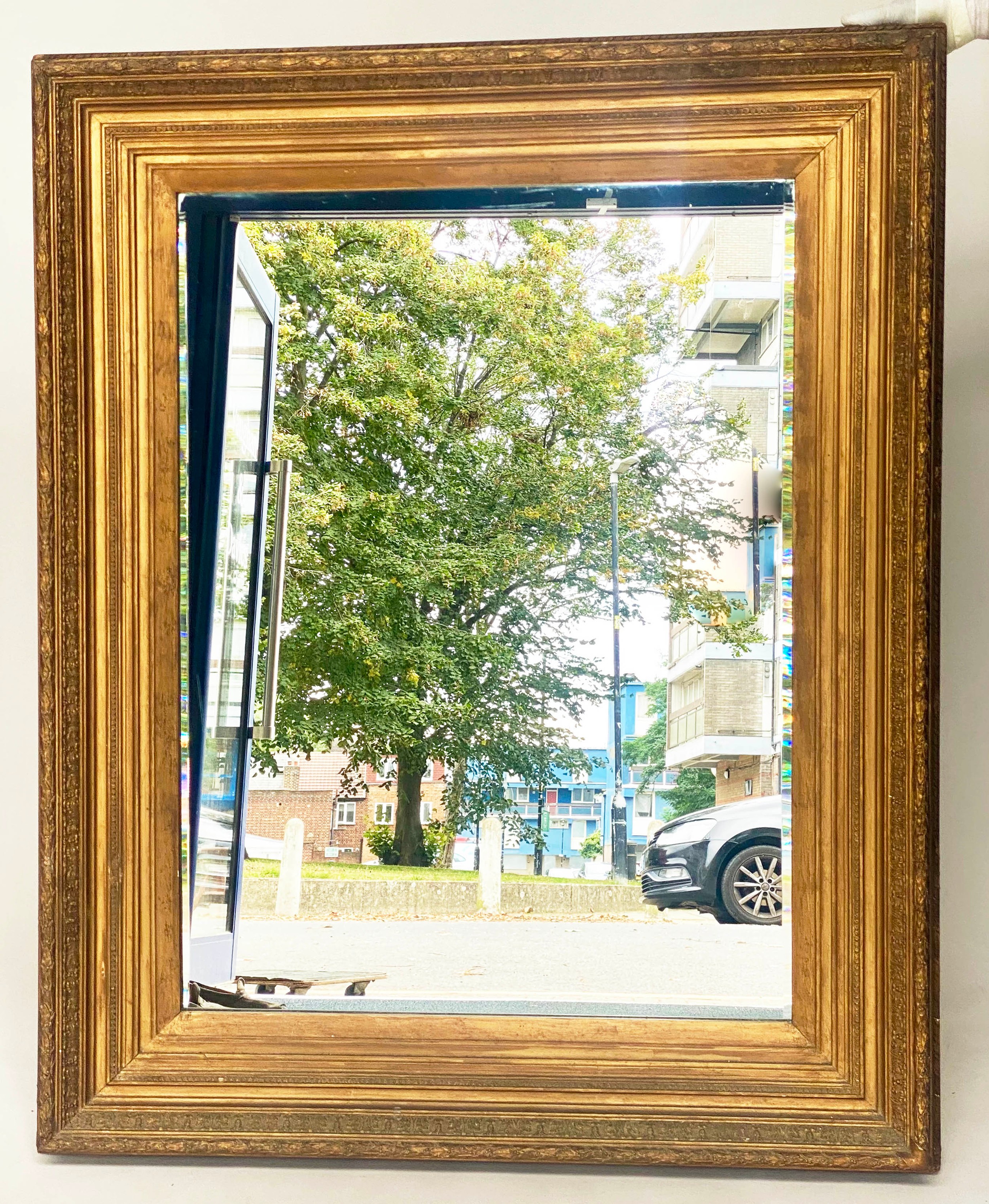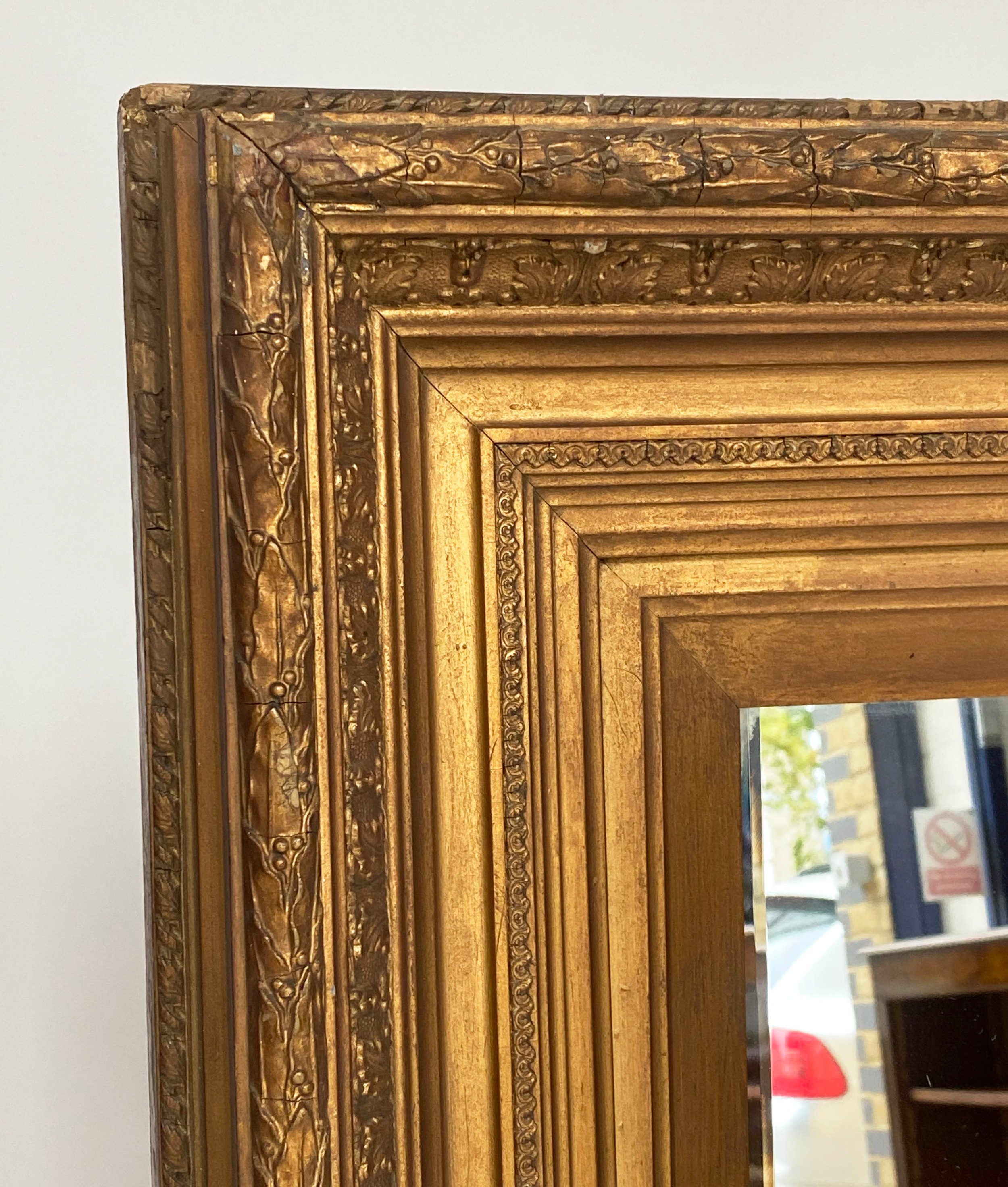 WALL MIRROR, 19th century giltwood and gesso rectangular moulded and decorated frame enclosing bevelled mirror plate, 106cm x 133cm.